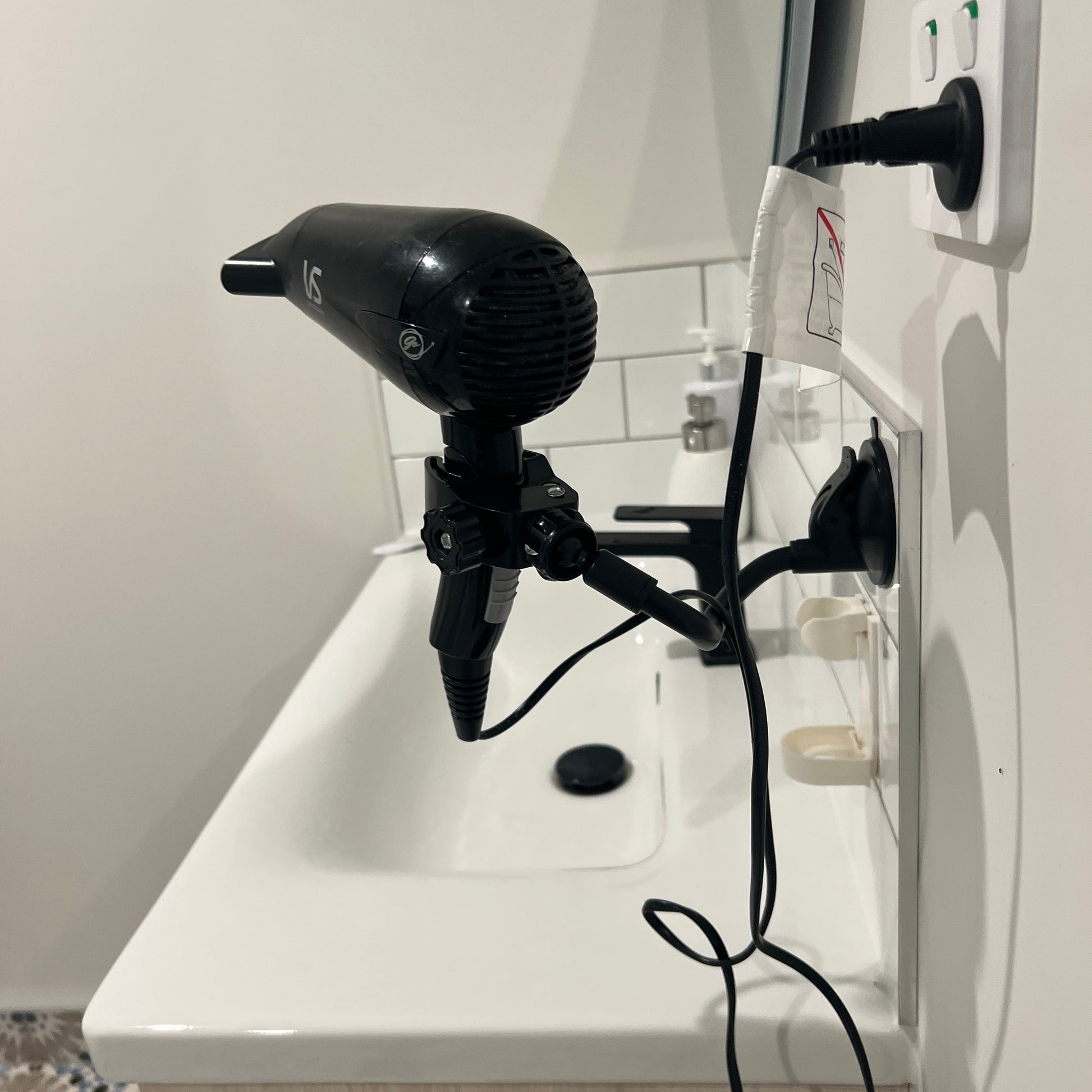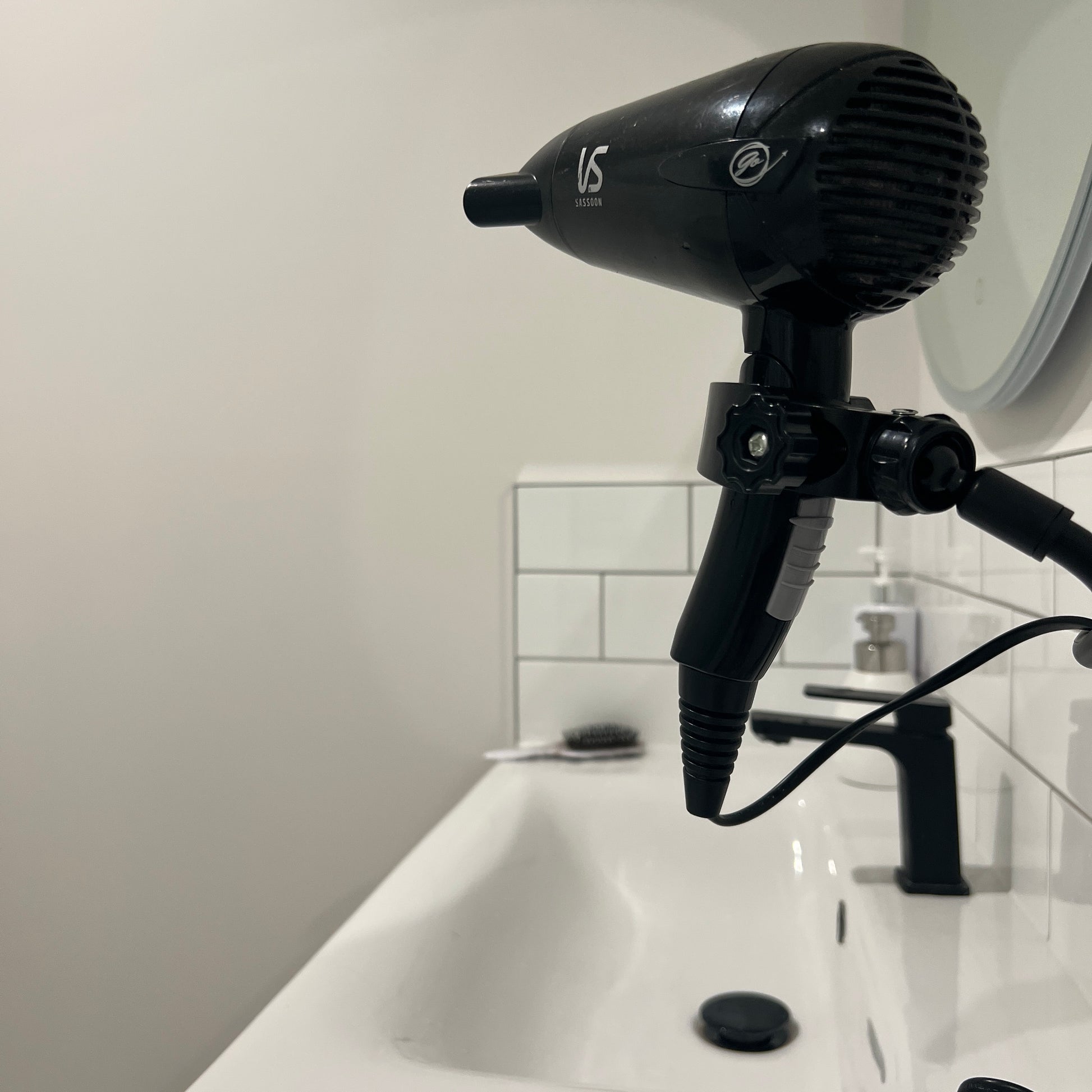 A clamp for your hairdryer so that you have more free hands to sort your hair, without also trying to navigate having to hold your hair dryer — an extra set of hands!
