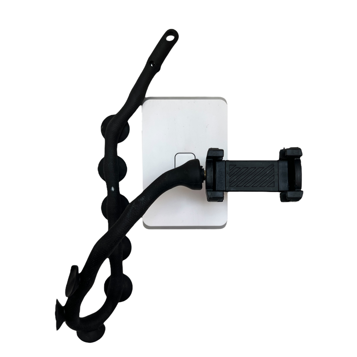 A phone holder that you can attach to anything you would like to. Wrap it around a pole, stick it to the wall, hang it off the side of your bed rail, or side table.
