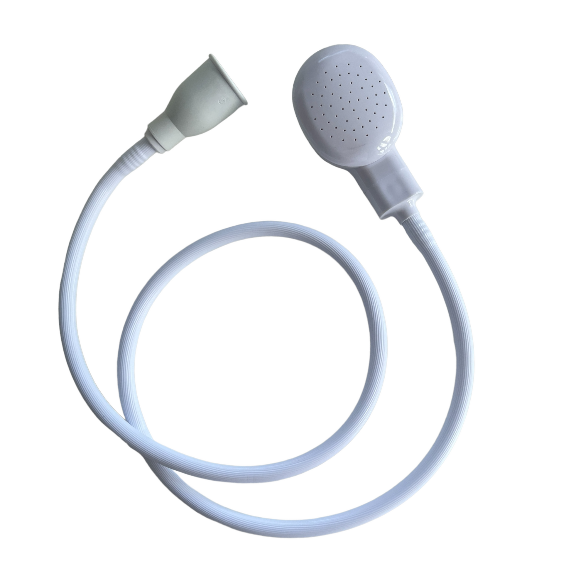 Image Description: A white, flexible shower extension hose with a rubber tap connector on one end and a soft spray shower head on the other. The hose is shown both stretched out and coiled to demonstrate flexibility. Designed to be attached to a tap to provide gentle water flow anywhere it’s needed.