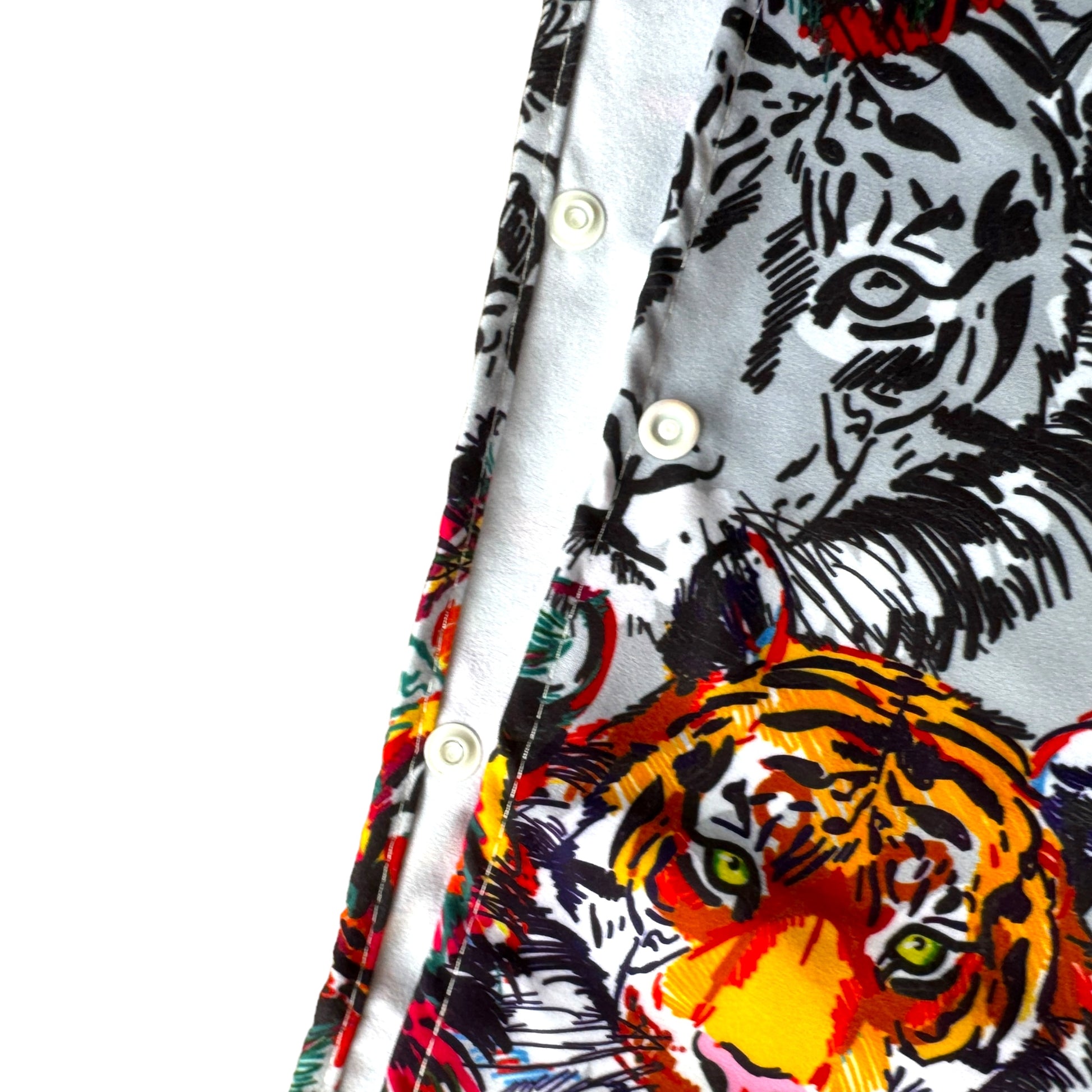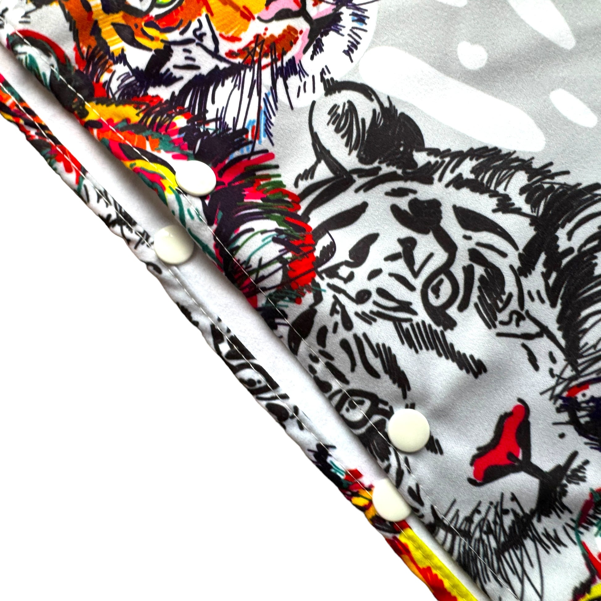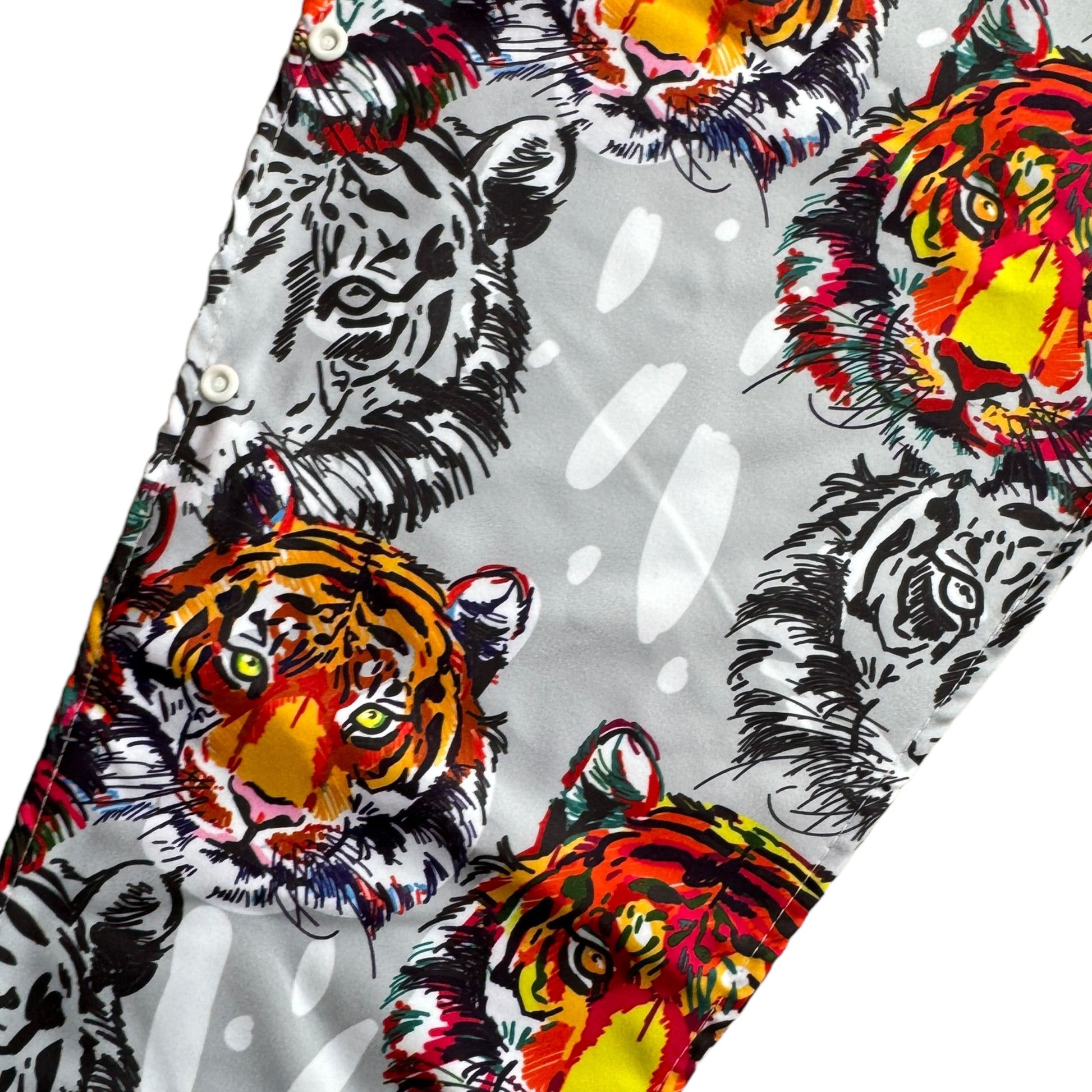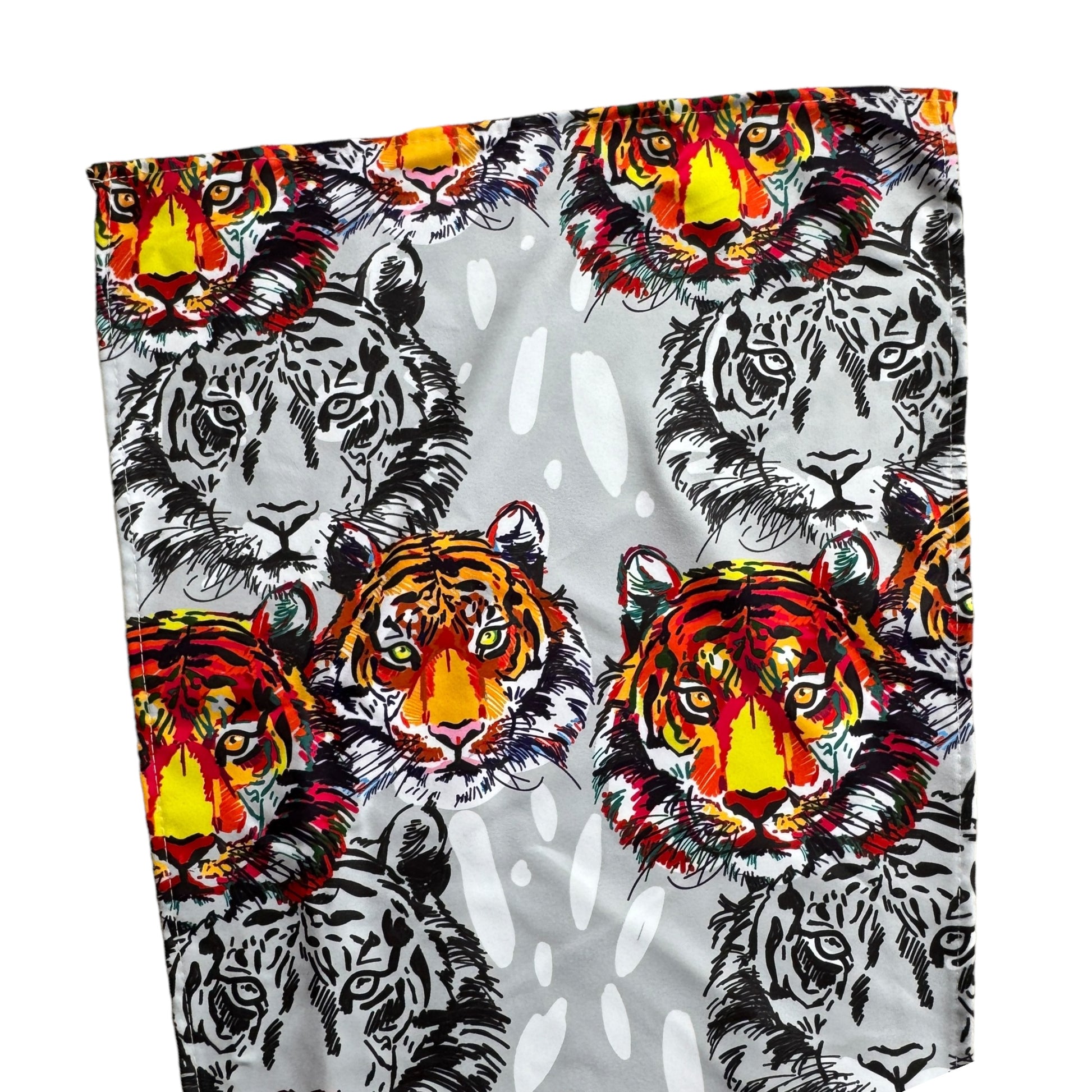 Image Description: This material features a repeated tiger face print in black and white with tigers in bright burnt orange and yellow as features in the print. The background is a light grey with added white splotches.