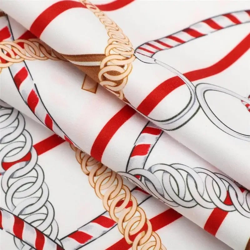 Image Description: A nautical themed material with depicted red and white striped rope, gold coil chain and leather straps. Set is on a white background with added red stripes. It is a fun and statement piece.