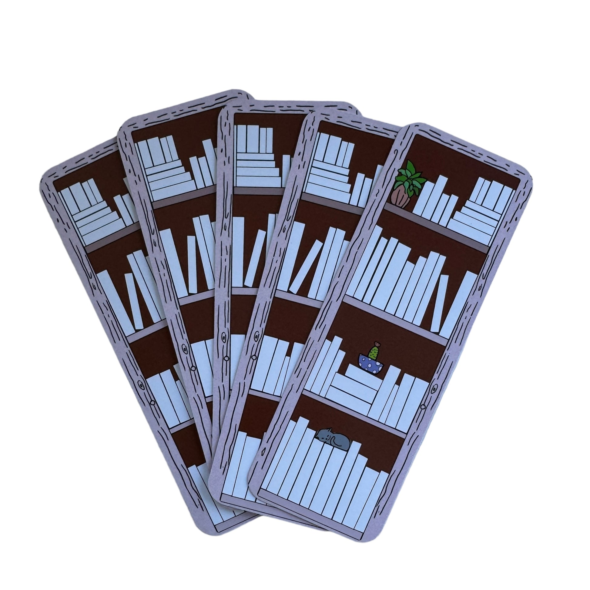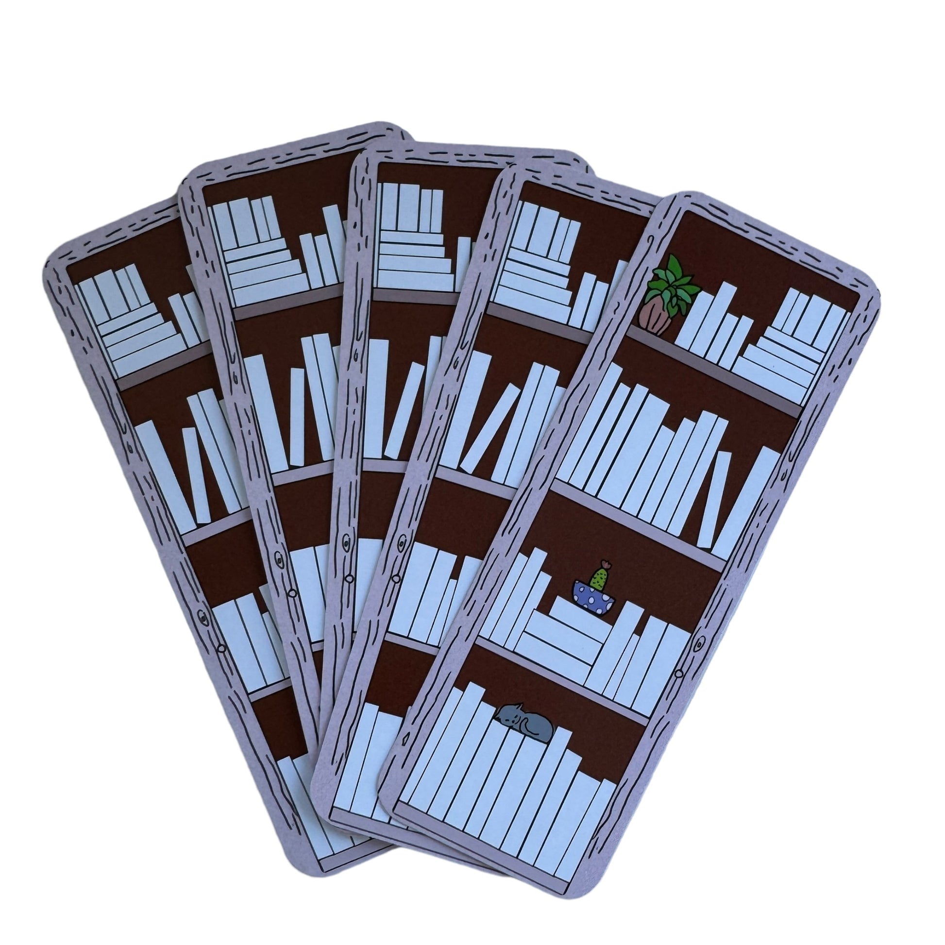 Image Description: The bookmark shows a wooden bookshelf with blank shaped books on three shelves. The top shelf has a potted plant, the middle shelf has a small cactus in a pot, and the bottom shelf features a sleeping cat among the books. The books can be written and filled in with the books you have read.