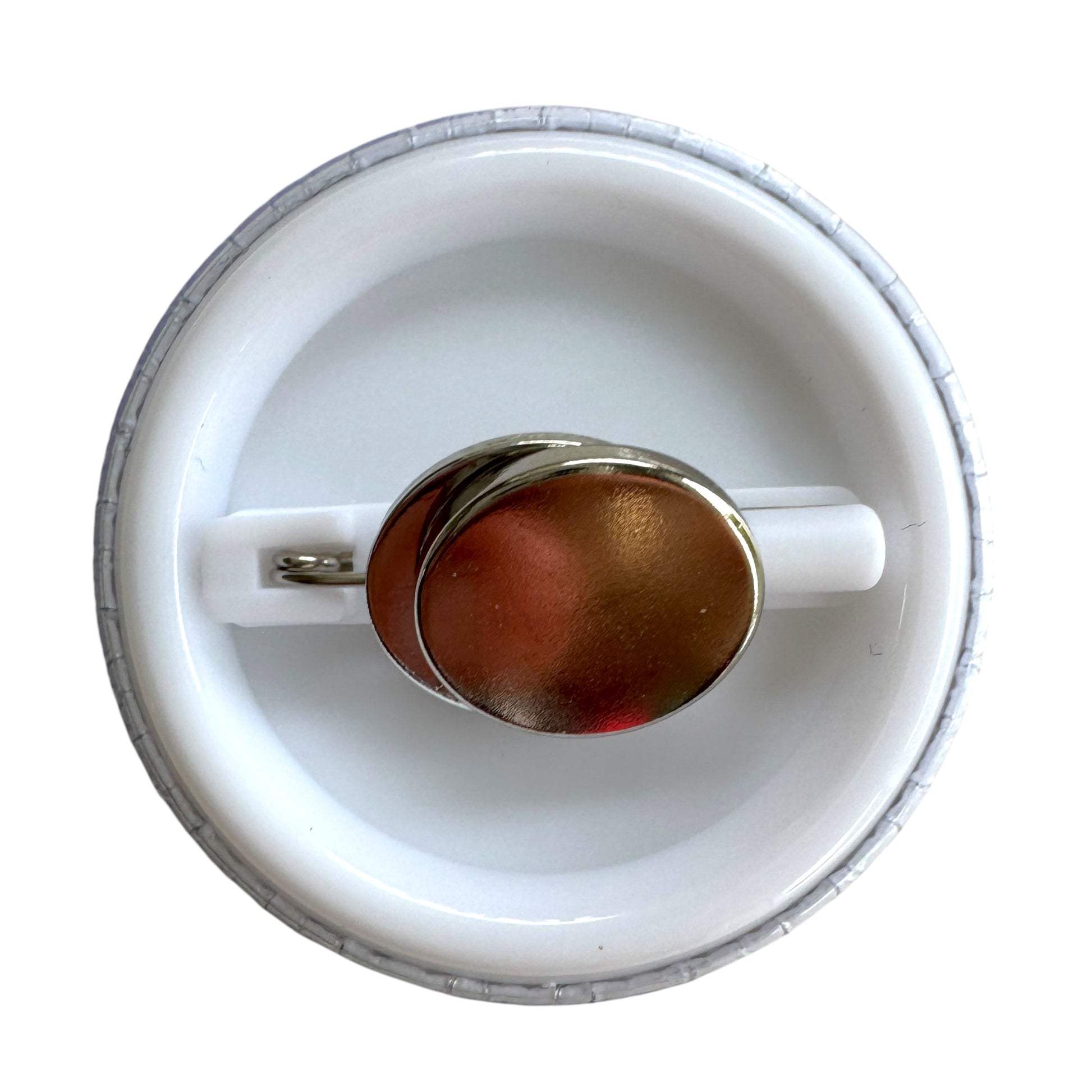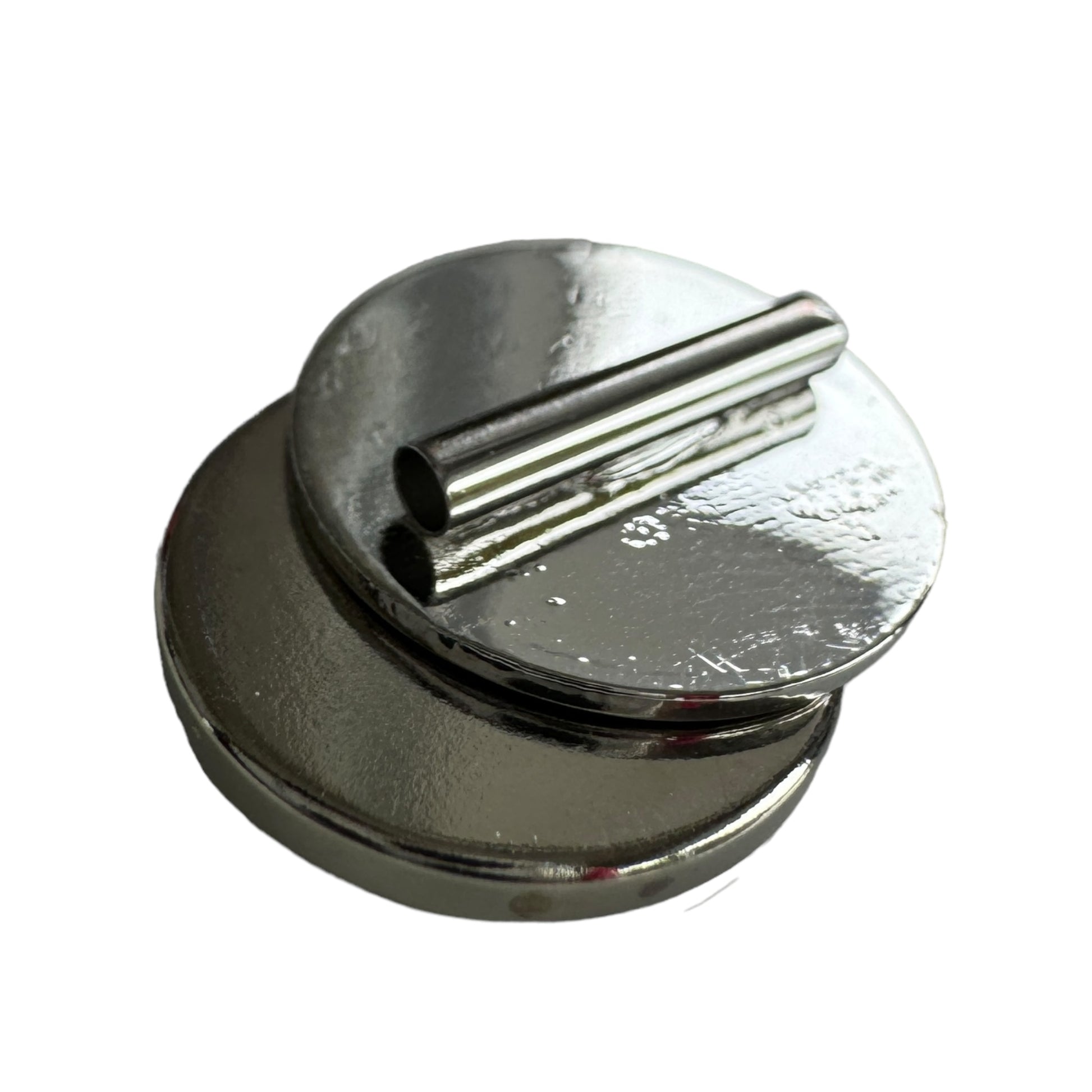 Image Description: Metal magnetic pin accessory. Is circular with a thin tube welded to the back. You can thread the button badge pin through this tube, and close the pin once it’s on. On the other side of this, is magnetic and will magnetise to the second disc. Place your shirt, or other items between these two discs, now your pin is magnetic, so you protect your clothes. Photos as above show this process in some pictures.