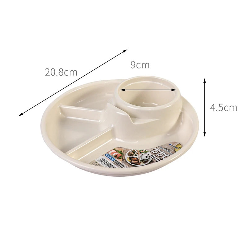 Image Description: A lightweight, rectangular divided plate with three food compartments and a round centre slot designed to hold a cup, can, or small bowl. The plate is shown in bright colours and is made of durable plastic, suitable for both kids and adults.