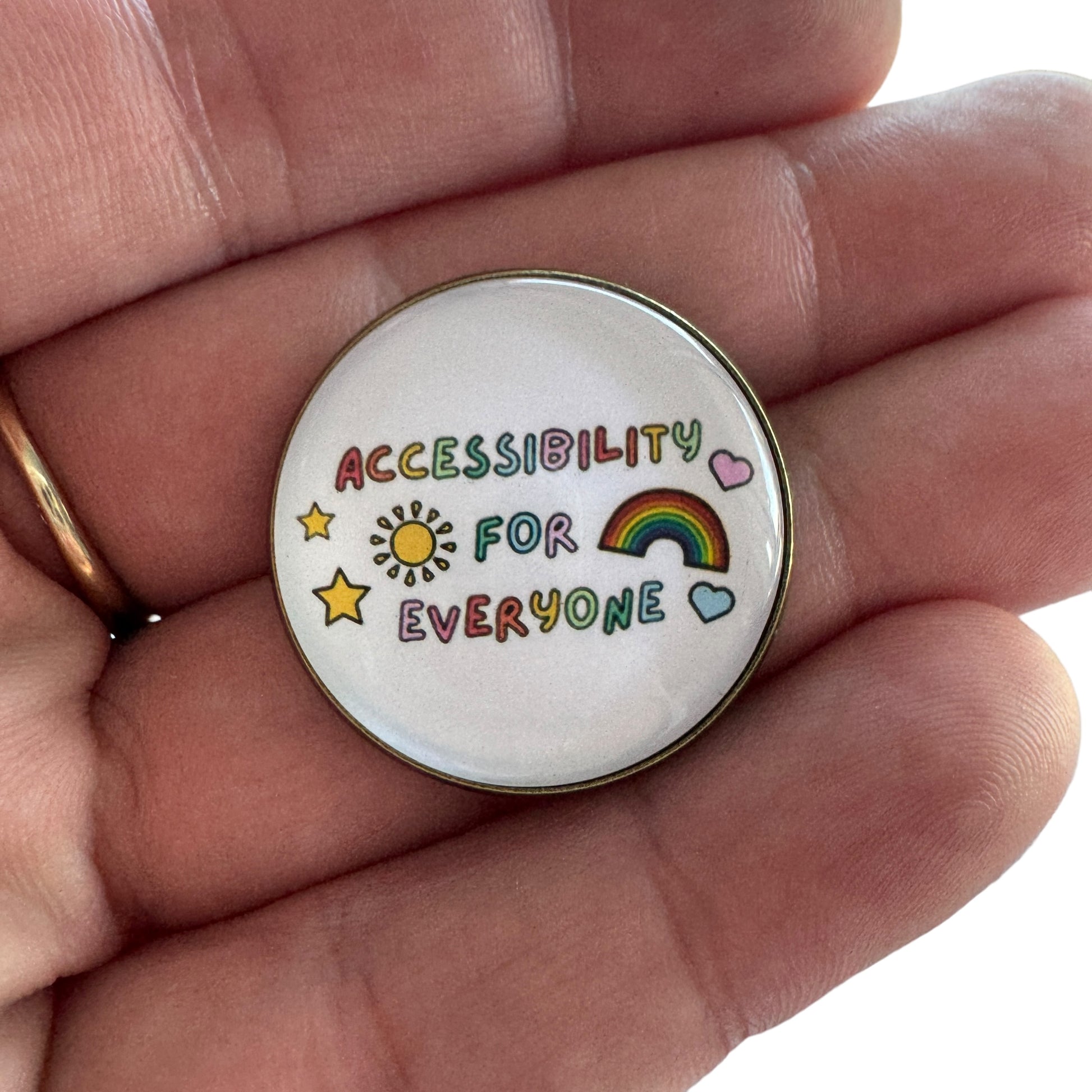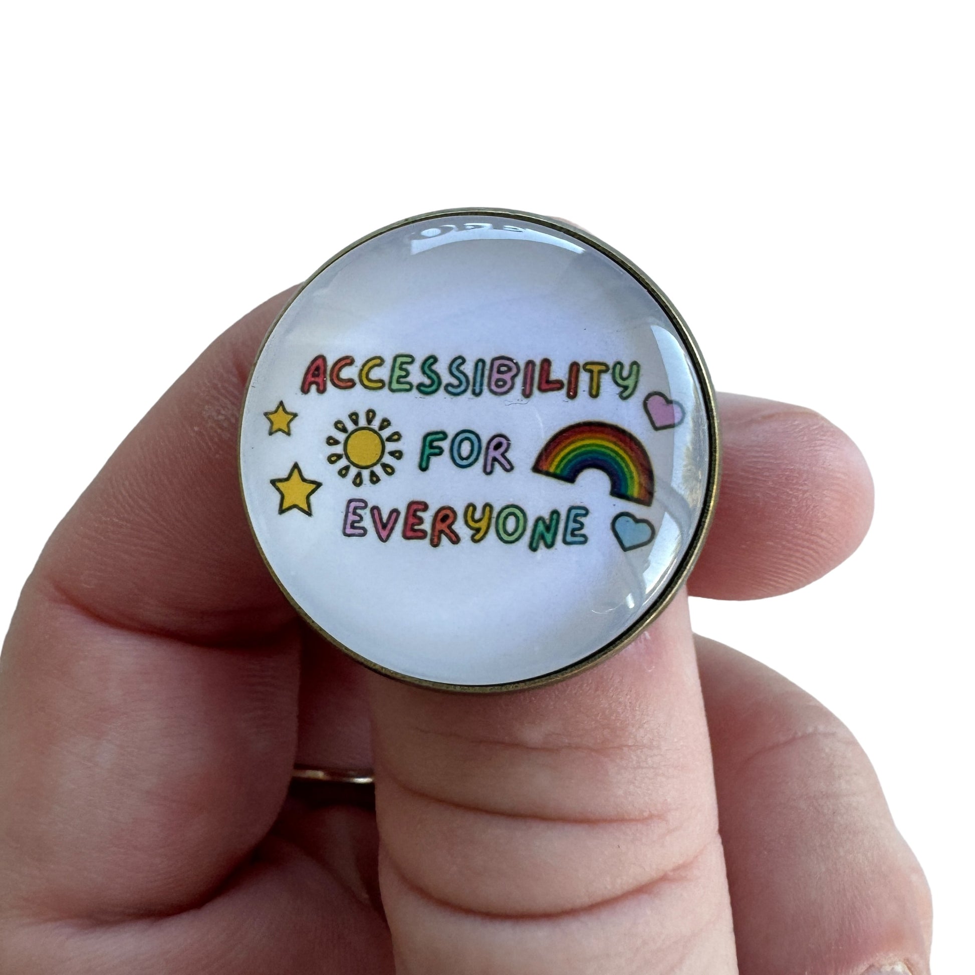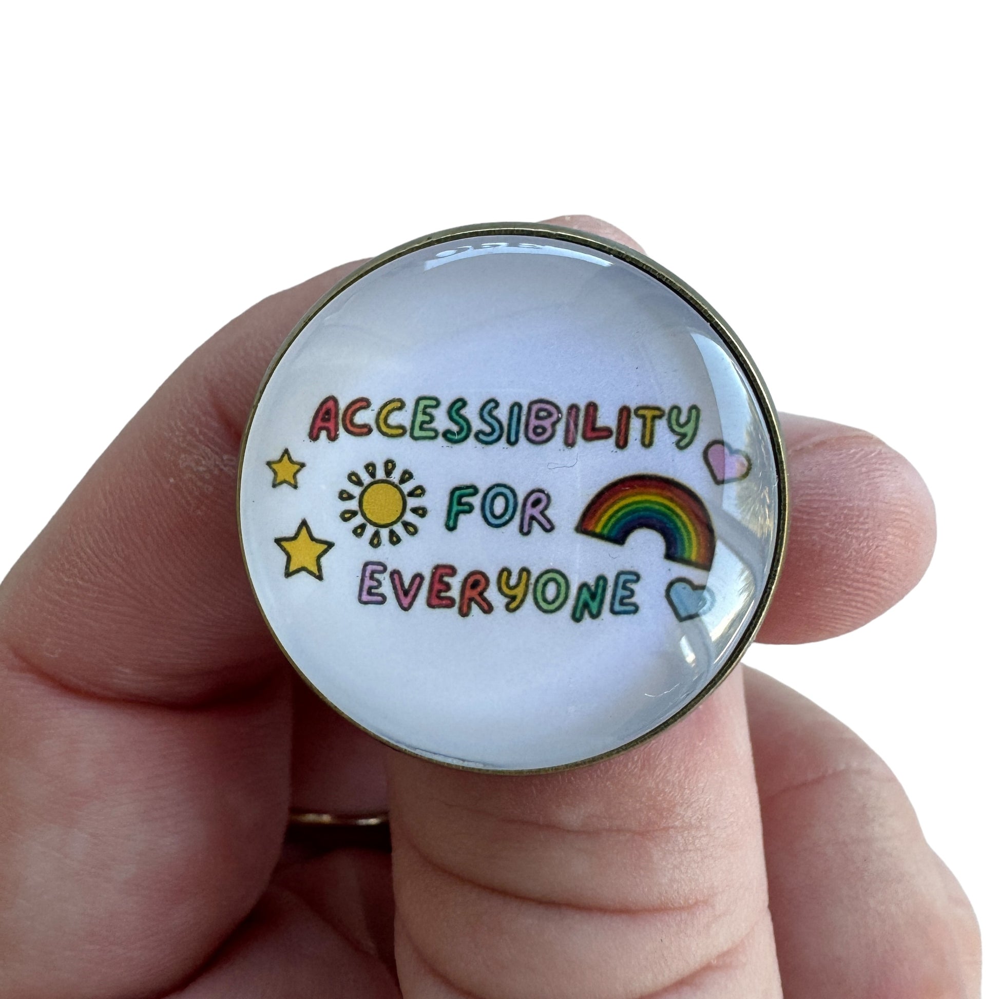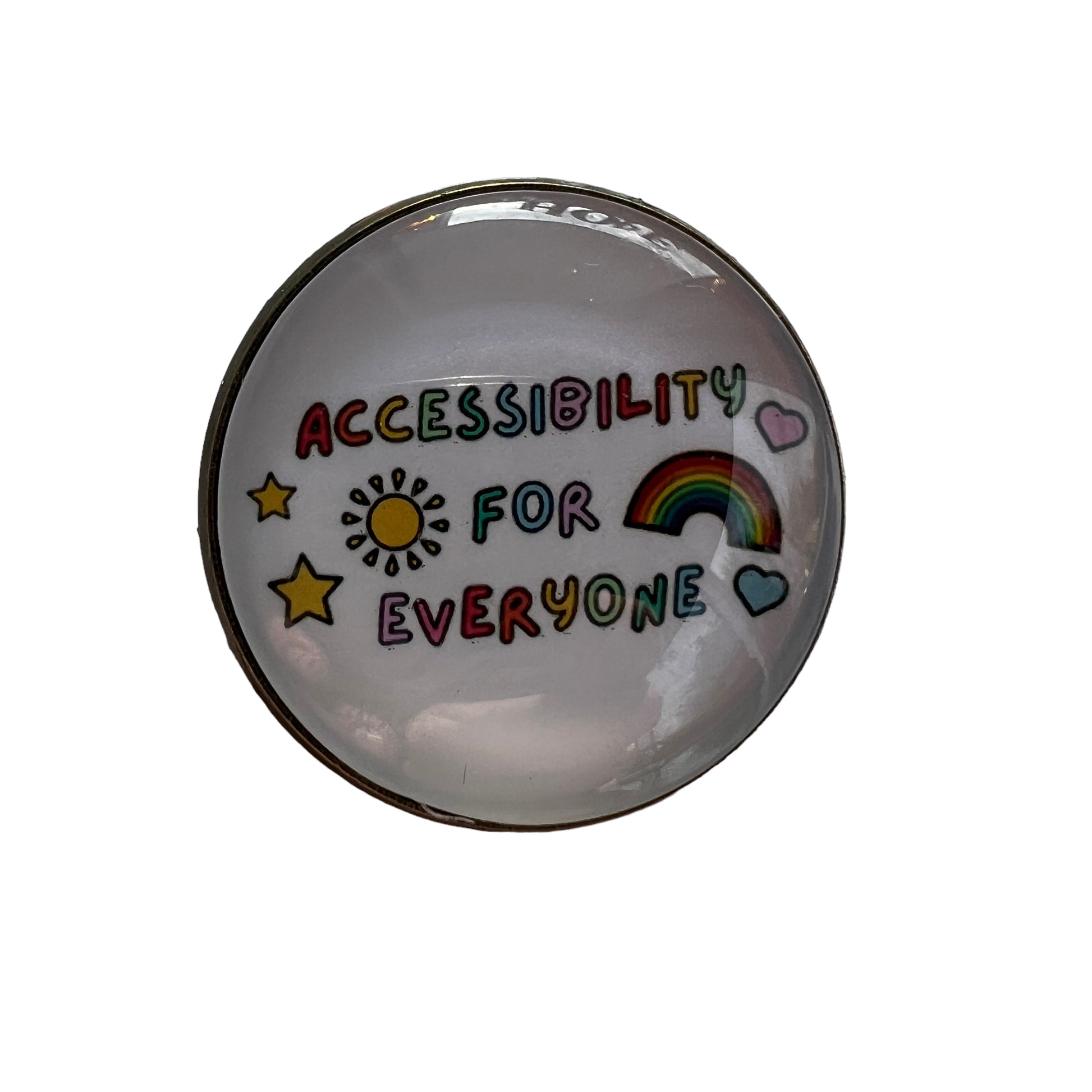 Advocate for inclusivity and equal access with our "Accessibility for Everyone" pin. It is a powerful statement in support of creating environments that accommodate diverse needs. It serves as a reminder to prioritise accessibility in all aspects of life, from physical spaces to digital platforms. Accessibility is a right for every single person - no matter what access needs you have. Use this pin to help open and spark important and critically necessary conversation.