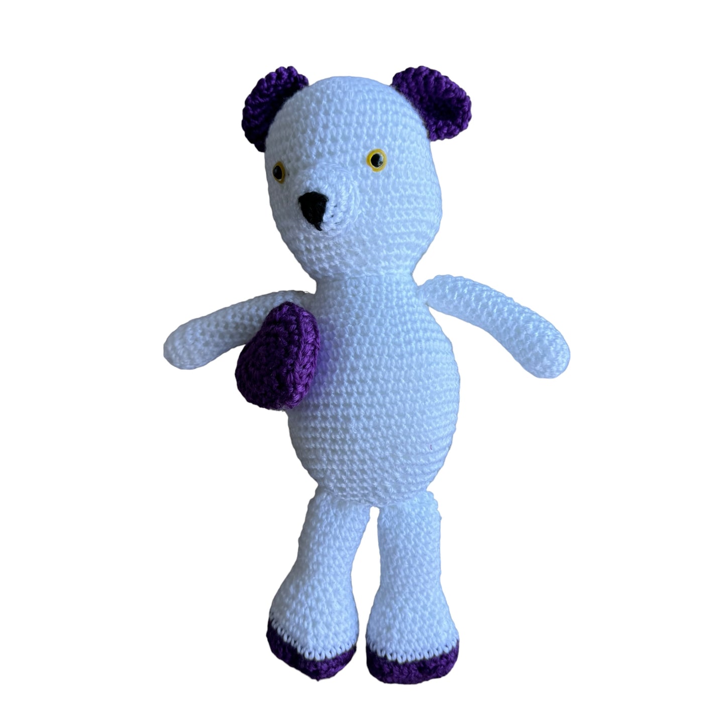 Tootsie is white with purple feet and purple ears. They have the most sparkling blue eyes in a Teddy you’ll see. Tootsie is a light weight bear, standing 34cm tall.