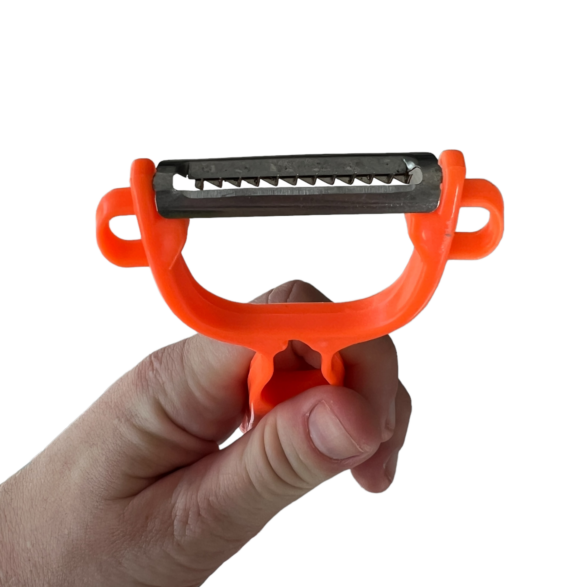 This peeler is an open hand design, allowing you to use your hold and grip the peeler without needing a lot of grip strength. It can be used to help protect the fingers from any accidental nick's or injuries, and has two peeling options — peel, or shred! It can also grate, and remove the “eye” from vegetables easily too. It has blades made with a sharp stainless steel that will not easily blunt or rust with proper use. It can be washed and dried or is also very dishwasher safe.