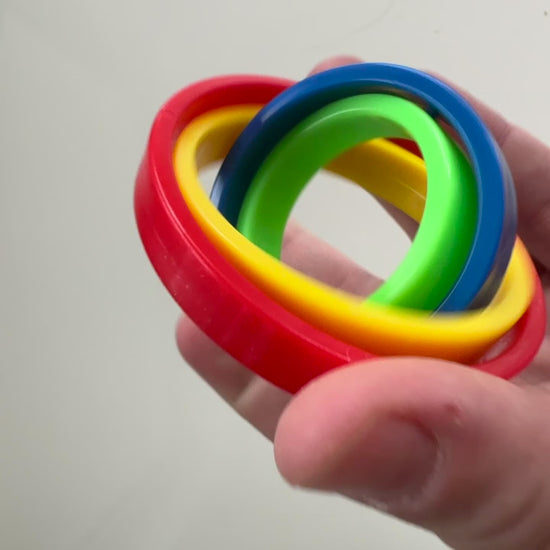 Image Description: A Multicolour Circular Fidget Spinner. Each circle is its own bright colour, with 5 separate coloured circles inside each other. The spinner consists of interlocking rings in various bright colors: yellow, red, green, and blue. The design allows for smooth spinning and manipulation, making it an ideal stress-relief toy. The compact size fits comfortably in the hand, emphasizing its portability and ease of use. The vibrant colours and circular design also makes it visually appealing and engaging.