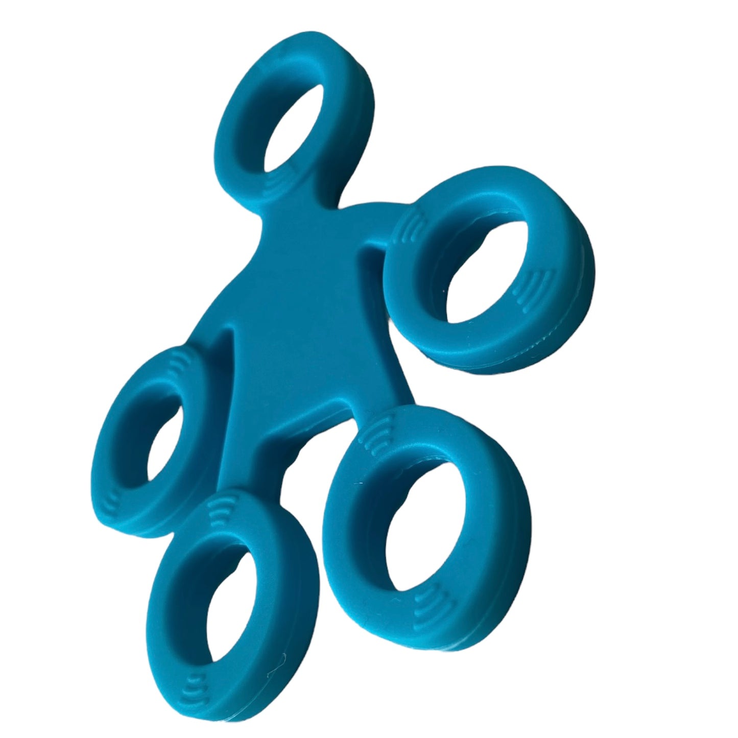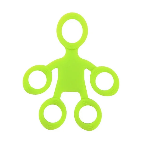 Image Description: Silicone finger exercisers in green, blue, teal, and orange. The bands feature five connected loops that fit over each finger, with subtle textured grips around each opening. Images show the bands laid flat to highlight the shape or demonstrate the product in use on a hand, fingers splayed against the band. There is a video showing how they work too.