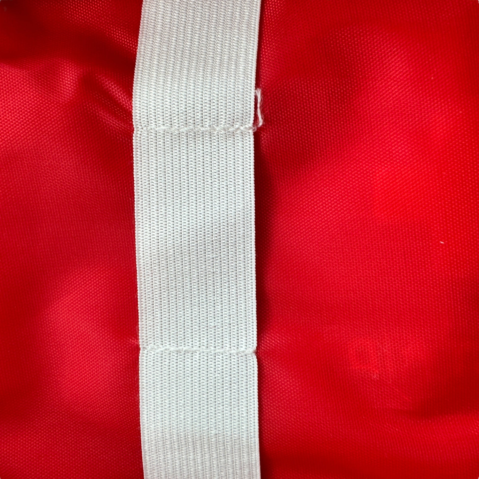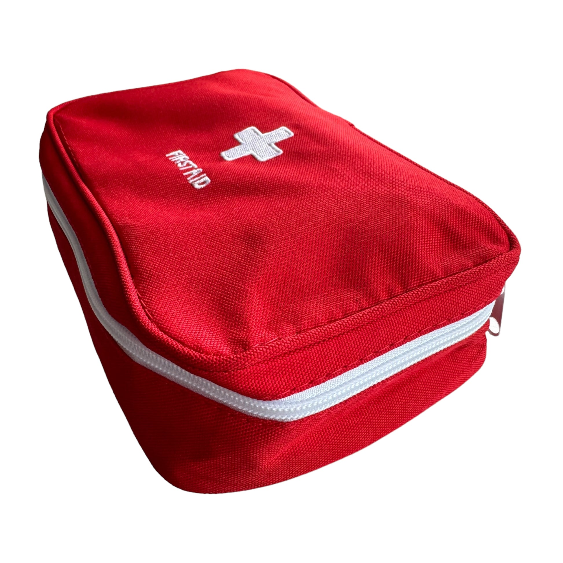 Image Description: A red canvas bag with the First Aid Logo and the words “First Aid Kit” on it. Inside the zipped compartment is netted compartments and elastic on the lid, for storing items, as well as two plastic sleeves built into the bag to store things also.