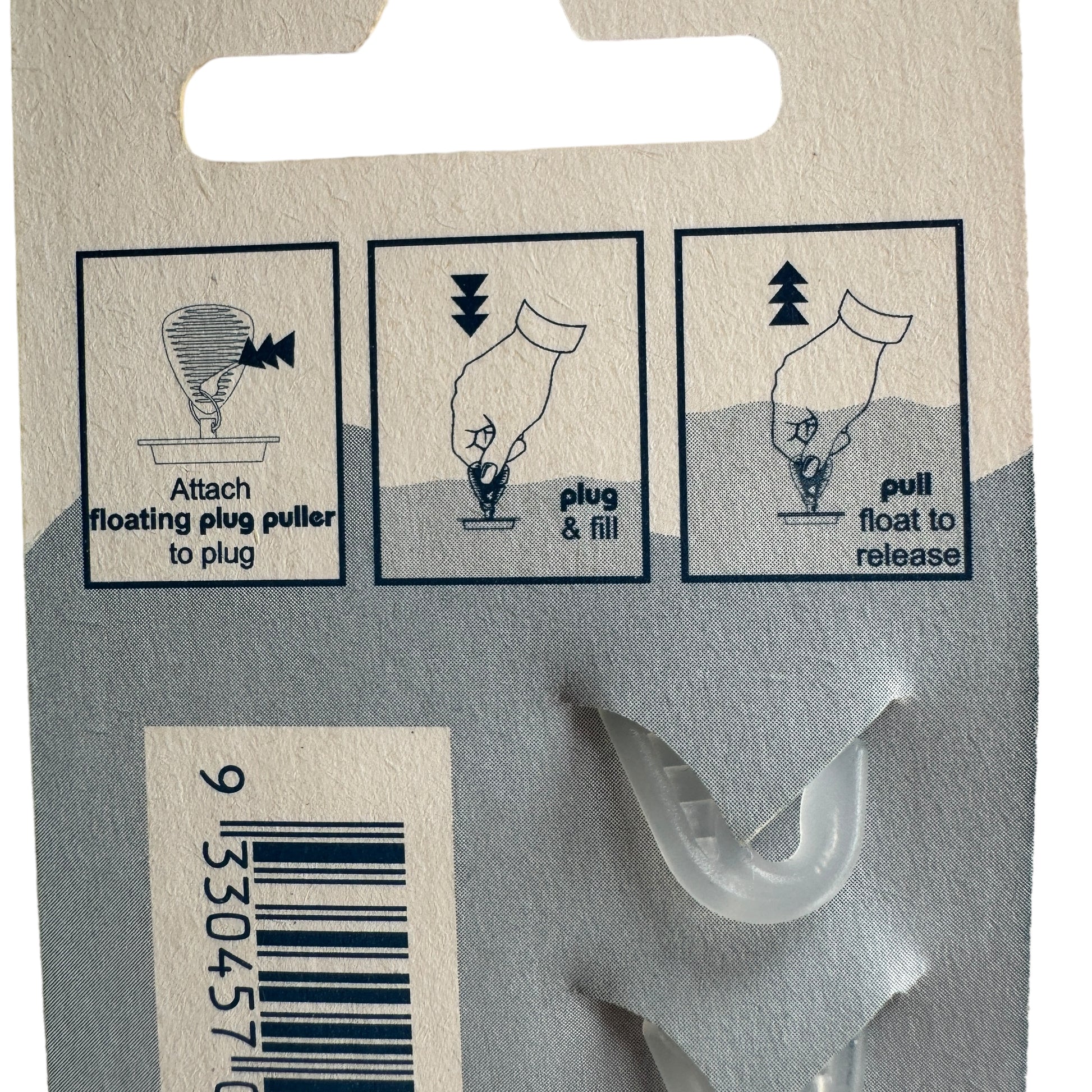 Image Description: A small plastic tag with a loop at the bottom to hold onto the plug itself. The tab floats to make it easy to grab and pull the plug more easily. Each card sold has 3 plug pullers for your use/needs.