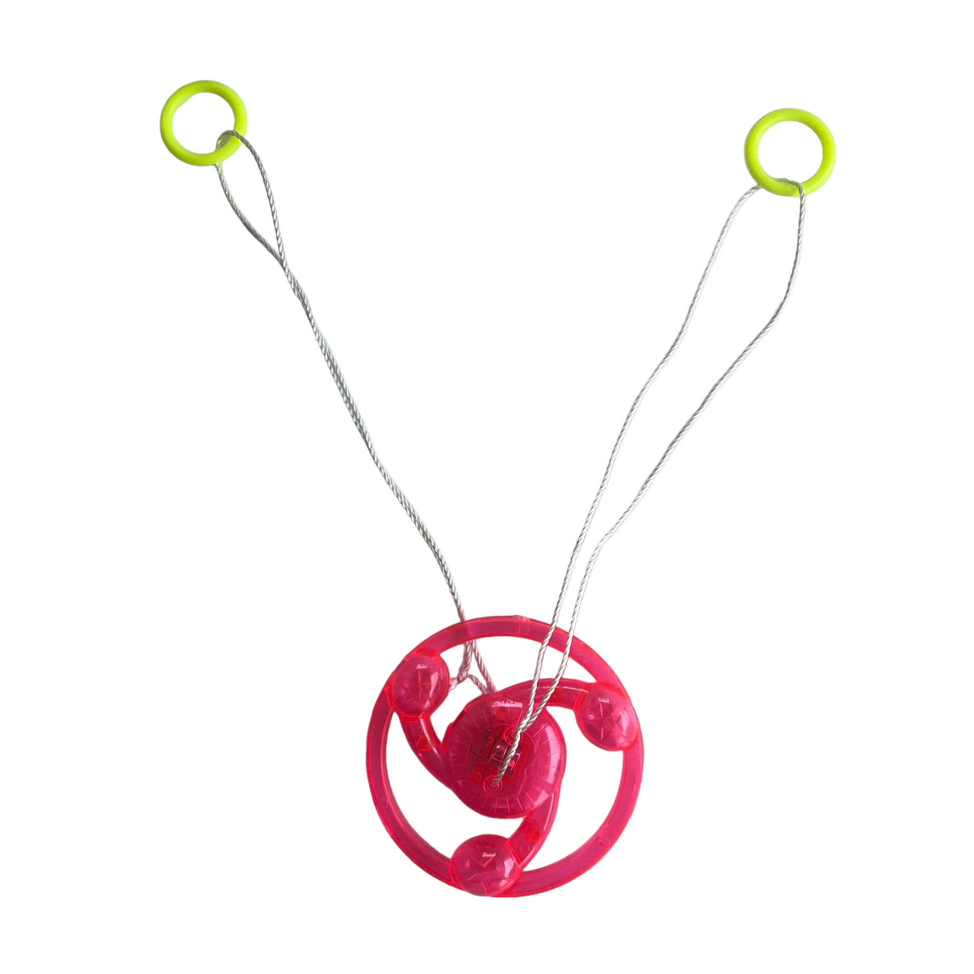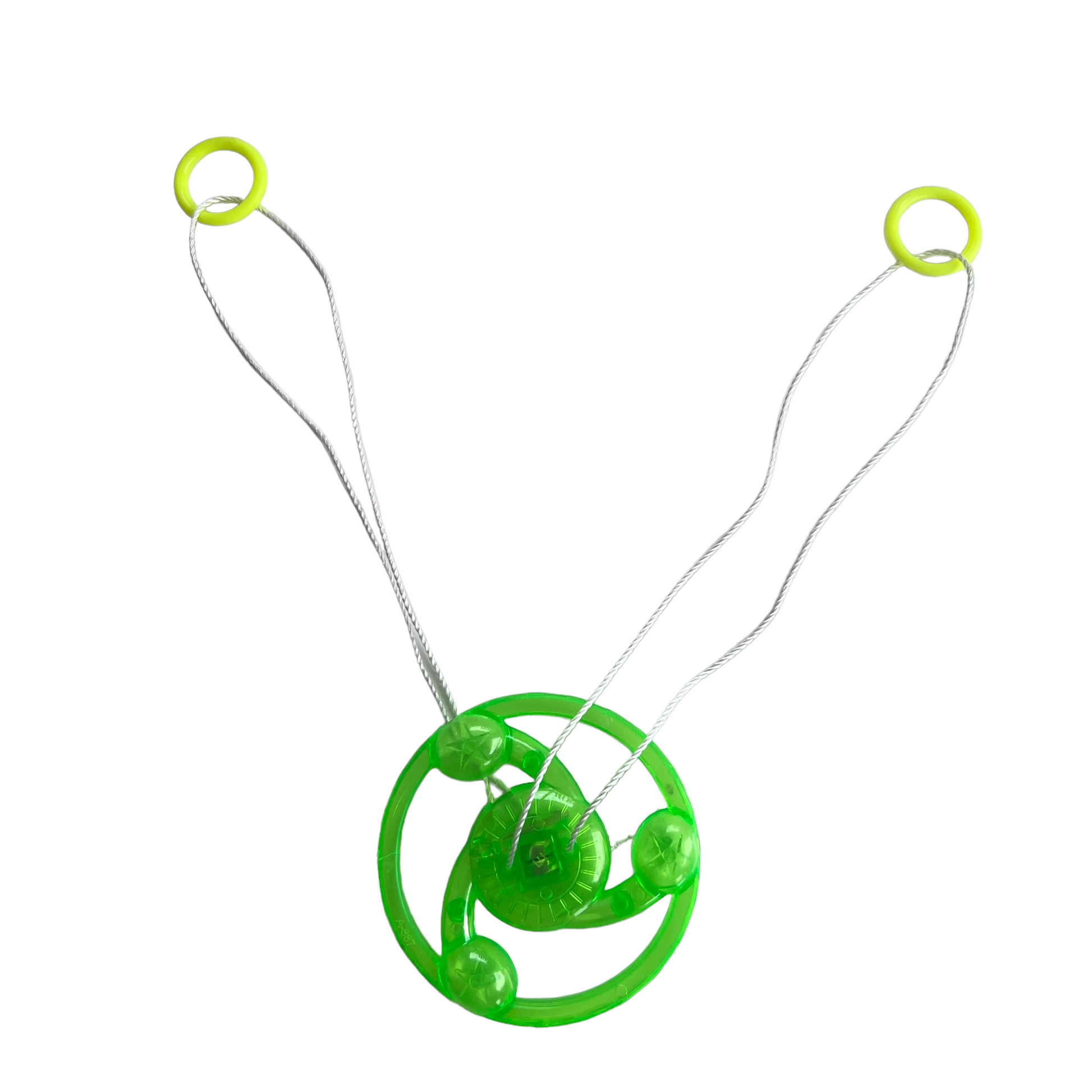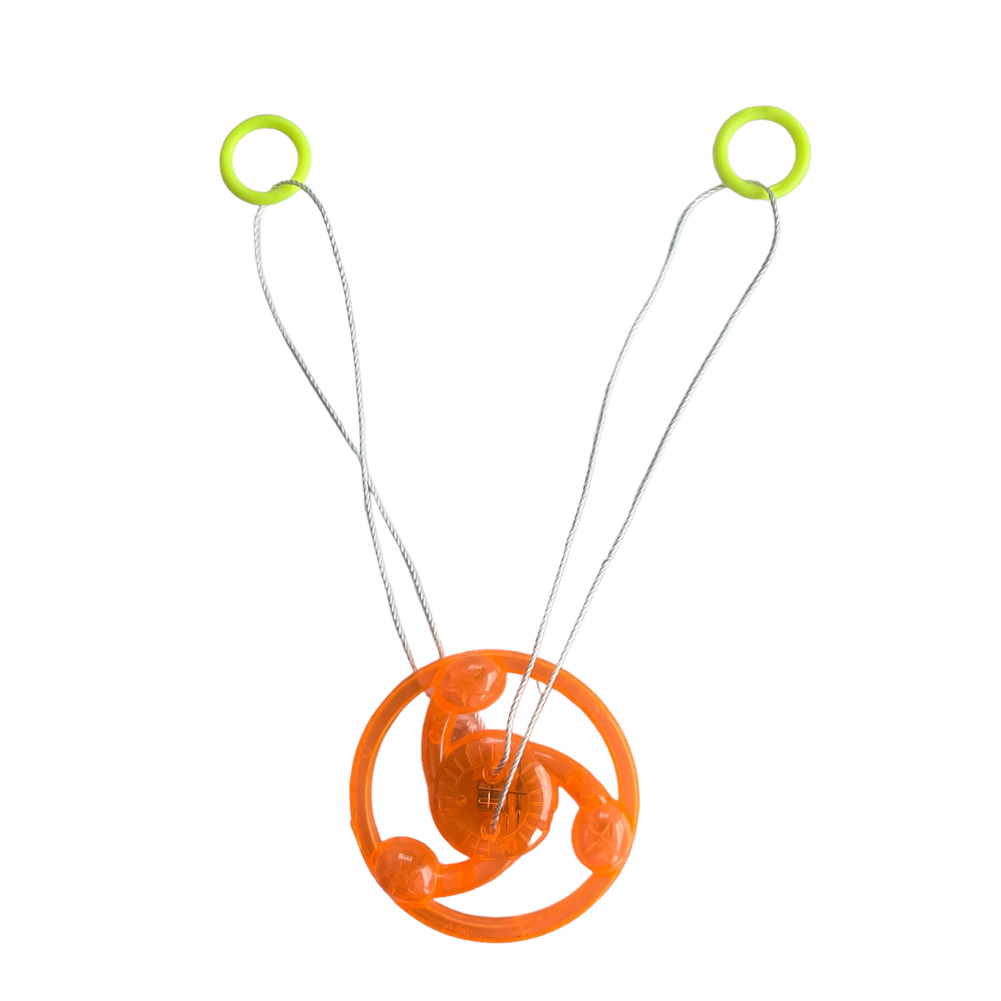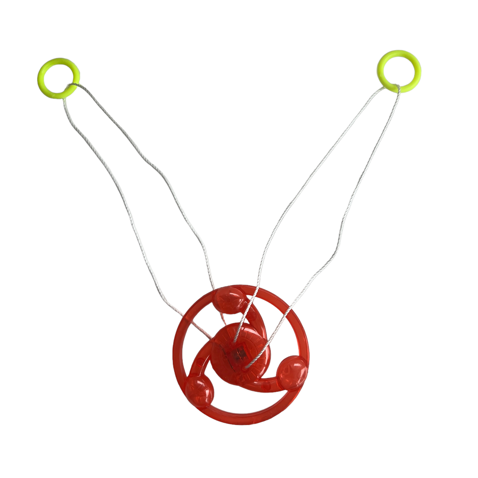 Just loop your finger through the yellow hoops, and spin the flywheel at high speed until the string is tightly wound, then pull the strings tightly and watch the flywheel light up emitting a colourful halo of light accompanied by a high whistle. Pull the loops as it unwinds to spin the flywheel at high speed again. The effect is better at night, but still enjoyable at any time!