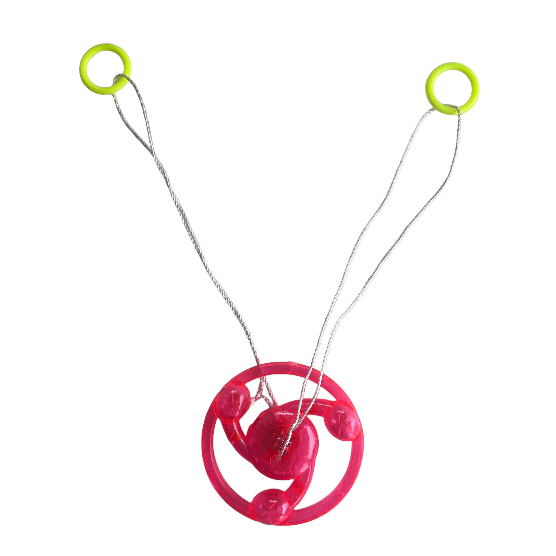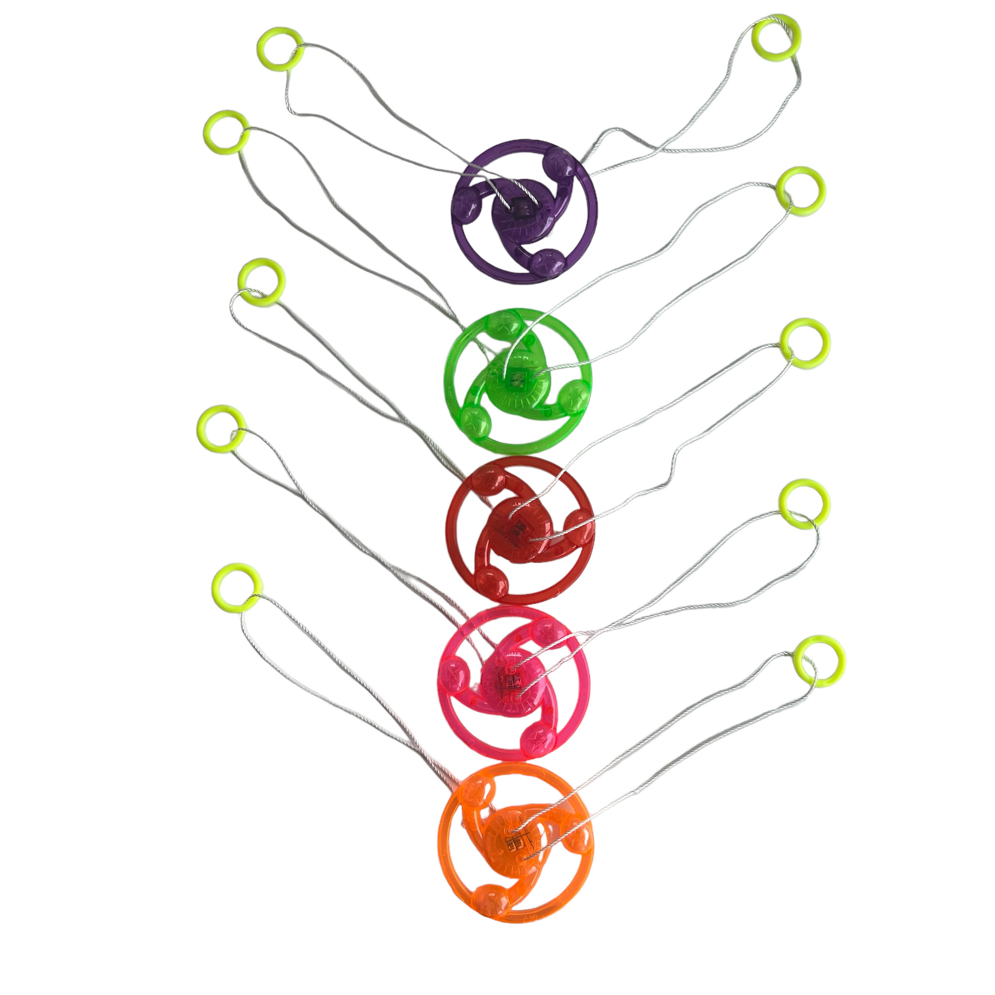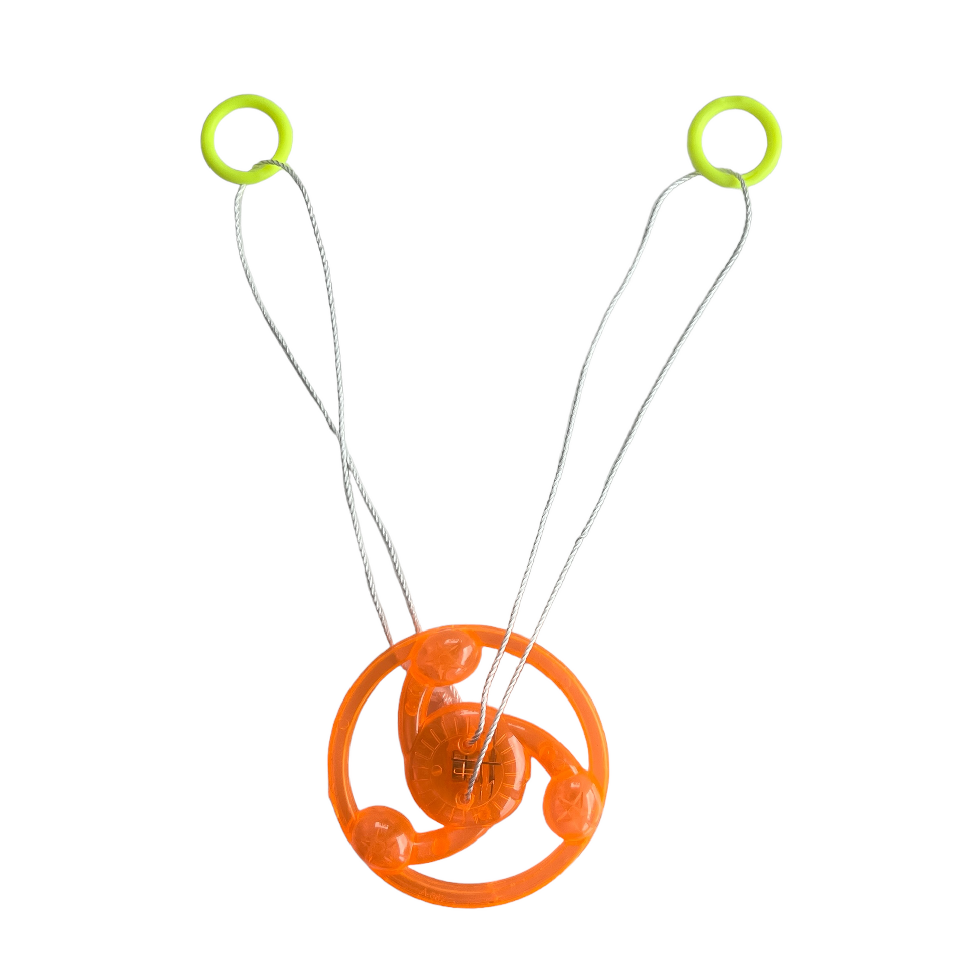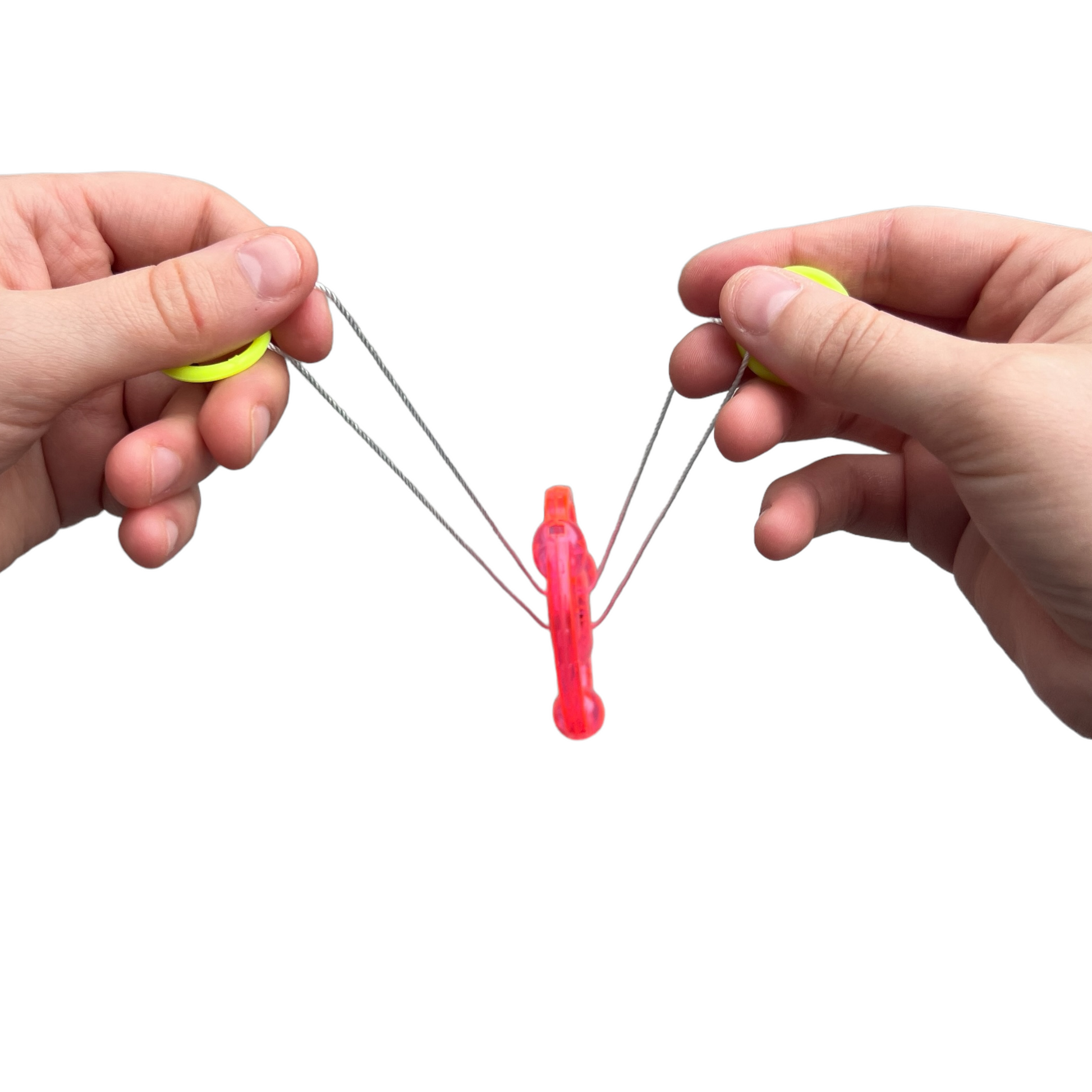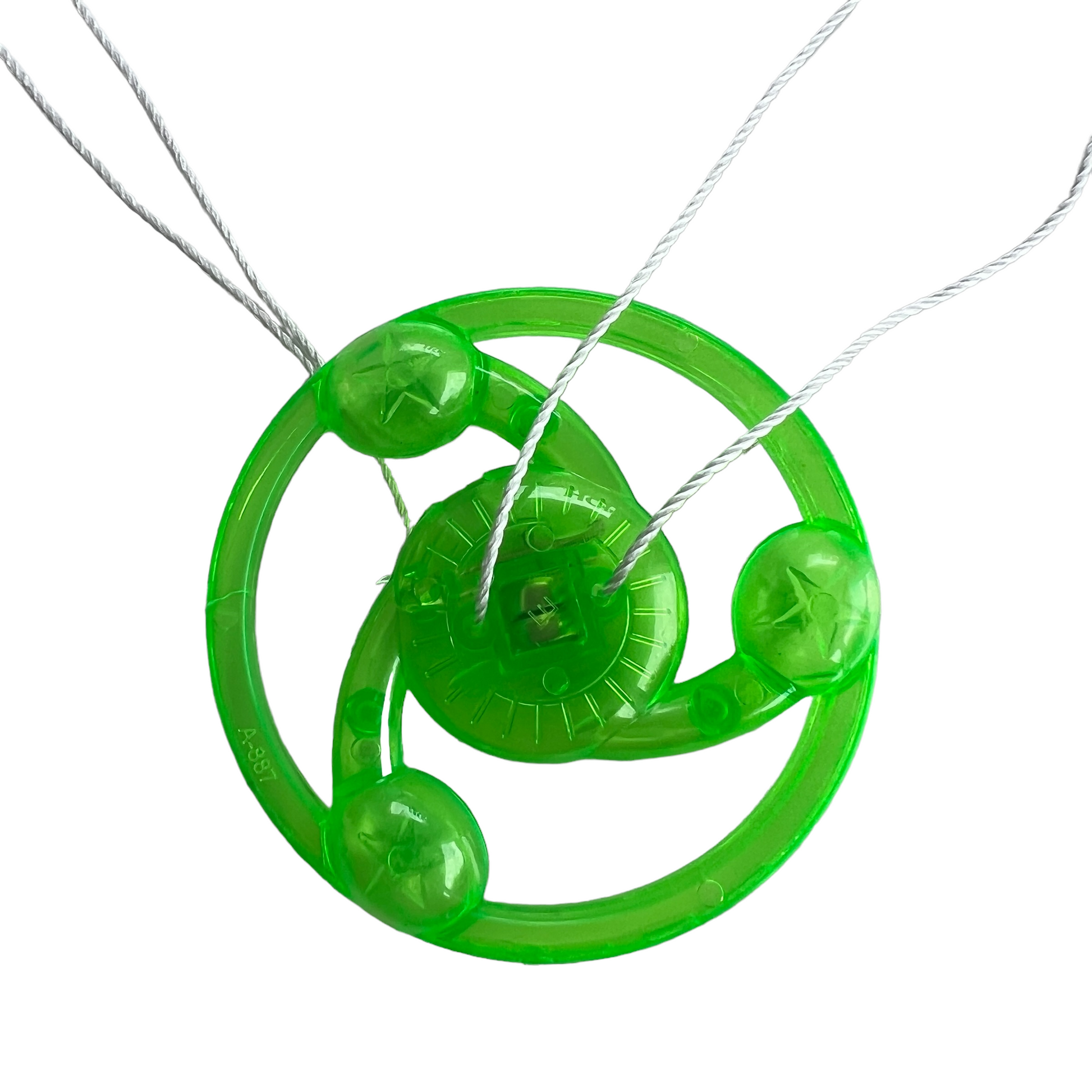 Just loop your finger through the yellow hoops, and spin the flywheel at high speed until the string is tightly wound, then pull the strings tightly and watch the flywheel light up emitting a colourful halo of light accompanied by a high whistle. Pull the loops as it unwinds to spin the flywheel at high speed again. The effect is better at night, but still enjoyable at any time!