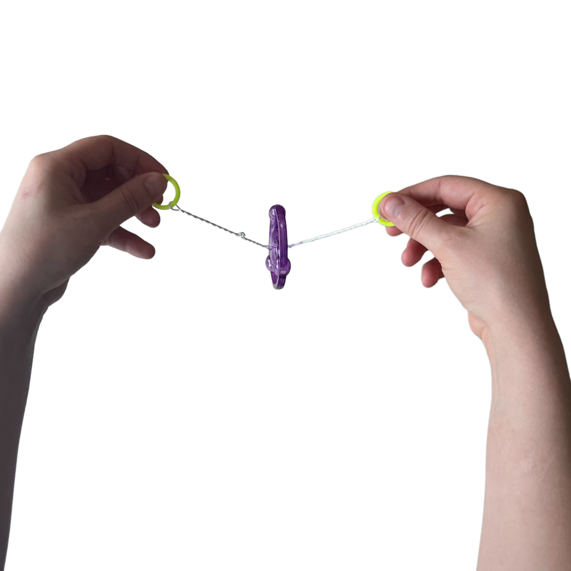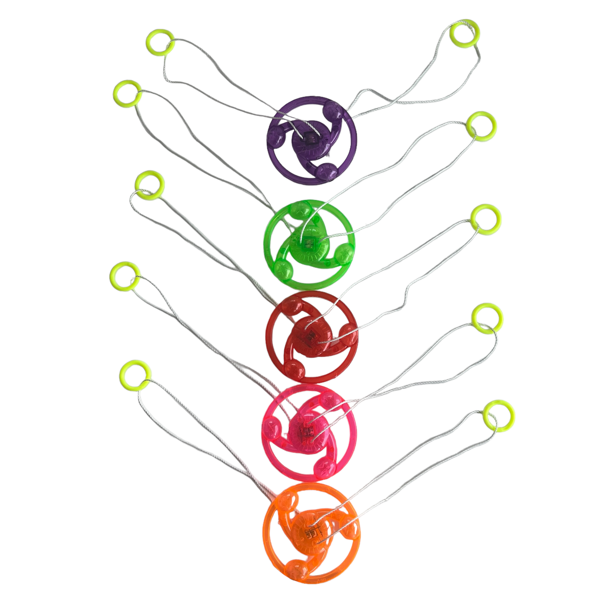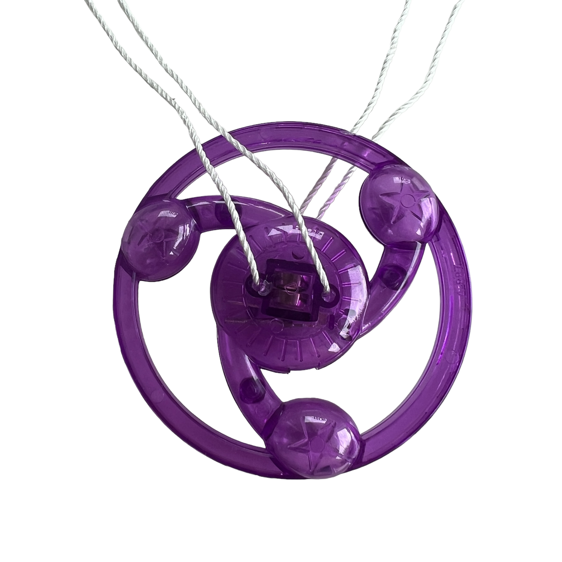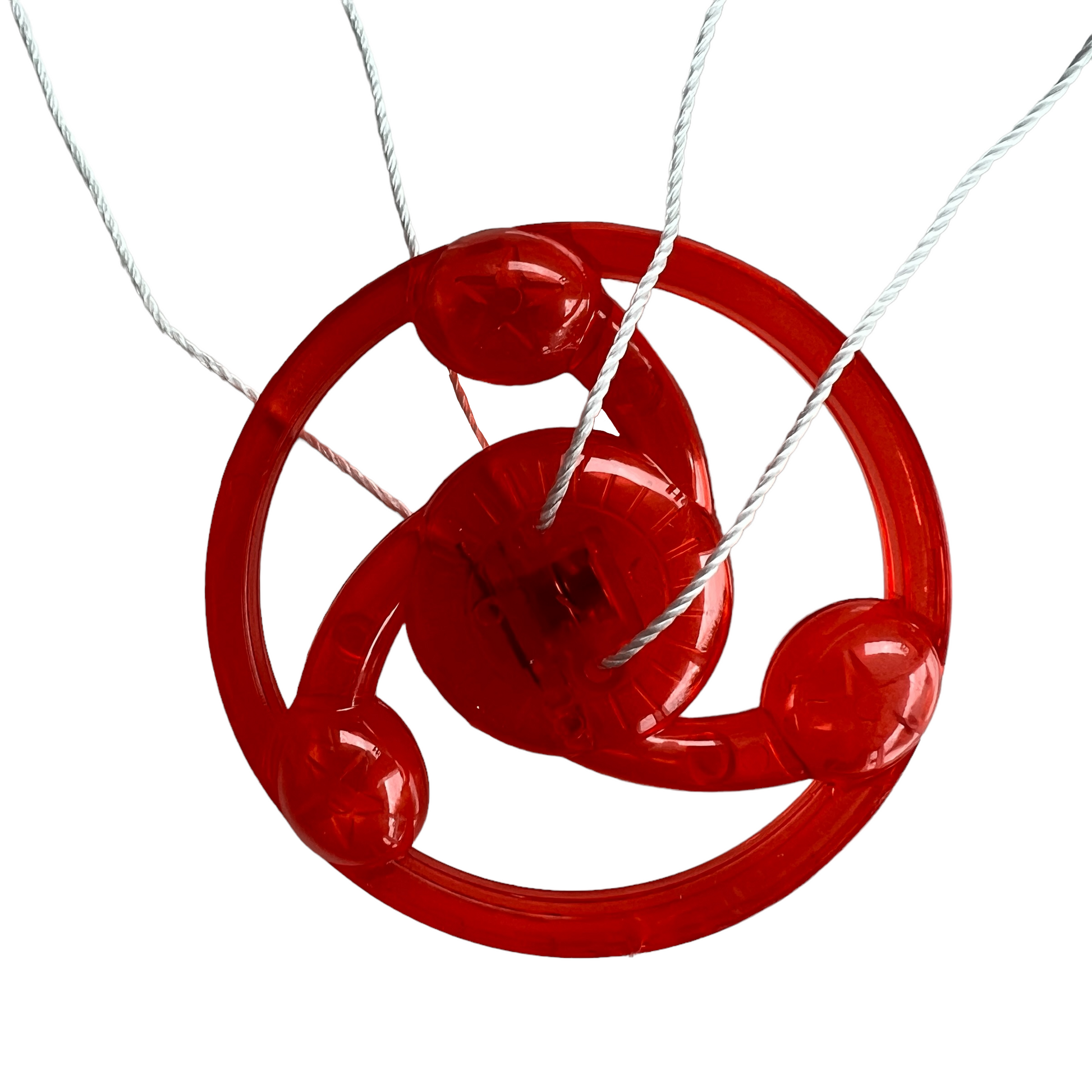 Just loop your finger through the yellow hoops, and spin the flywheel at high speed until the string is tightly wound, then pull the strings tightly and watch the flywheel light up emitting a colourful halo of light accompanied by a high whistle. Pull the loops as it unwinds to spin the flywheel at high speed again. The effect is better at night, but still enjoyable at any time!