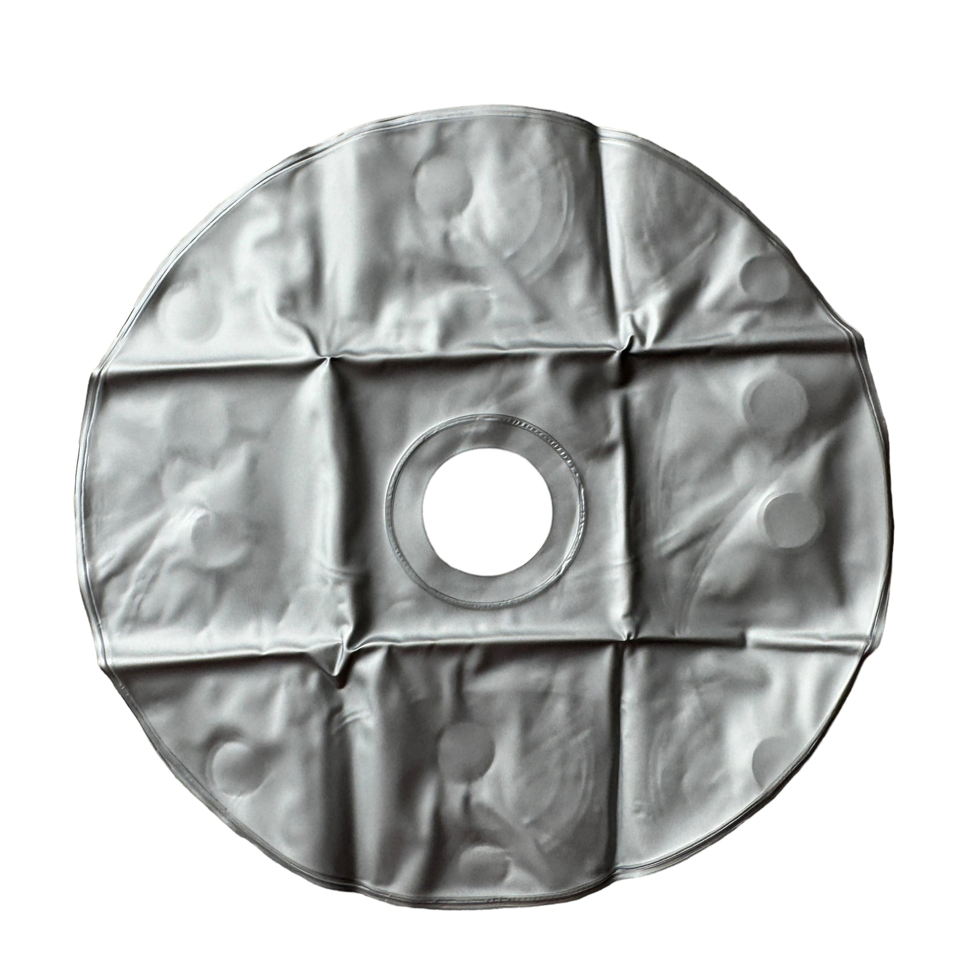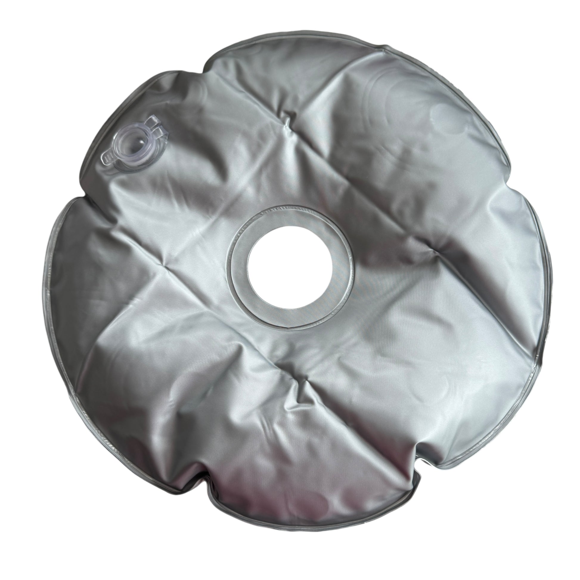 Image Description: A silver and circular pillow with a circular inner cut out for threading the balance weight onto the pole to sit around the pole and the legs of the stand once it’s been filled with water. There is a large opening plug to fill the item with water to give the stand weighted counter balance that you want for it.