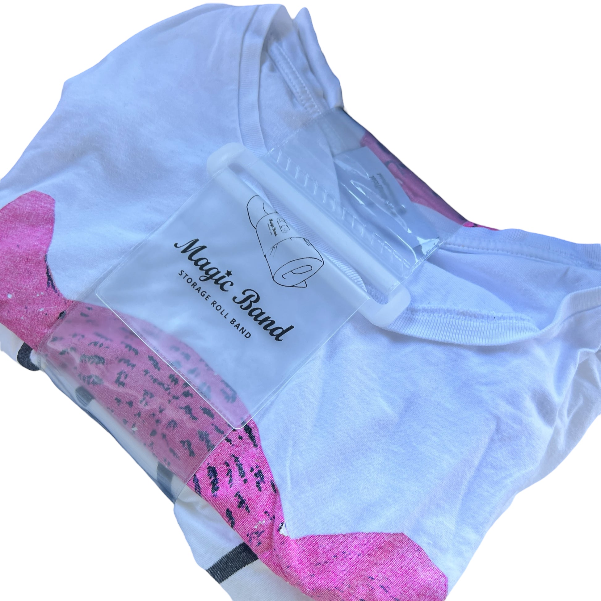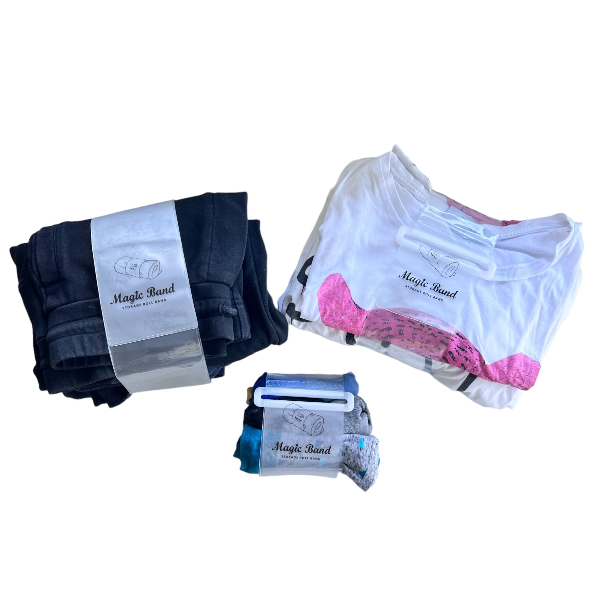 1. Use magic bands to hold your clothes together to pick out what you want each day from each pile. Ie: a set of t-shirts, pants, jumpers, sleepwear, etc… And pick one item from pile of clothes kept together with your incredible magic bands.