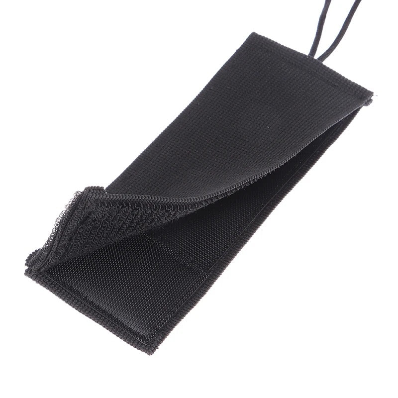 Image Description: A dialysis tube holder with a neck strap. The holder is made of black fabric and features a pocket designed to hold the catheter securely. The neck strap is adjustable with a sliding bead for a custom fit. One photo is shown demonstrating with a part of the catheter is visible, how it is securely tucked into the holder, and demonstrates its functionality. The overall design is simple, practical, and aimed at providing maximum comfort and security for the user.