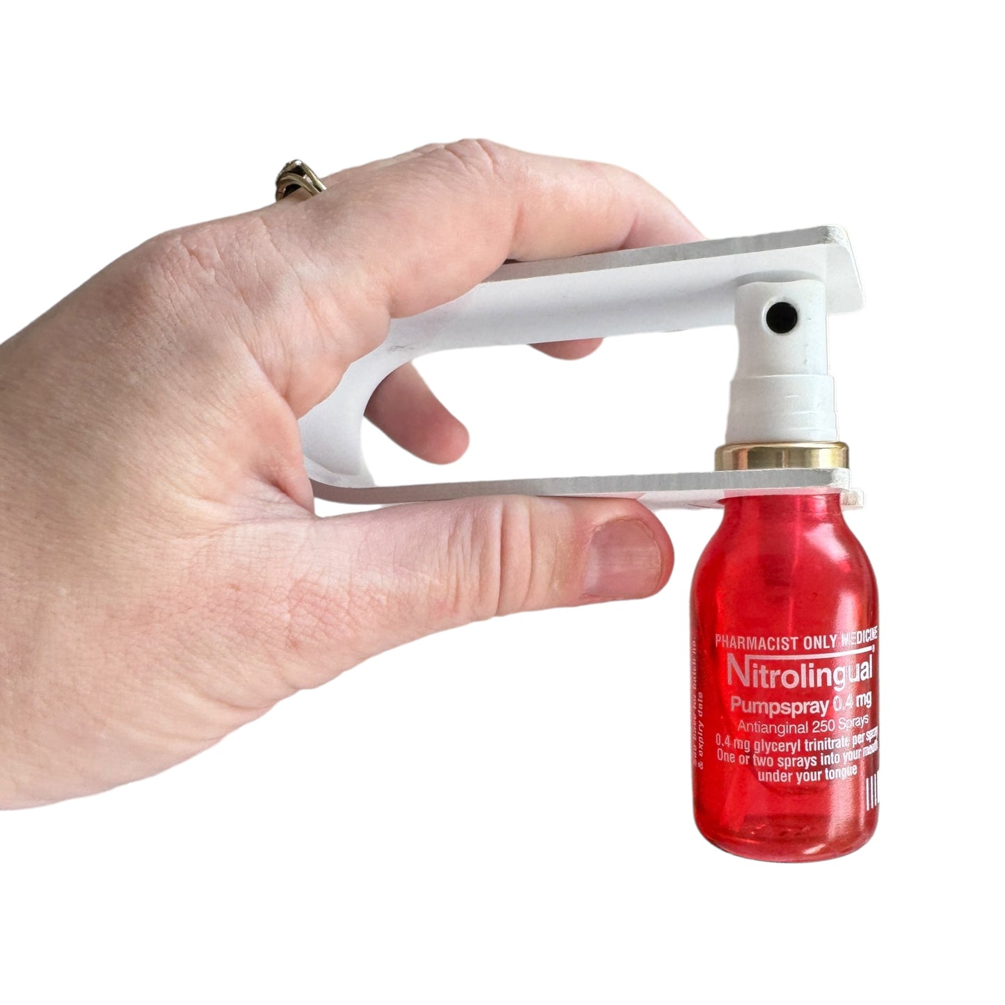 Whether you're managing arthritis, limited dexterity, or other hand conditions, our Nitrolingual Pump Spray Adapter offers a reliable and practical solution. With its user-friendly design, you can now administer your medication more readily and with less struggle, allowing you to prioritize your health and well-being. Say goodbye to unnecessary stress and hello to a smoother, more efficient medication routine.
