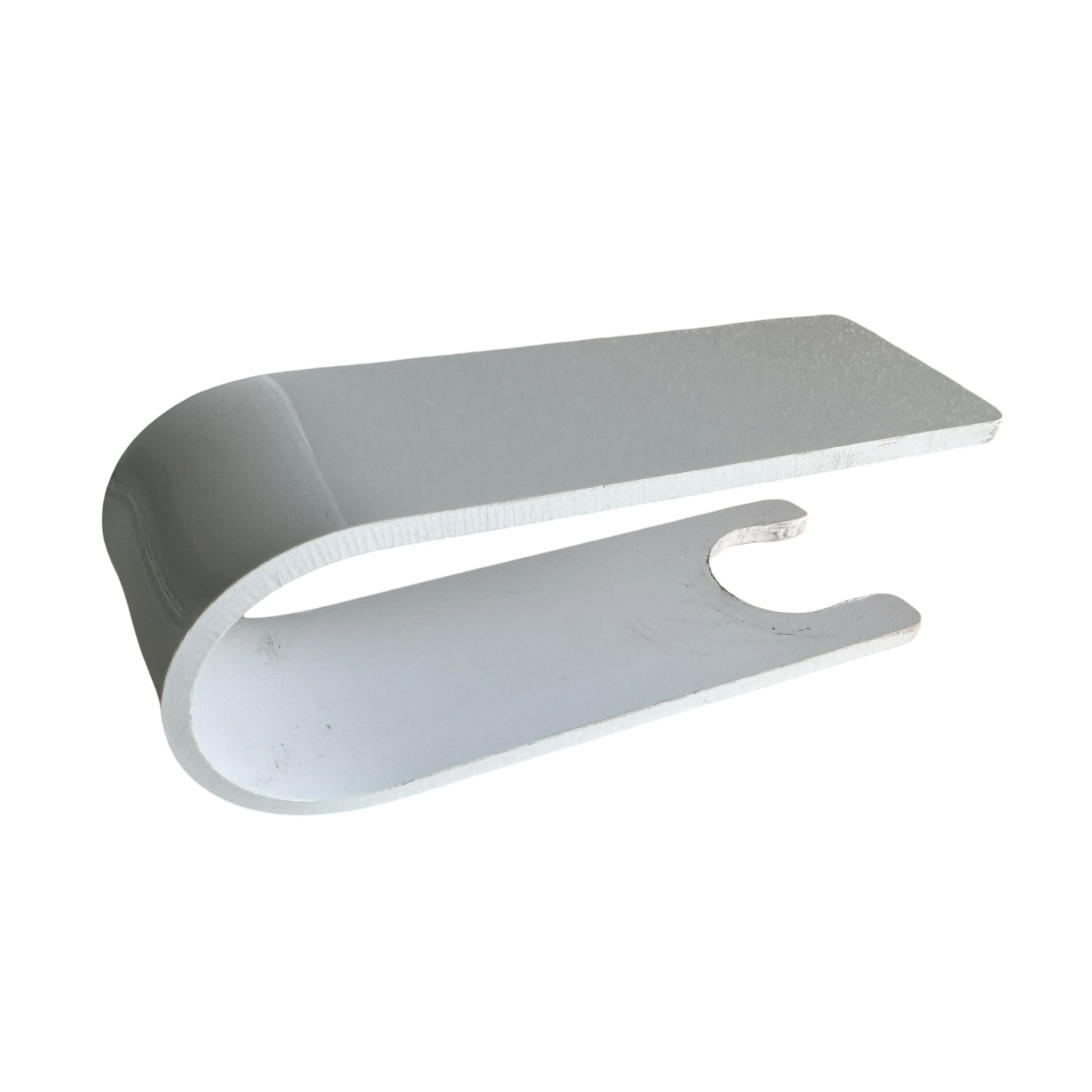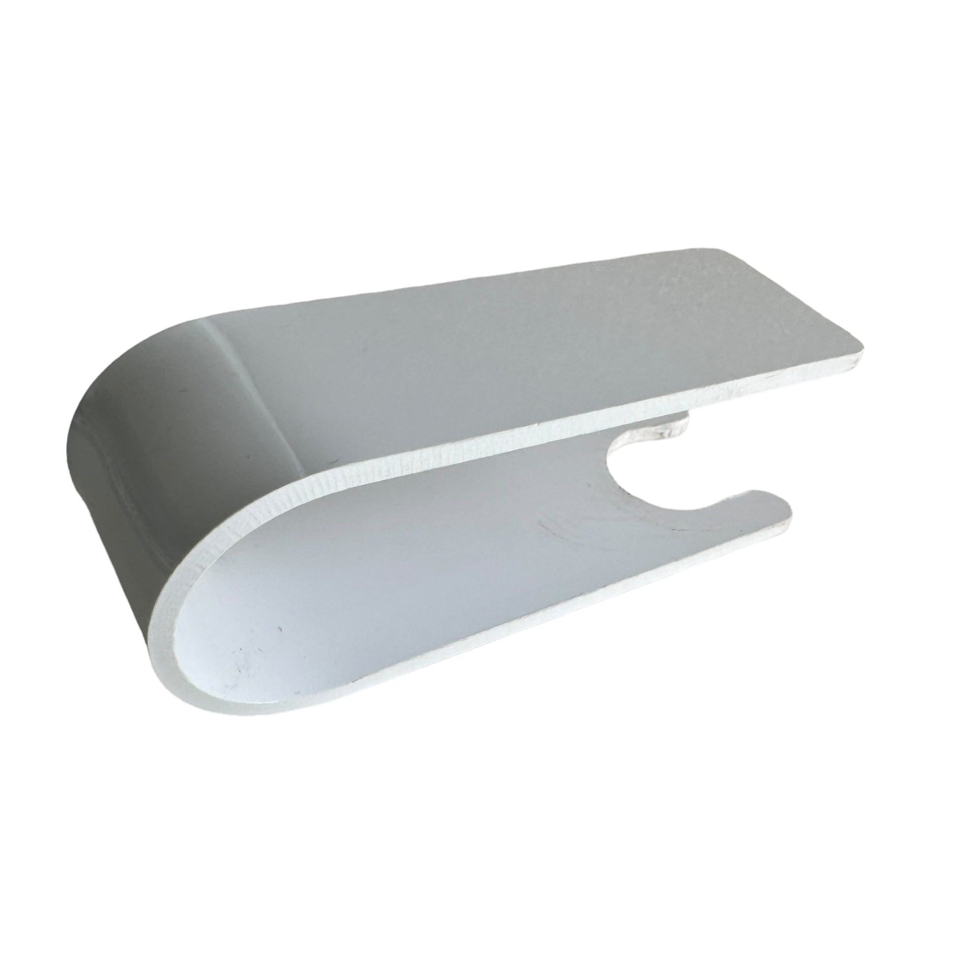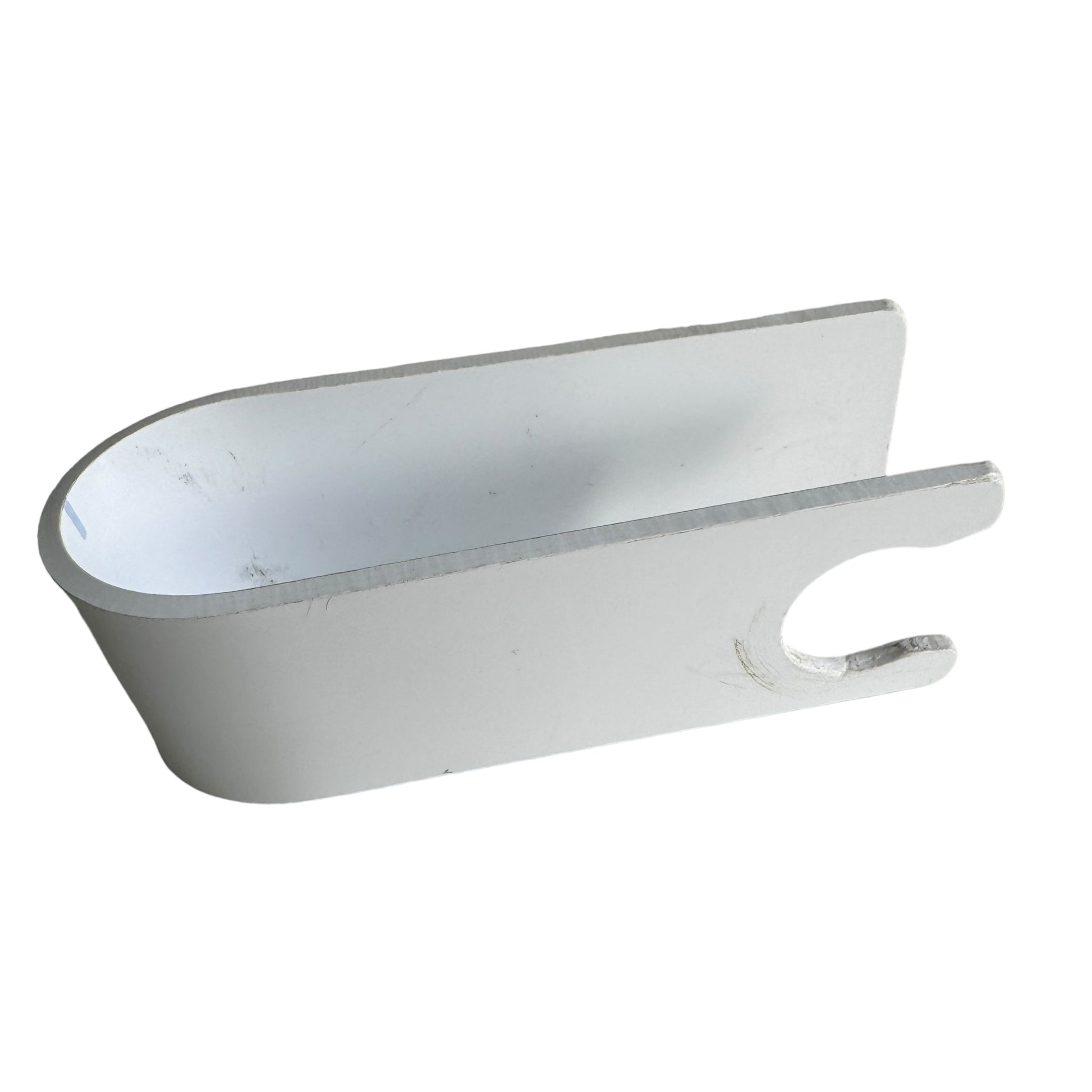 Image Description: A white U-shaped plastic clip that is 10cm (L) x 4cm (W). There is a circular indent at one end so it can attach to the bottle. On top it is flat and sits over the top of the pump part of the bottle.