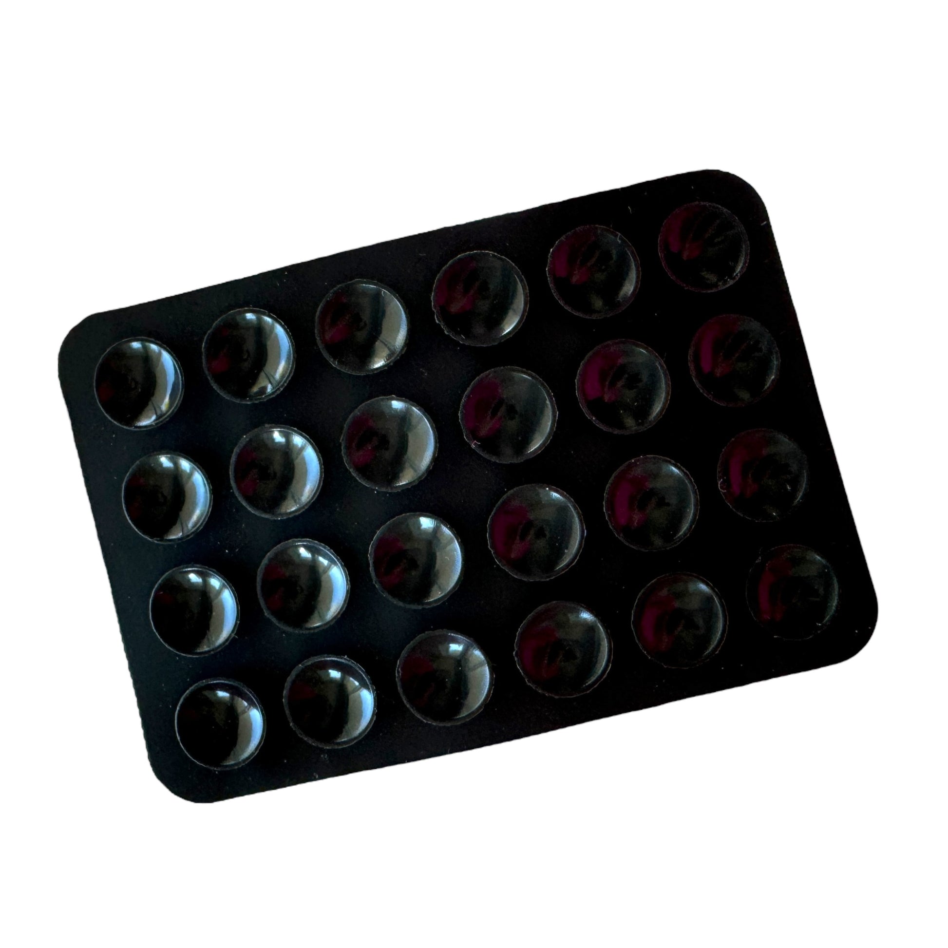 Image DescriptionA black rectangular pad with 24 small, evenly spaced suction cups arranged in four rows of six. The suction cups are glossy and slightly raised from the surface, designed to grip flat objects like a phone or a smooth surface. The pad has rounded corners and a flexible, rubber-like texture. It’s compact and designed for portable, hands-free use.