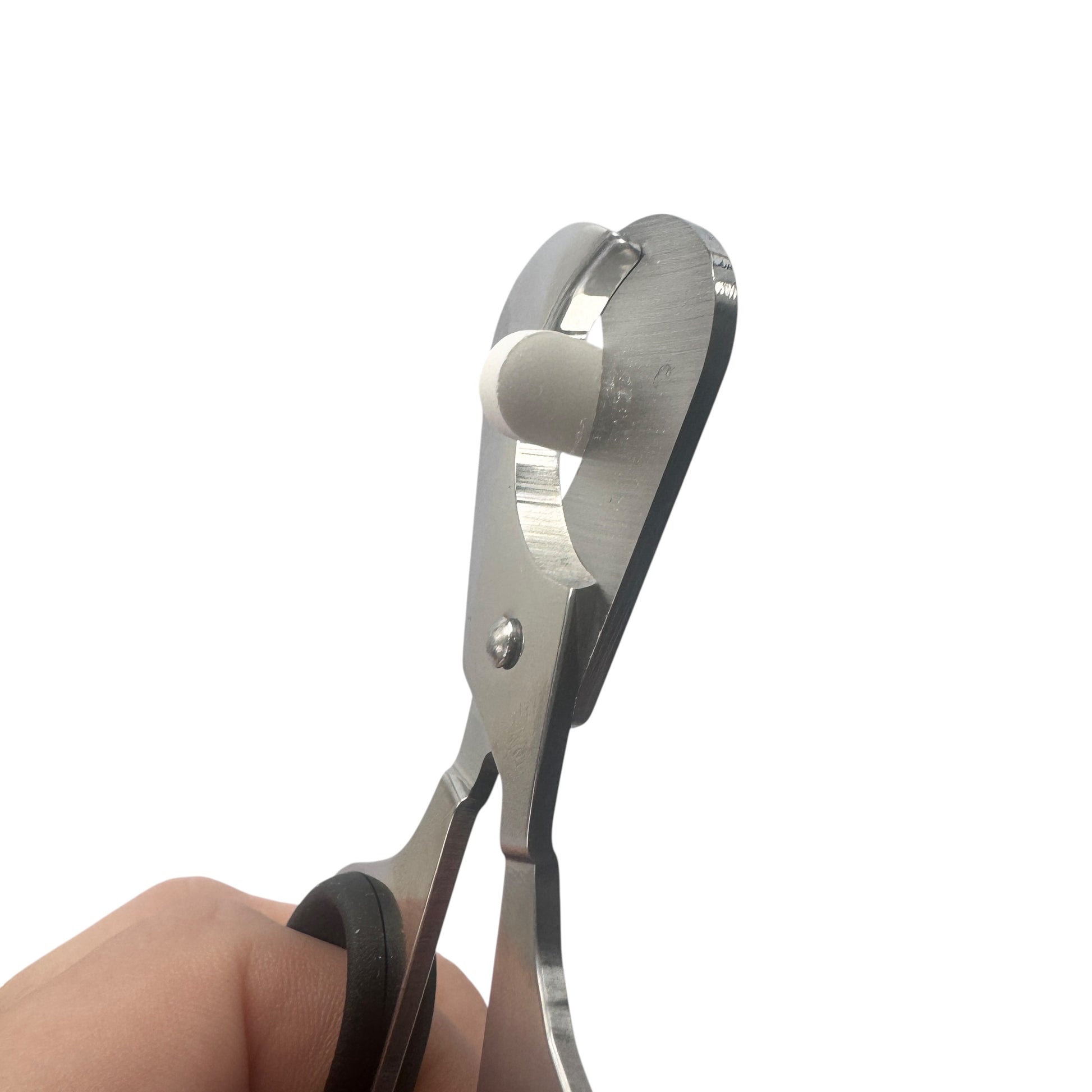 Image Description: A stainless steel pill cutter shaped like a pair of scissors, with two large black-grip handles and a curved blade opening in place of traditional scissor blades. The curved cutter is designed to grip and split tablets cleanly.