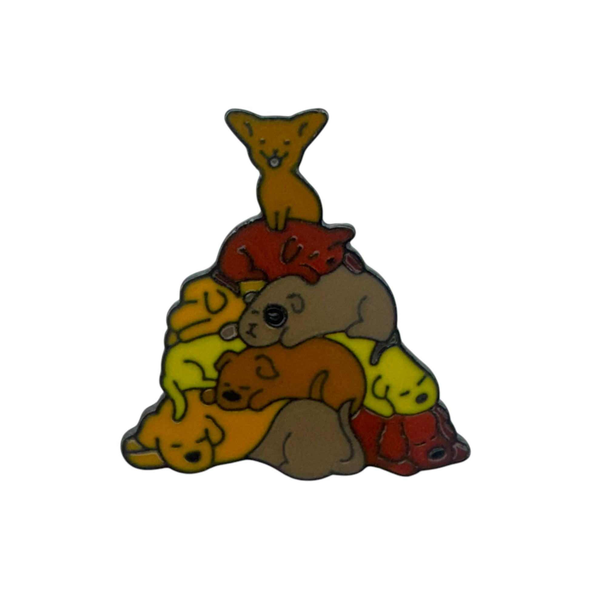 Image Description: A pin showing a colourful pile of sleeping cartoon puppies in yellow, orange, red, and tan shades. One small puppy sits proudly at the top of the pile. The pin has a playful, heartwarming design and is shown resting on a hand for scale.