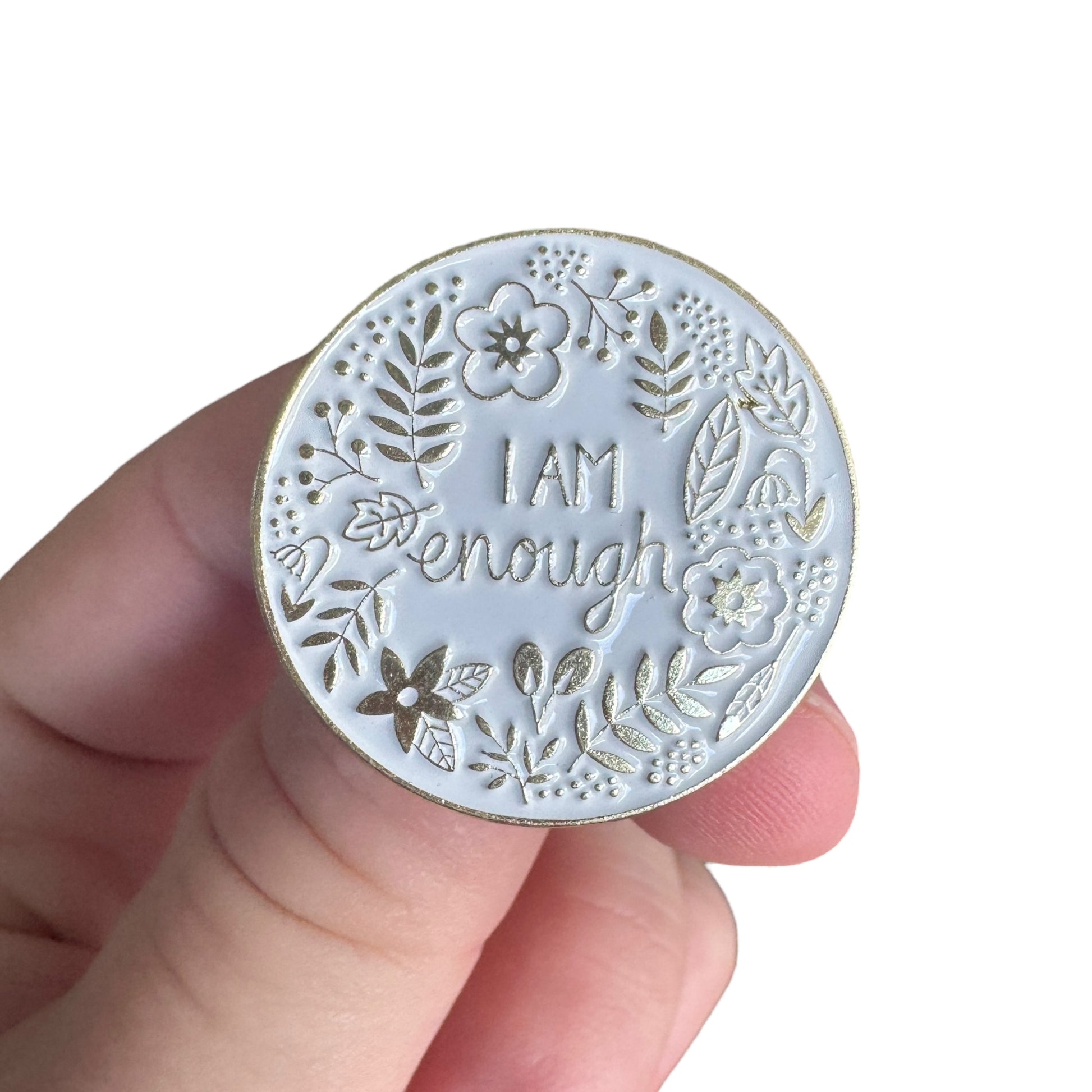 Image Description: An enamel pin with soft white colouring and gold detailing. The centre reads “I AM enough,” surrounded by raised floral and leaf designs.