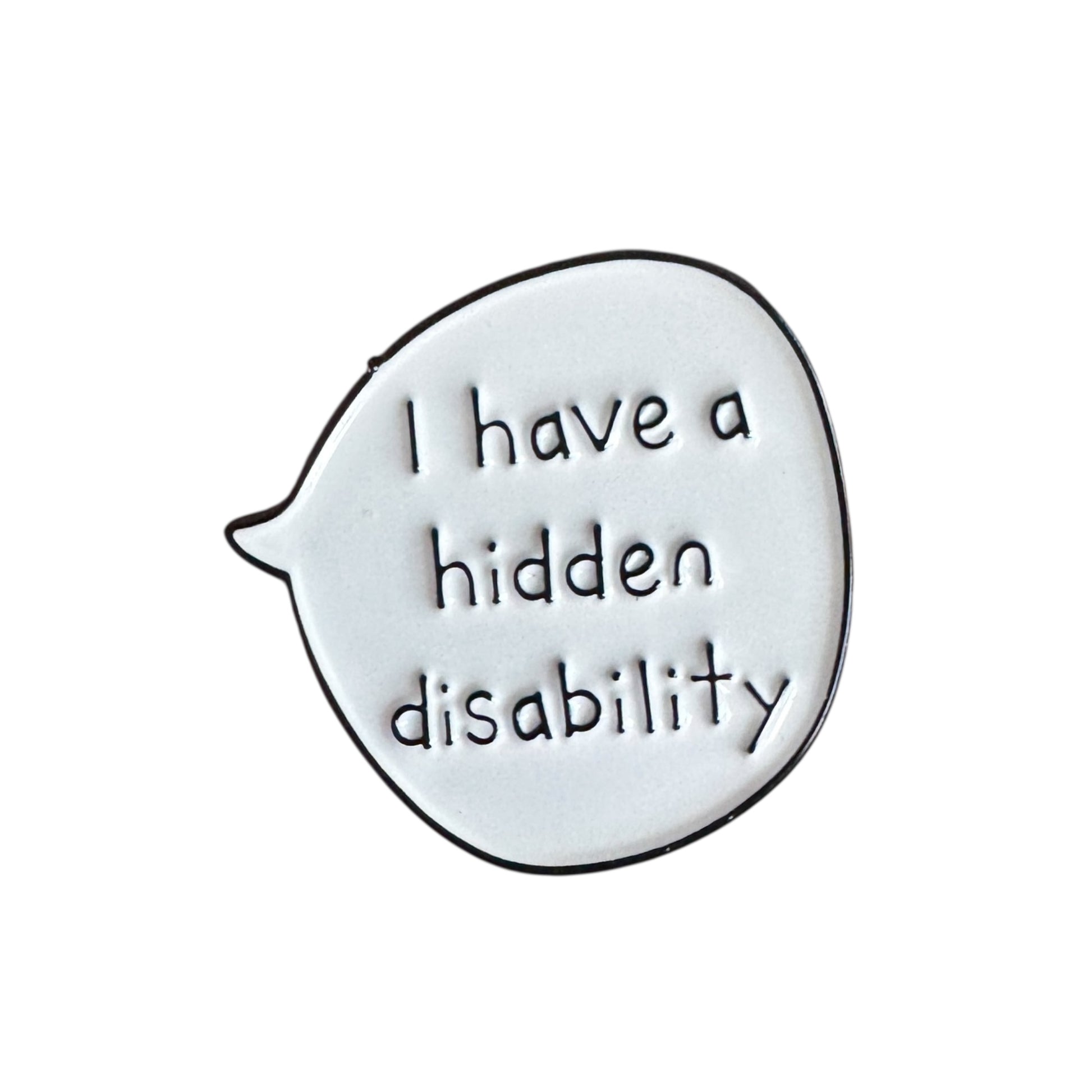 Image Description: A white enamel pin in the shape of a speech bubble with a thin black outline. It reads, “I have a hidden disability” in simple black lettering, spread over three lines. The background is plain white, bringing attention to the clear and important message on the pin.