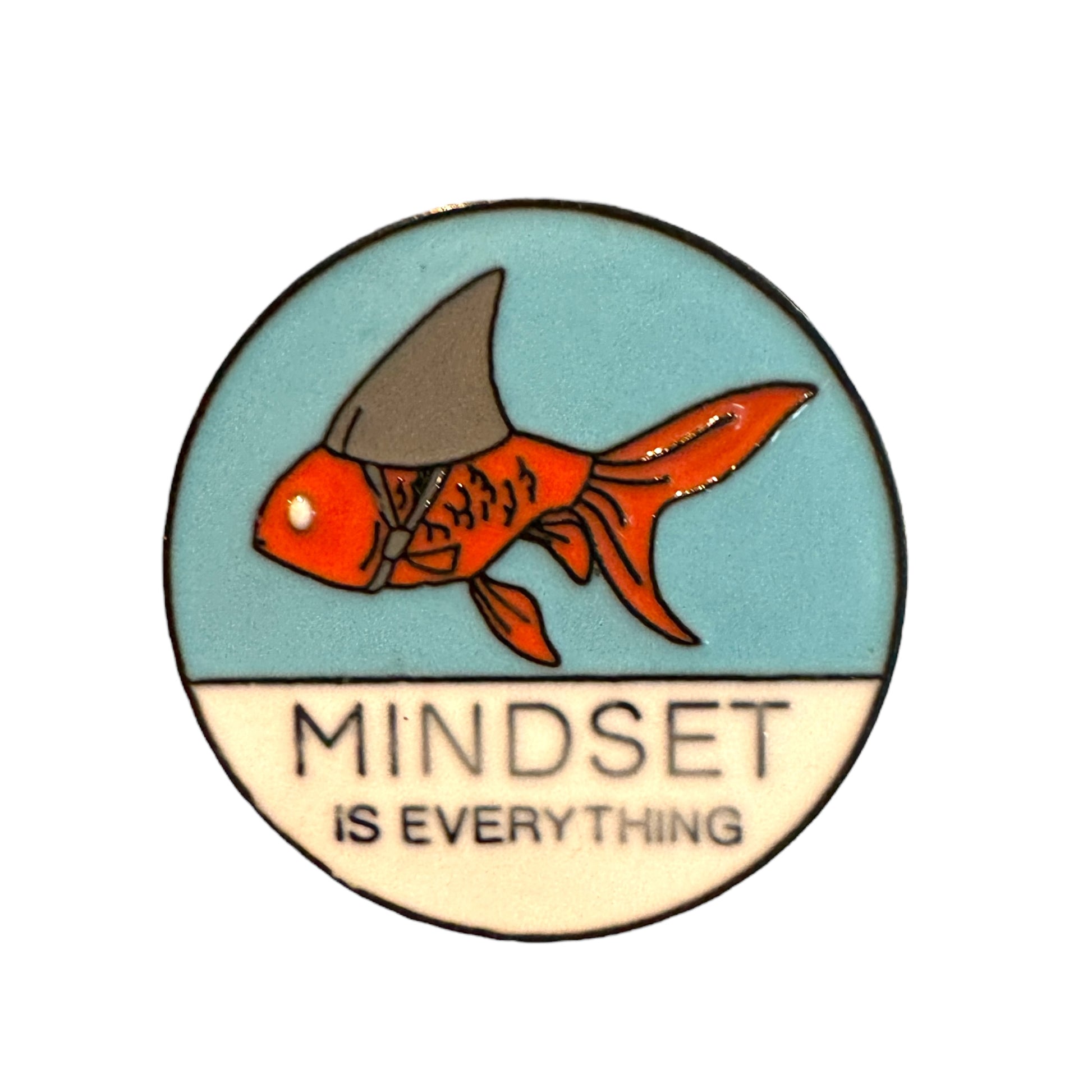 Image DescriptionA round pin featuring an orange goldfish wearing a grey shark fin strapped to its back. The background is a light ocean blue. with the bottom portion of the pin in white. Below the fish, a portion of the pin is in white to highlight the words: “MINDSET IS EVERYTHING”, written in bold black letters. There is a black outlining around the pin, and has a glossy finish.