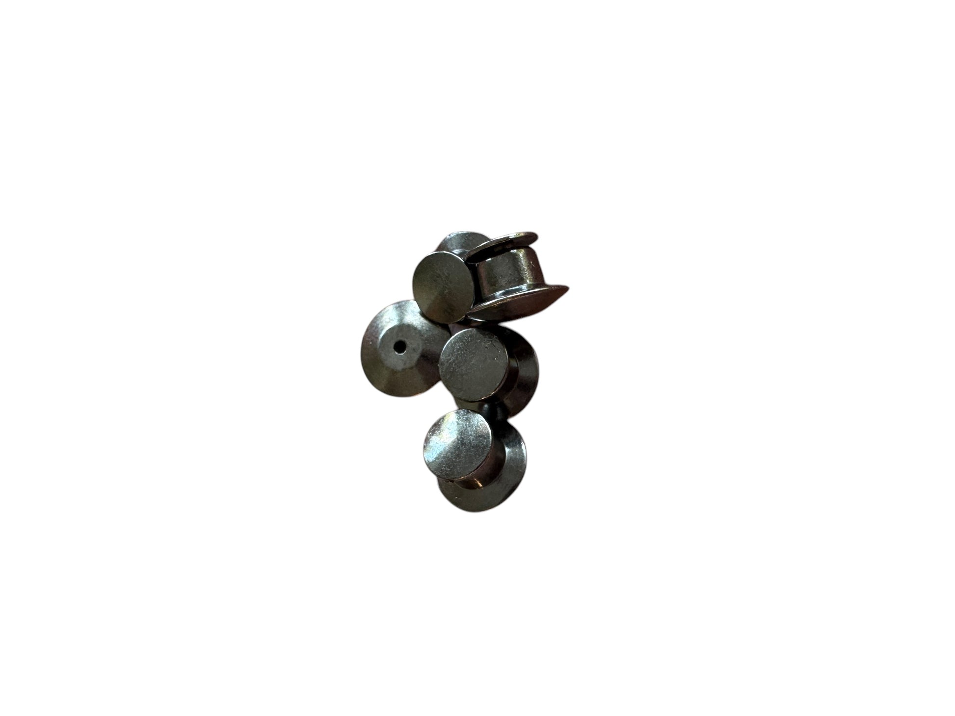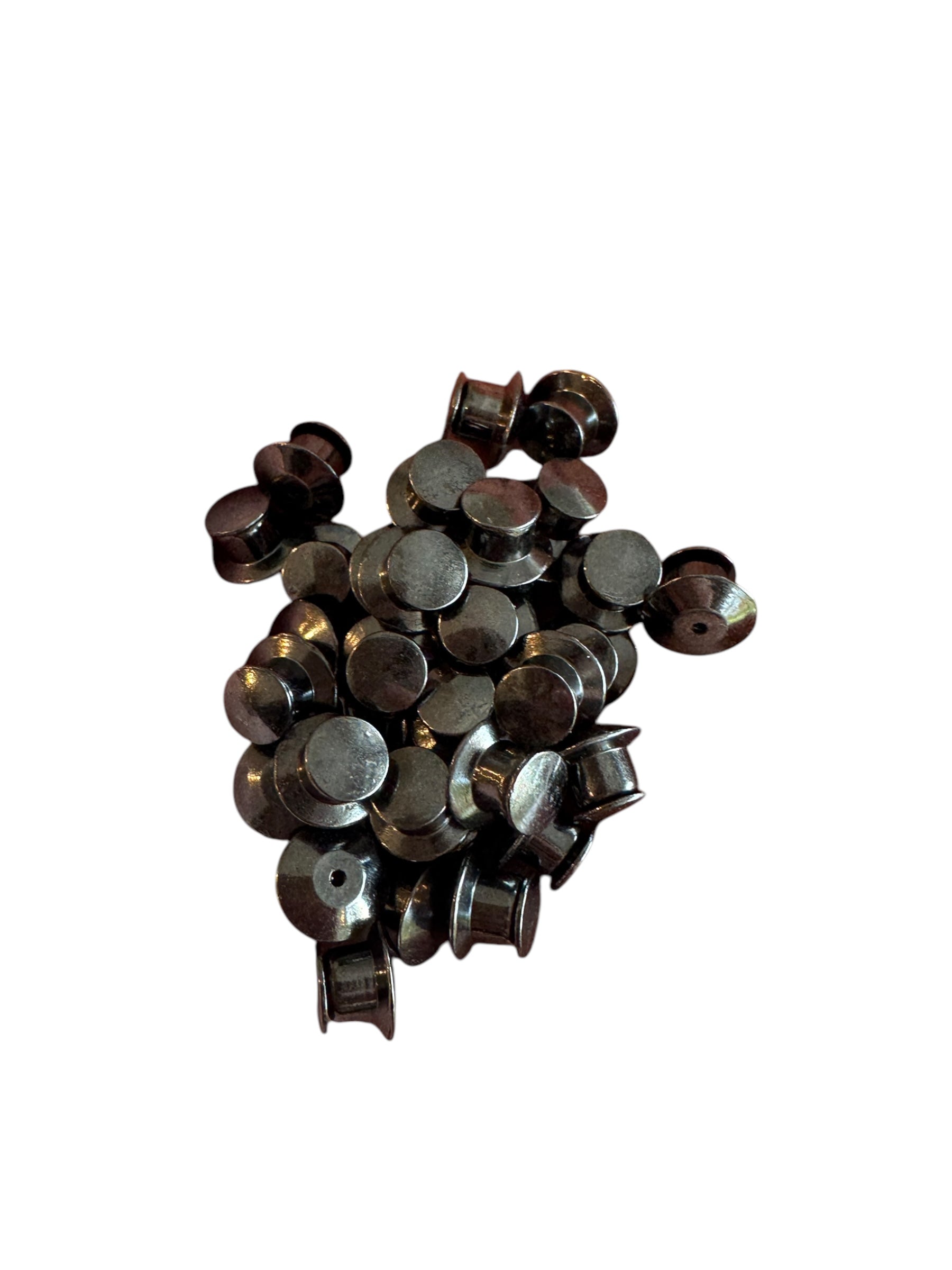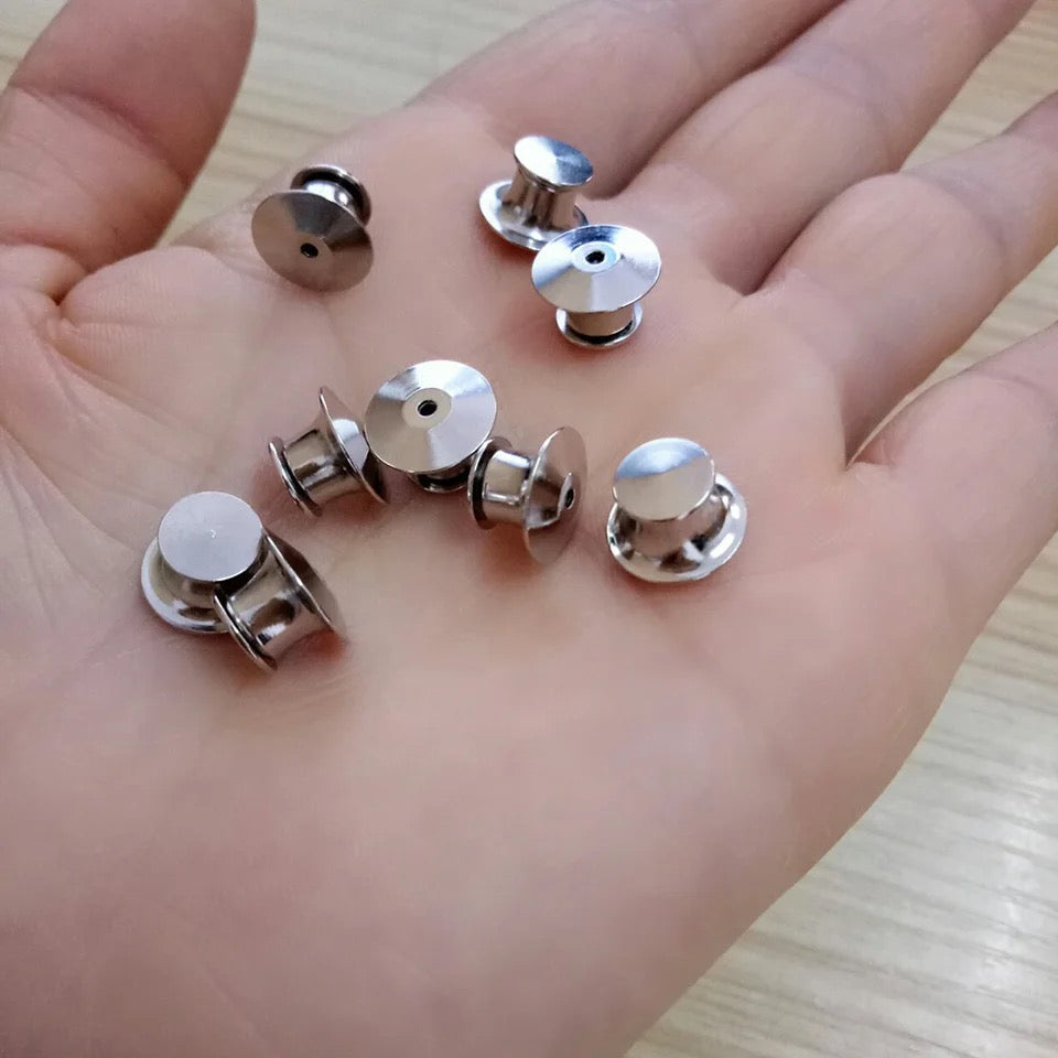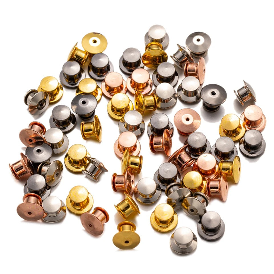 Image Description: The image displays locking pin backs in both gold and silver finishes. The pin backs have a cylindrical shape with a flat, circular top and bottom, featuring a small hole in the center for the pin post. The polished metal surfaces give a sleek and elegant appearance.