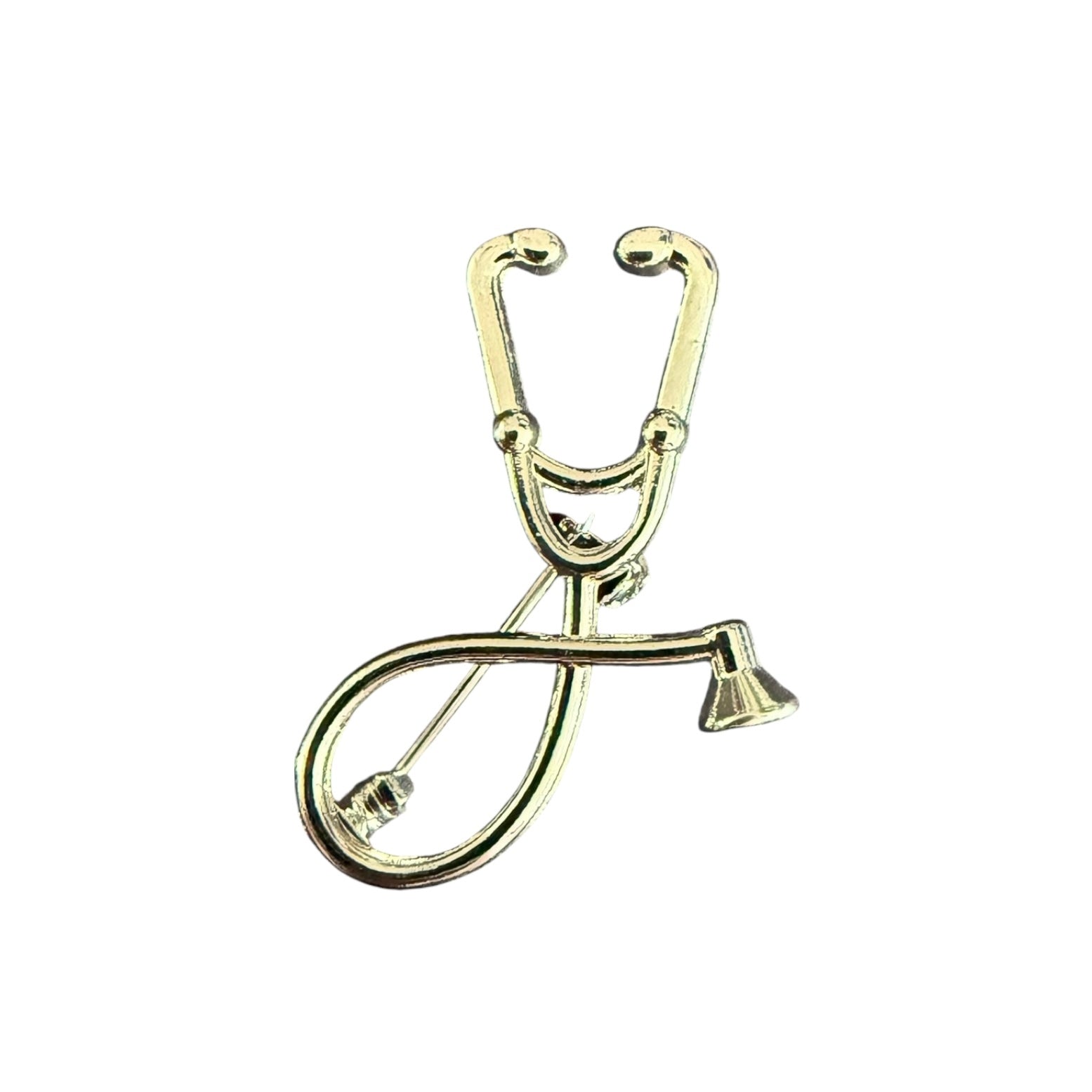 Image Description: A metallic stethoscope-shaped pin, in silver or gold. The design features a looping base and classic earpiece, forming a sleek, minimalist representation of a stethoscope with a shiny finish.