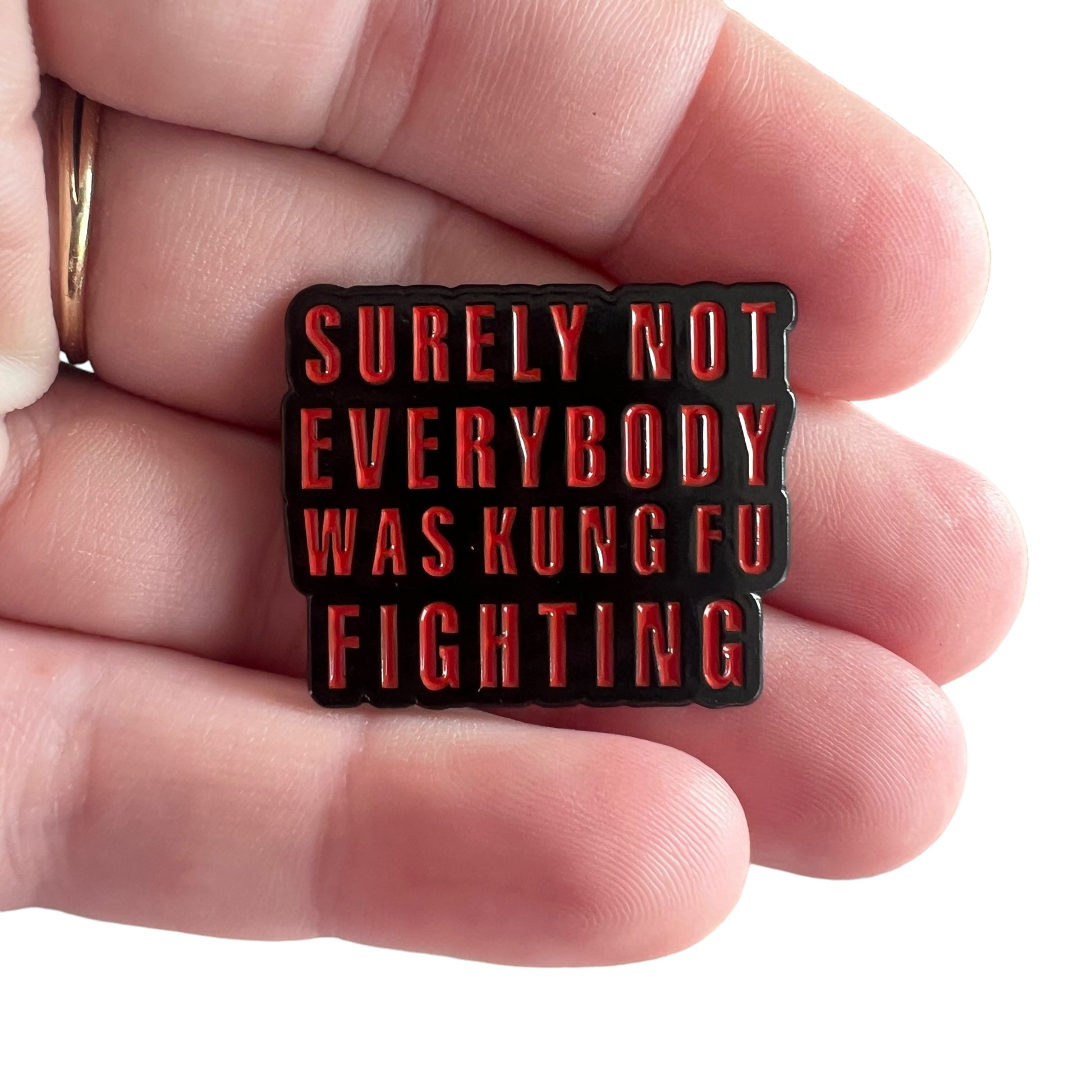 Embrace your humour and individuality with our "Surely Everybody Was Not Kung Fu Fighting" pin. This clever accessory celebrates diversity and uniqueness while playfully referencing the iconic song. Crafted with attention to detail and featuring bold lettering, it's a conversation starter that invites laughter and camaraderie. Whether you're a martial arts enthusiast or simply appreciate a witty twist on a classic, wear this pin proudly to showcase your personality and spread good vibes wherever you go.