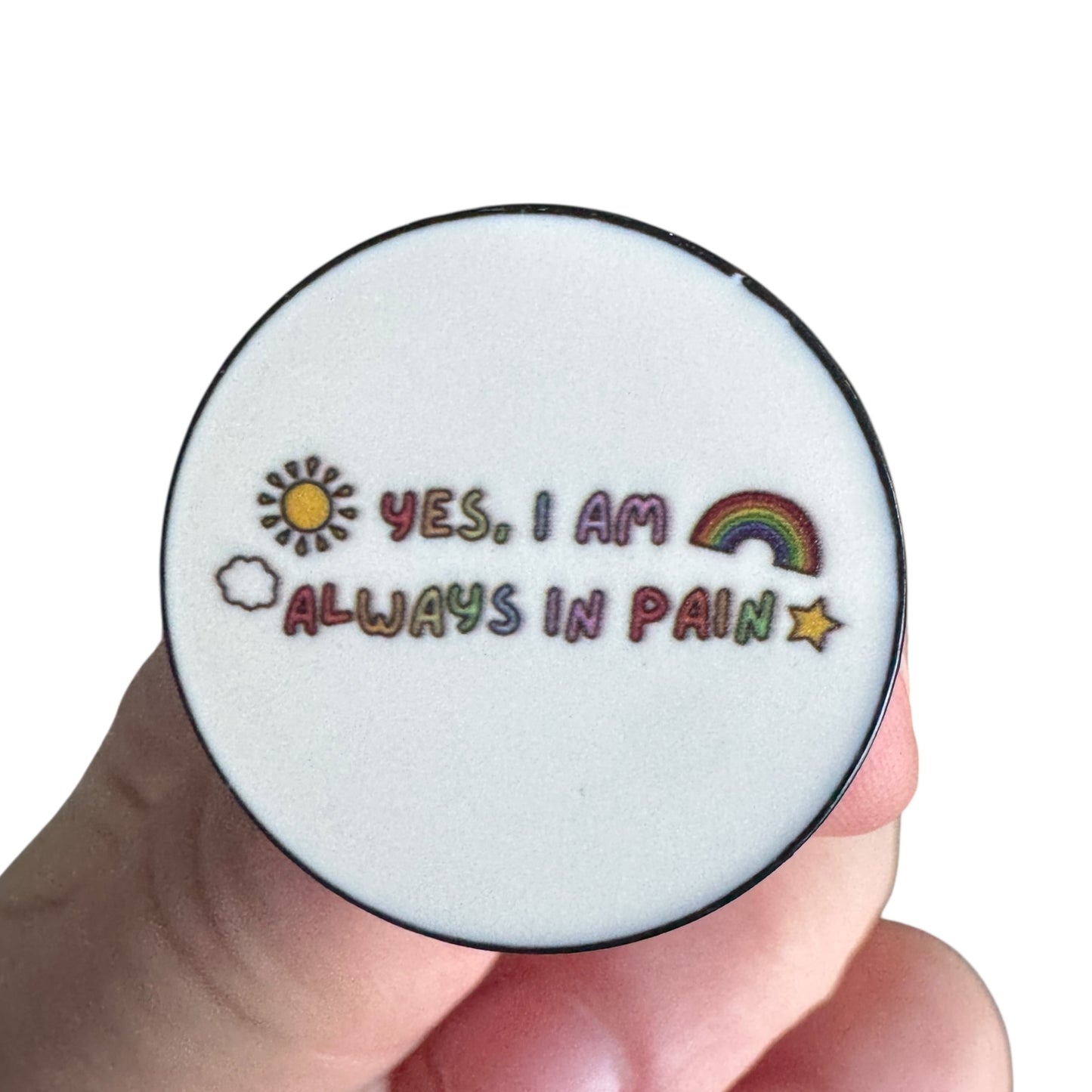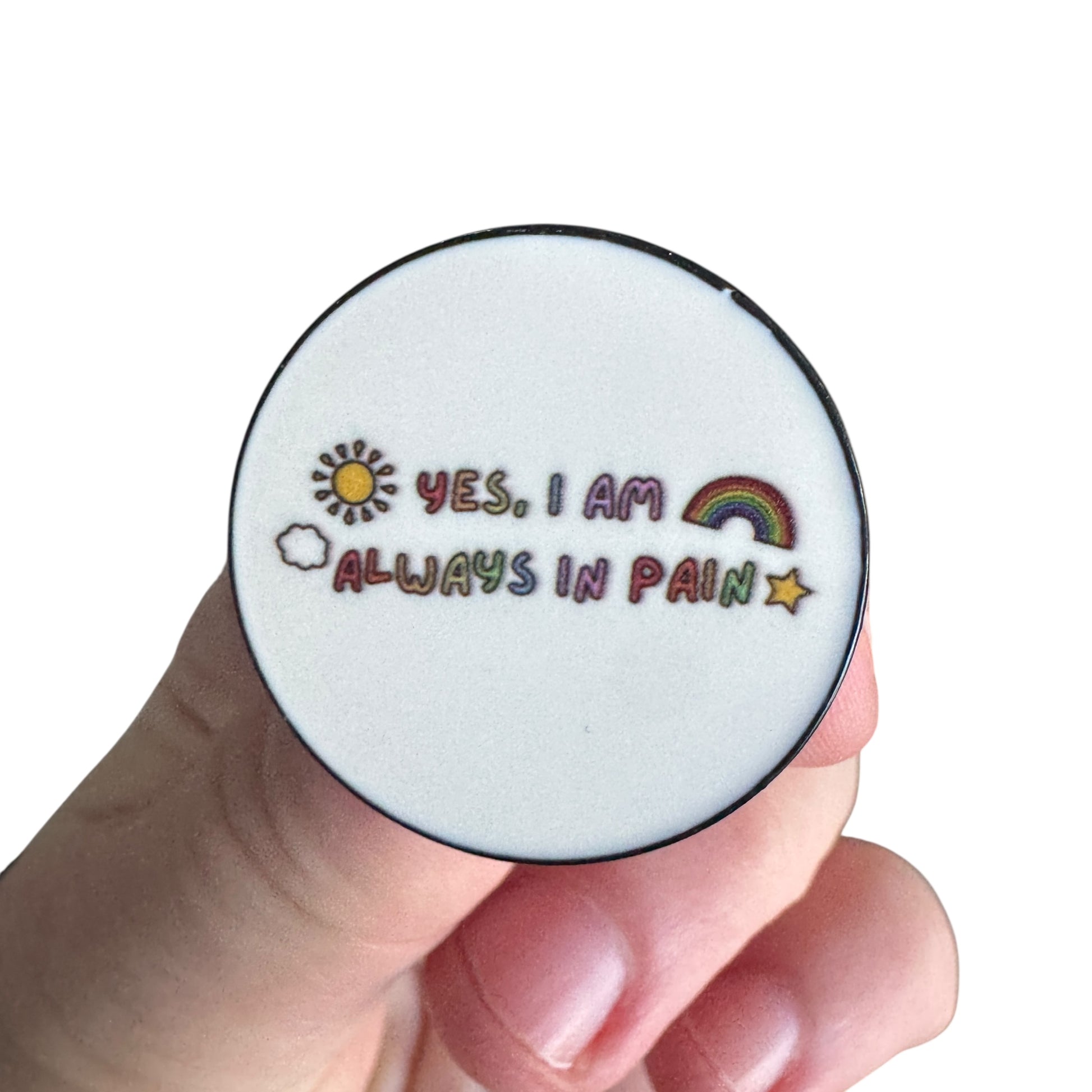 Image Description: A round enamel pin with a white background. In colourful text it reads, “Yes, I Am Always in Pain.” The words are surrounded by cheerful doodles: a yellow sun, a rainbow, a cloud, and a star.
