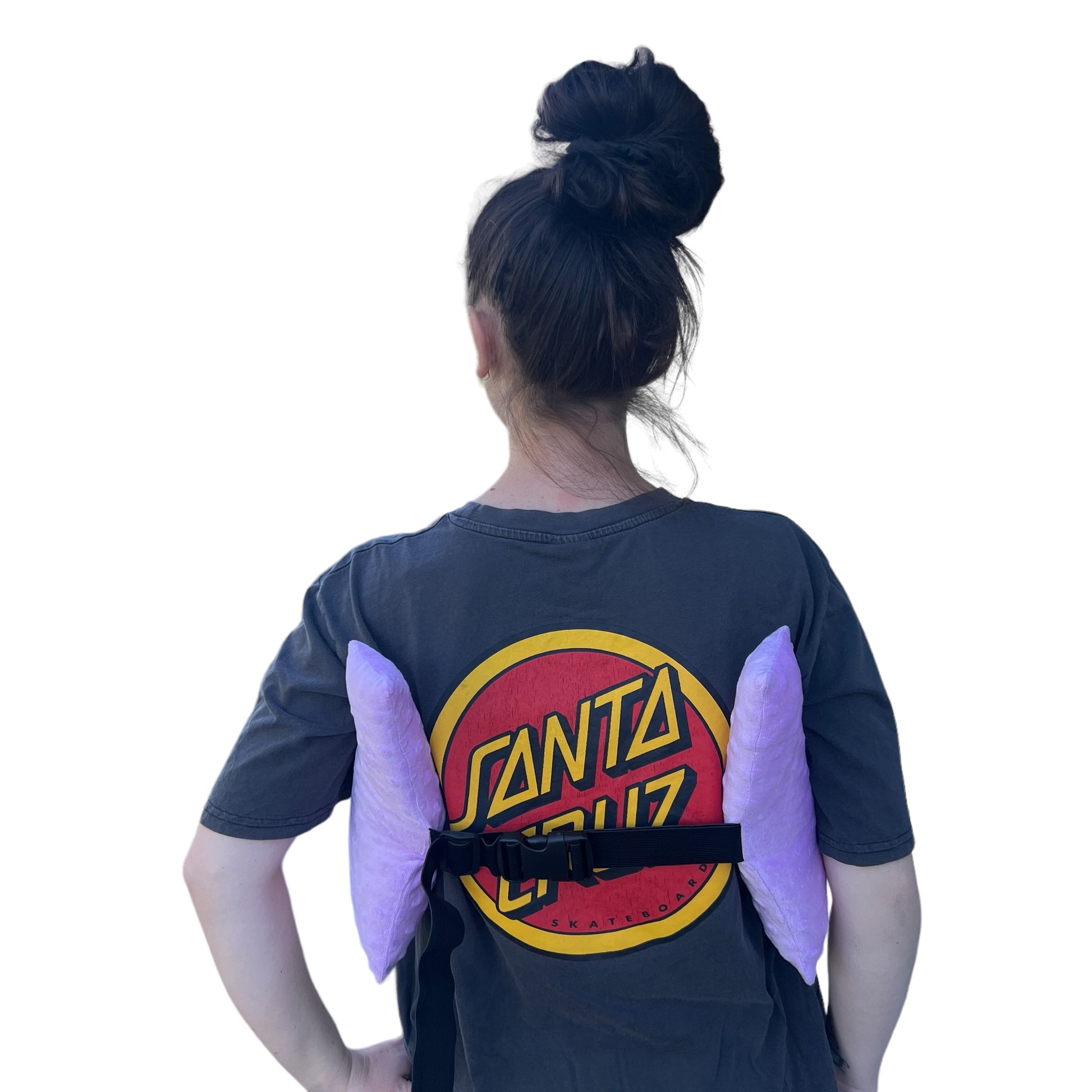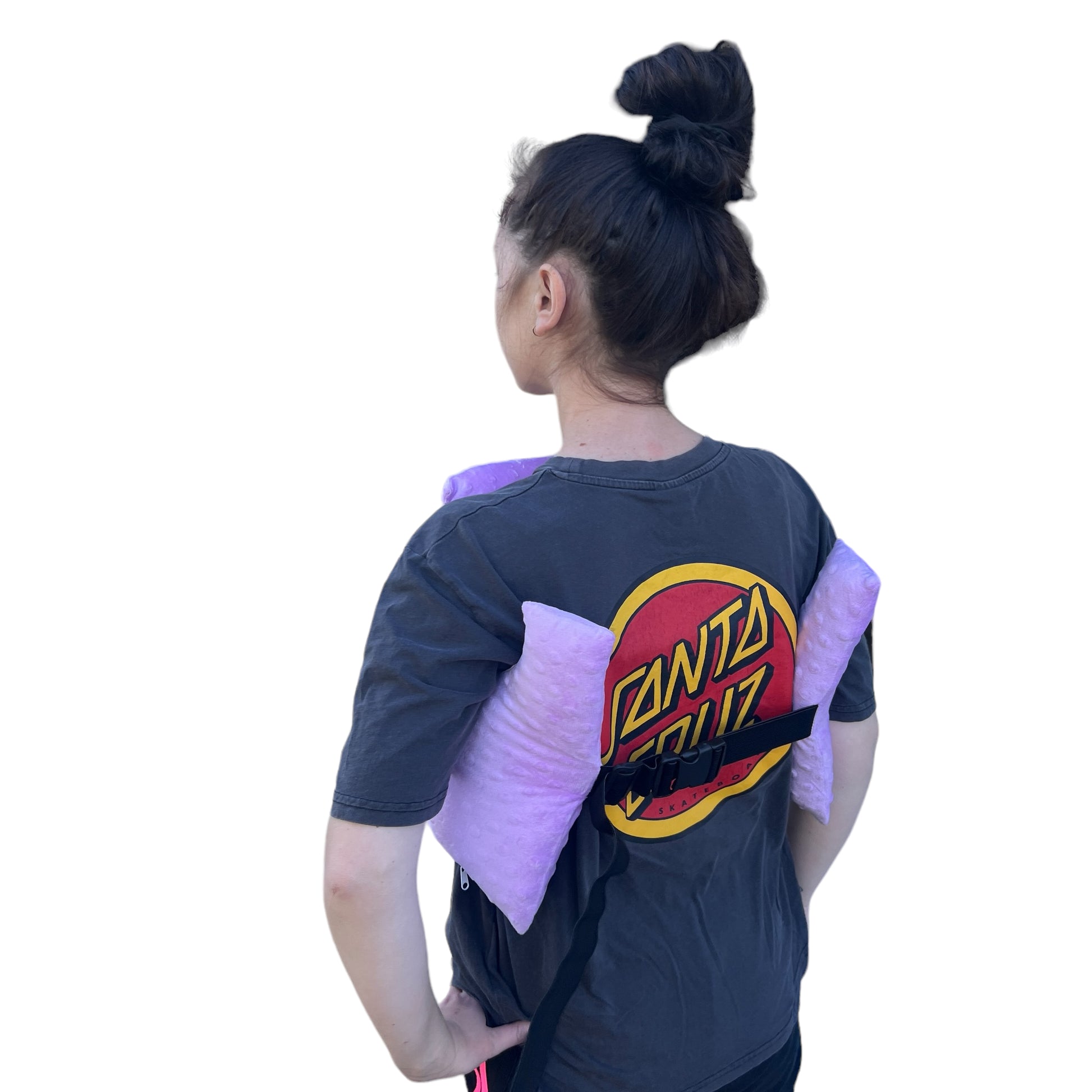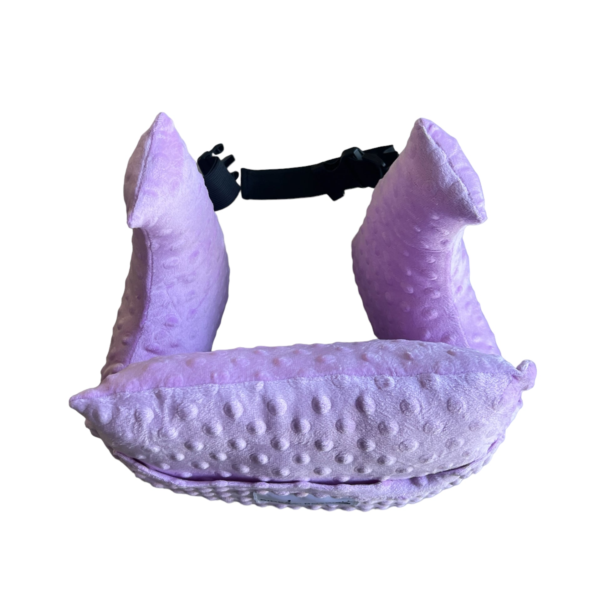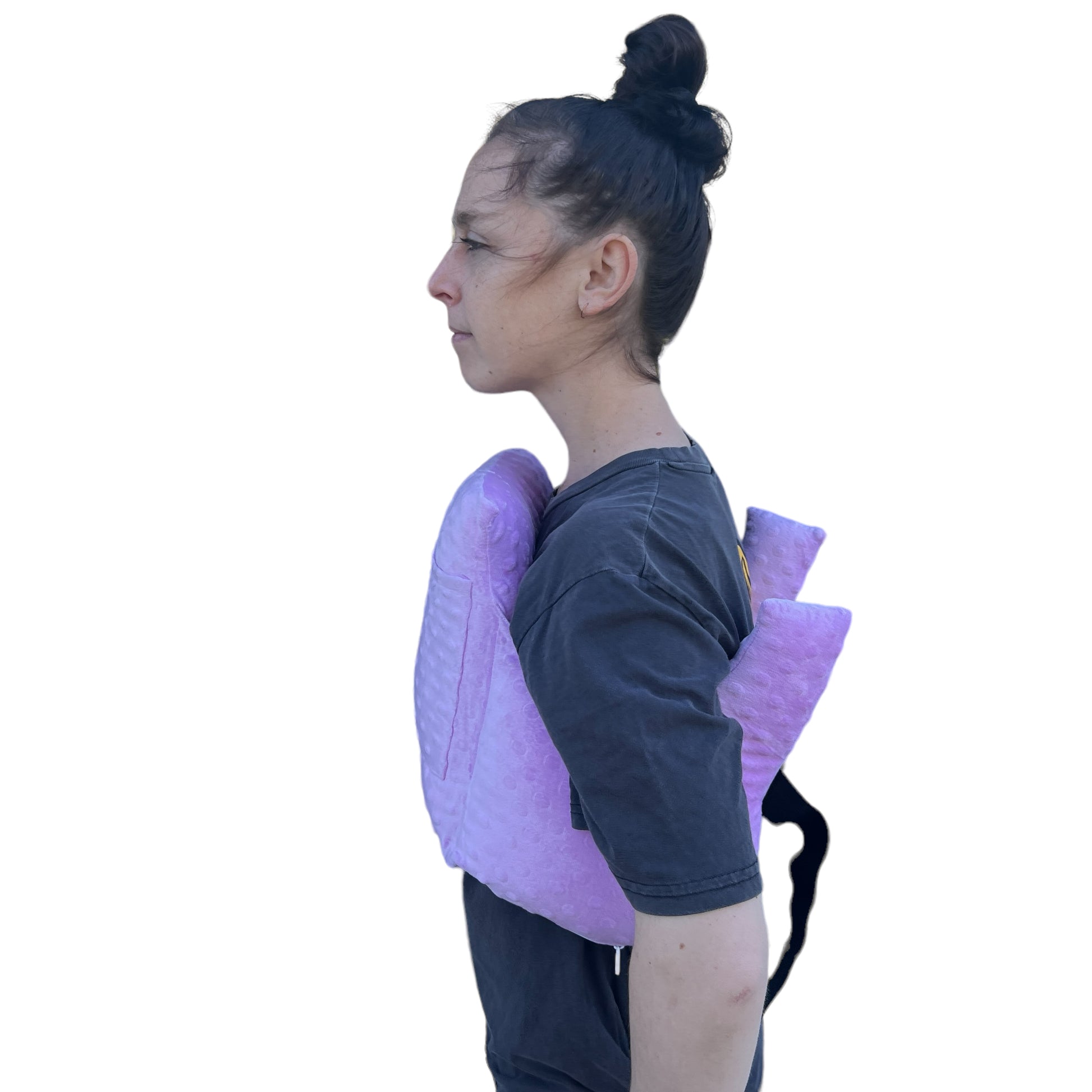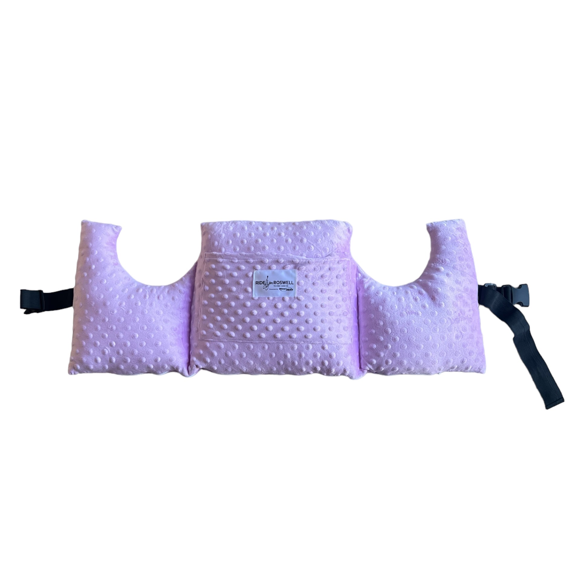 It’s shaped to wrap comfortably around the body, with raised sides to cushion under the arms and a central section that rests softly across the chest or tummy. A handy strap helps keep it in place, and a front and back pocket can hold small essentials like your phone, tissues, or a cold pack.