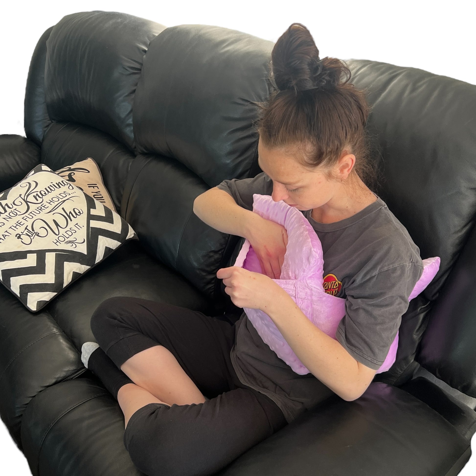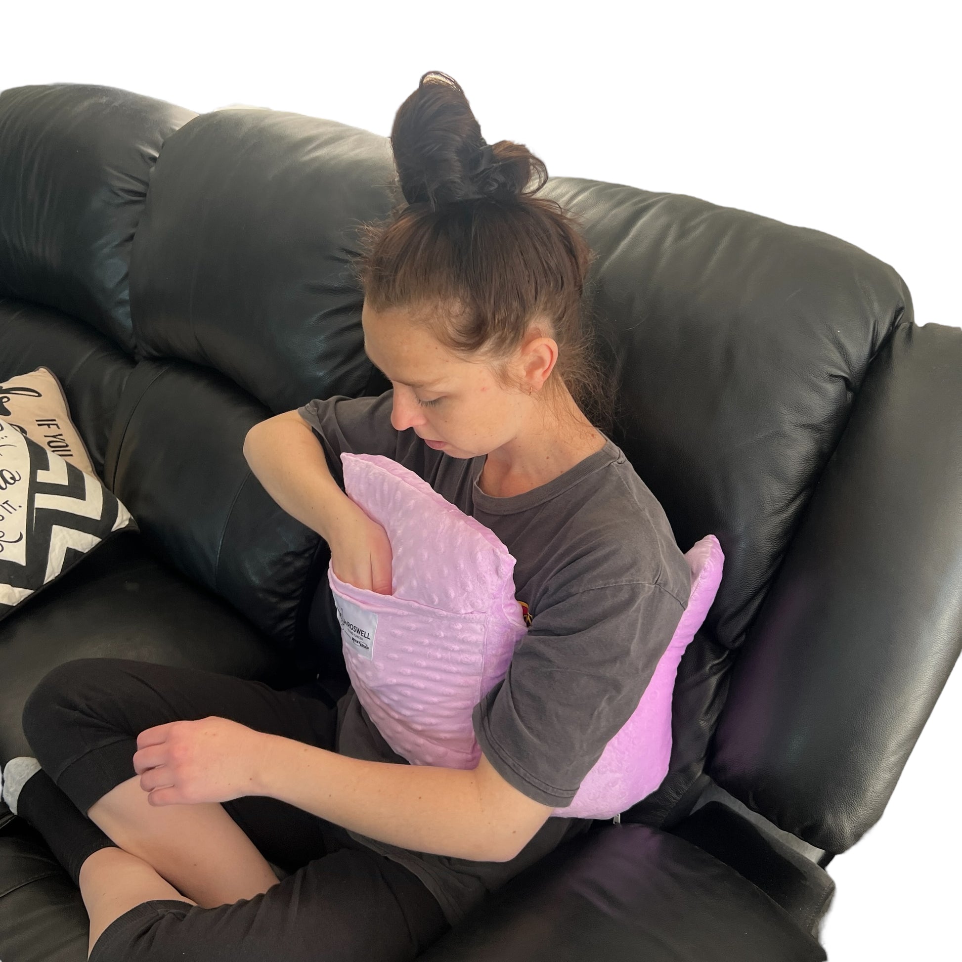 Image Description: A contoured support pillow with two raised side wings, a central cushioned panel, and a front pocket. One image shows the grey version with a chest strap and buckles. Another shows a person using a pink version on the couch, arms resting comfortably with hands inside the pocket.