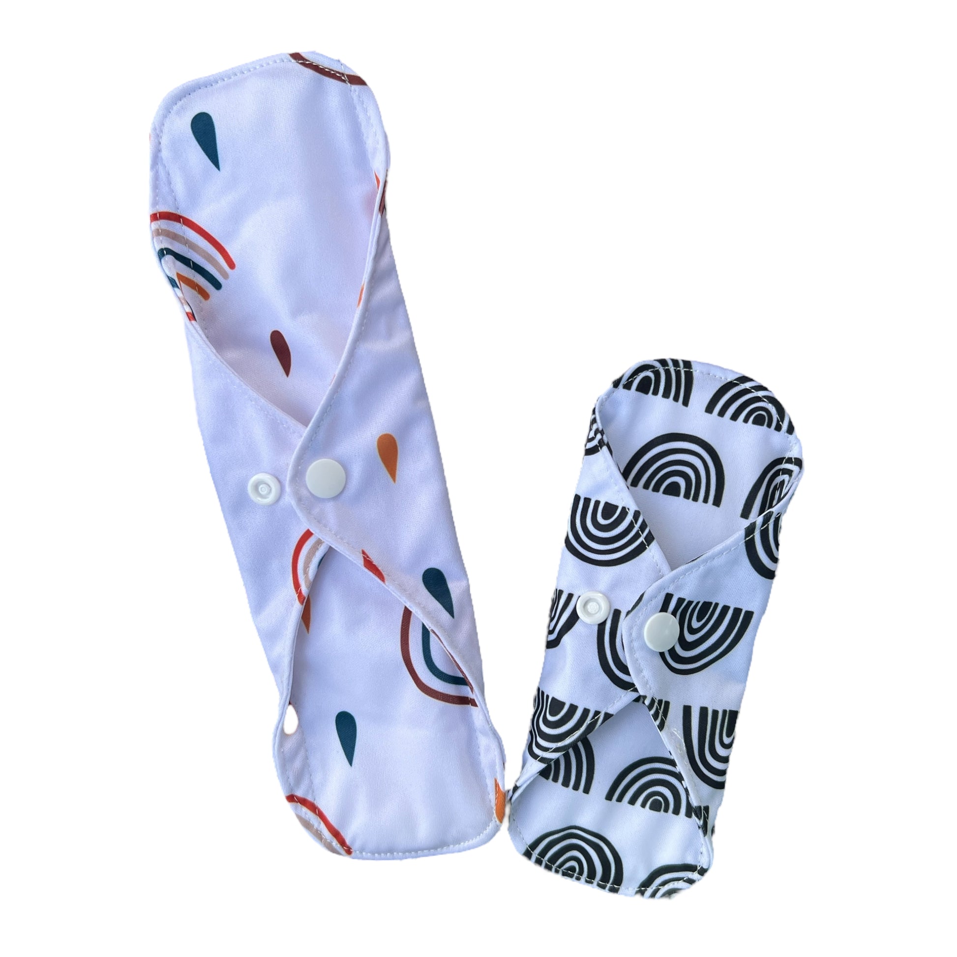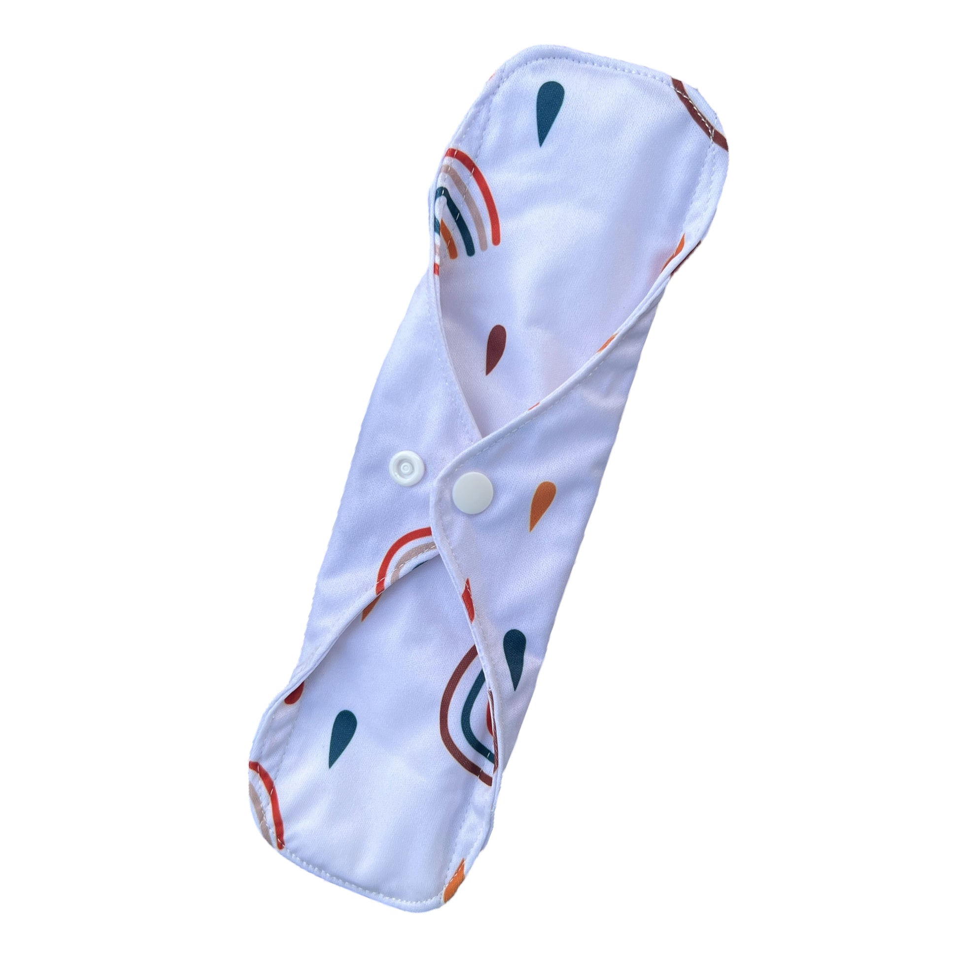 How to use: To use, lay the pad into your knickers, and wrap the wings around your knickers and snap into place (see video for step by step instructions). When the pad has been used, unclip the pad from around your knickers. Fold the pad info thirds, folding it so that the waterproof liner is on the outside. Once folded info thirds, wrap the wings around the folded sections and snap into place to keep it compacted and in place. Store in your waterproof bag until home.