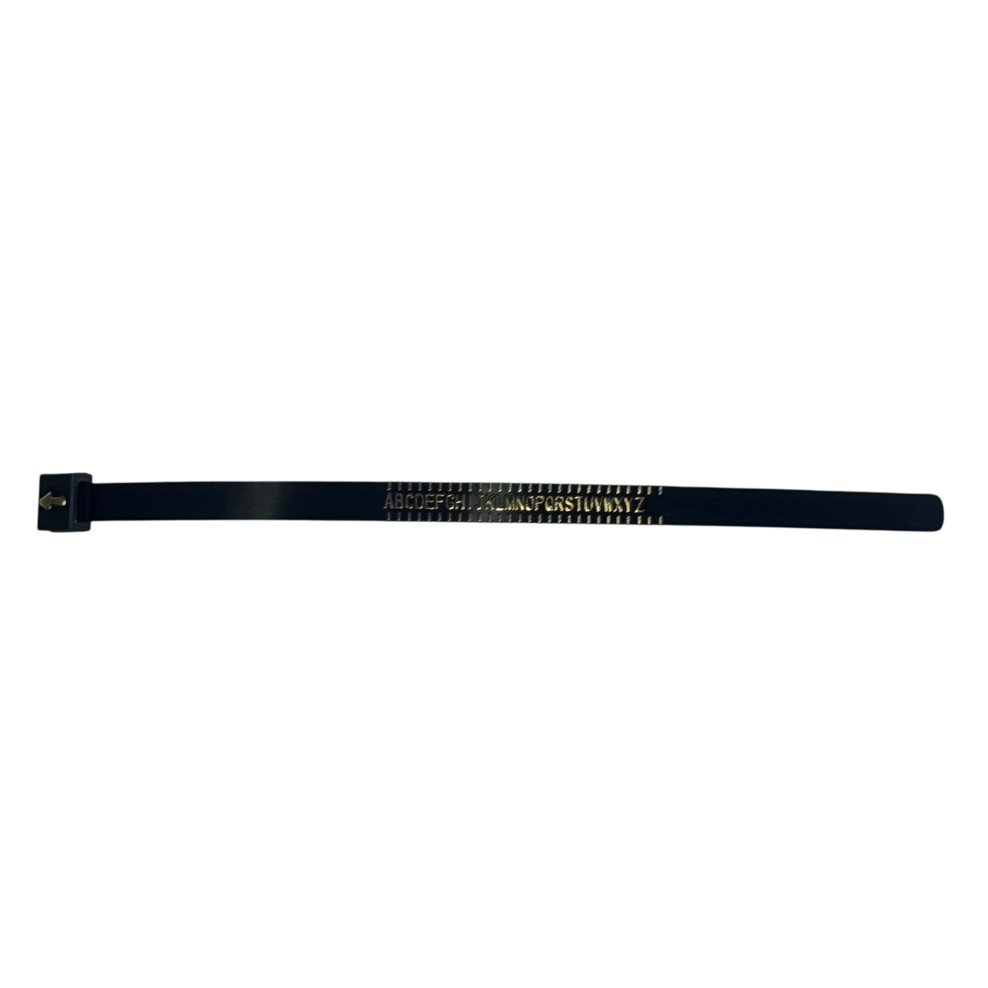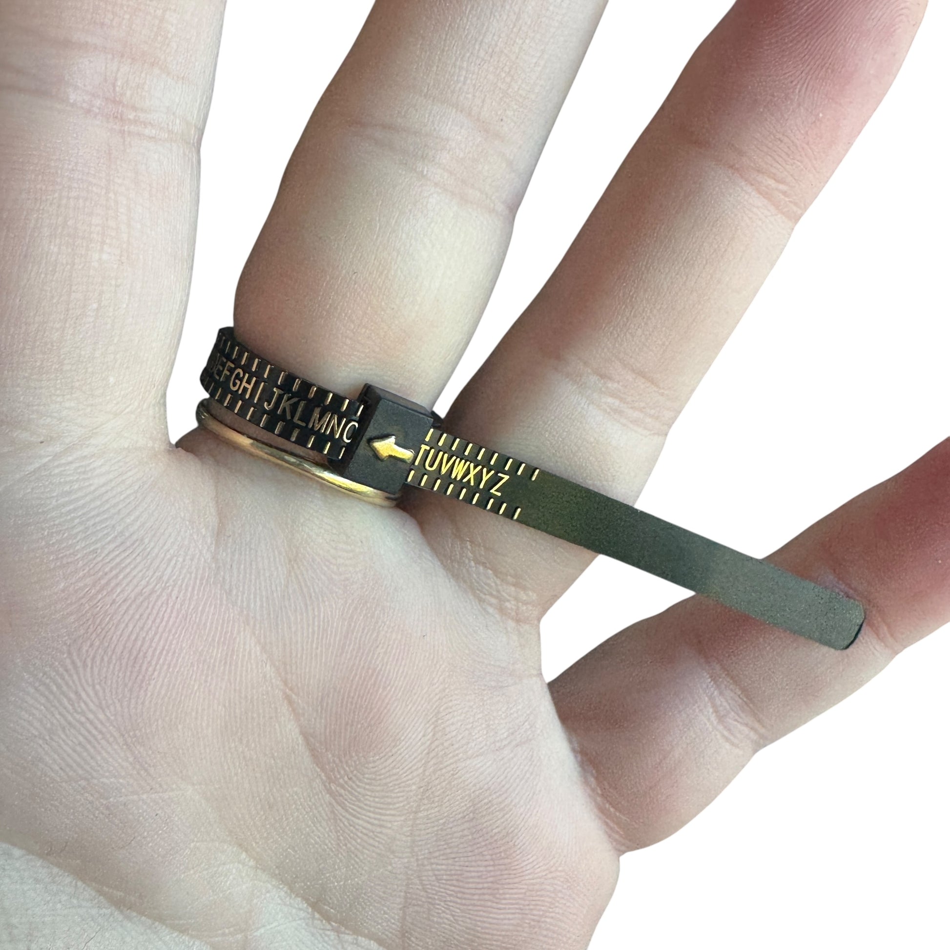 Image Description: A black adjustable plastic ring sizer is shown shaped into a loop, laid flat and on a finger. The sizer features gold letters of the alphabet and measuring markers along the band. A small arrow on the sliding tab indicates the sizing position.
