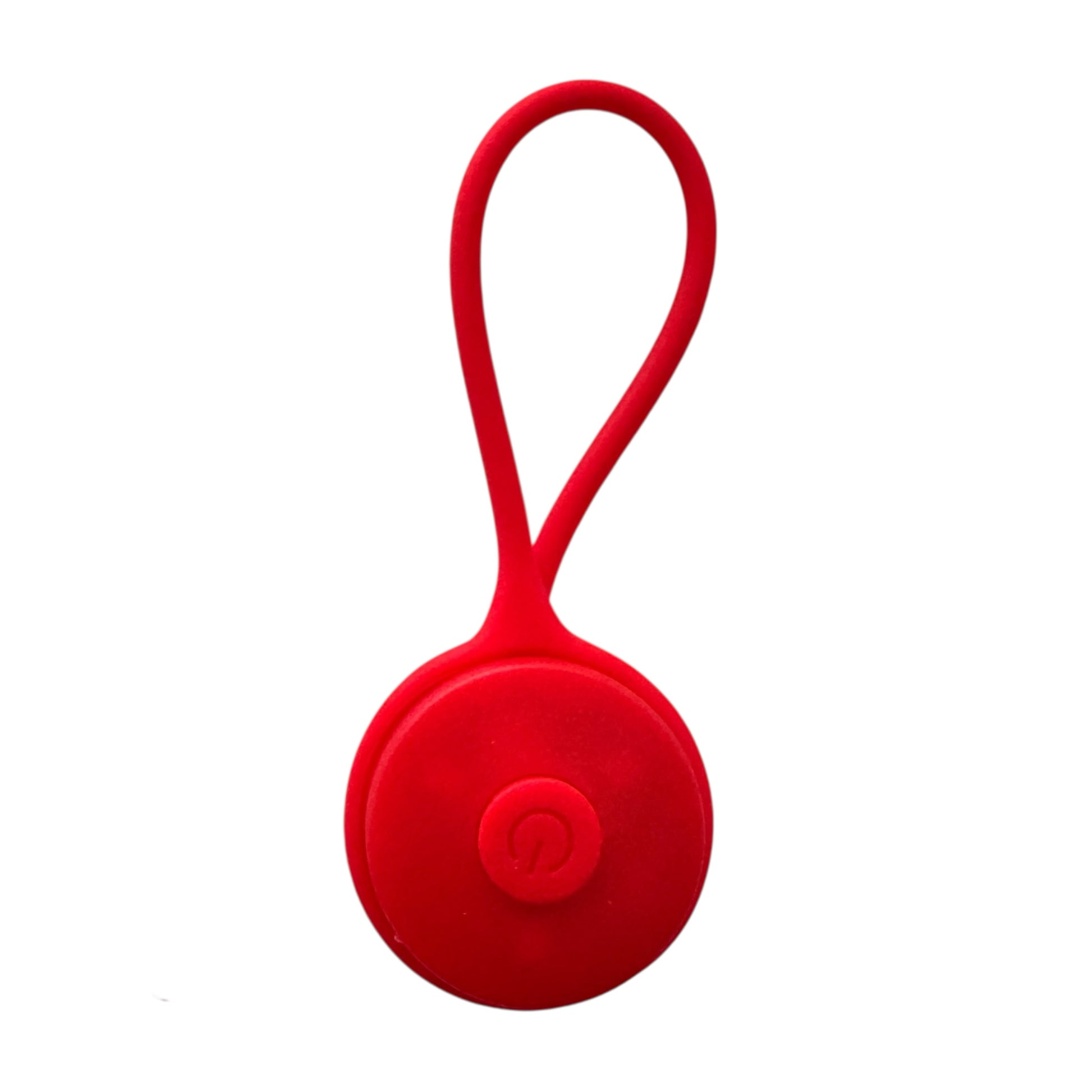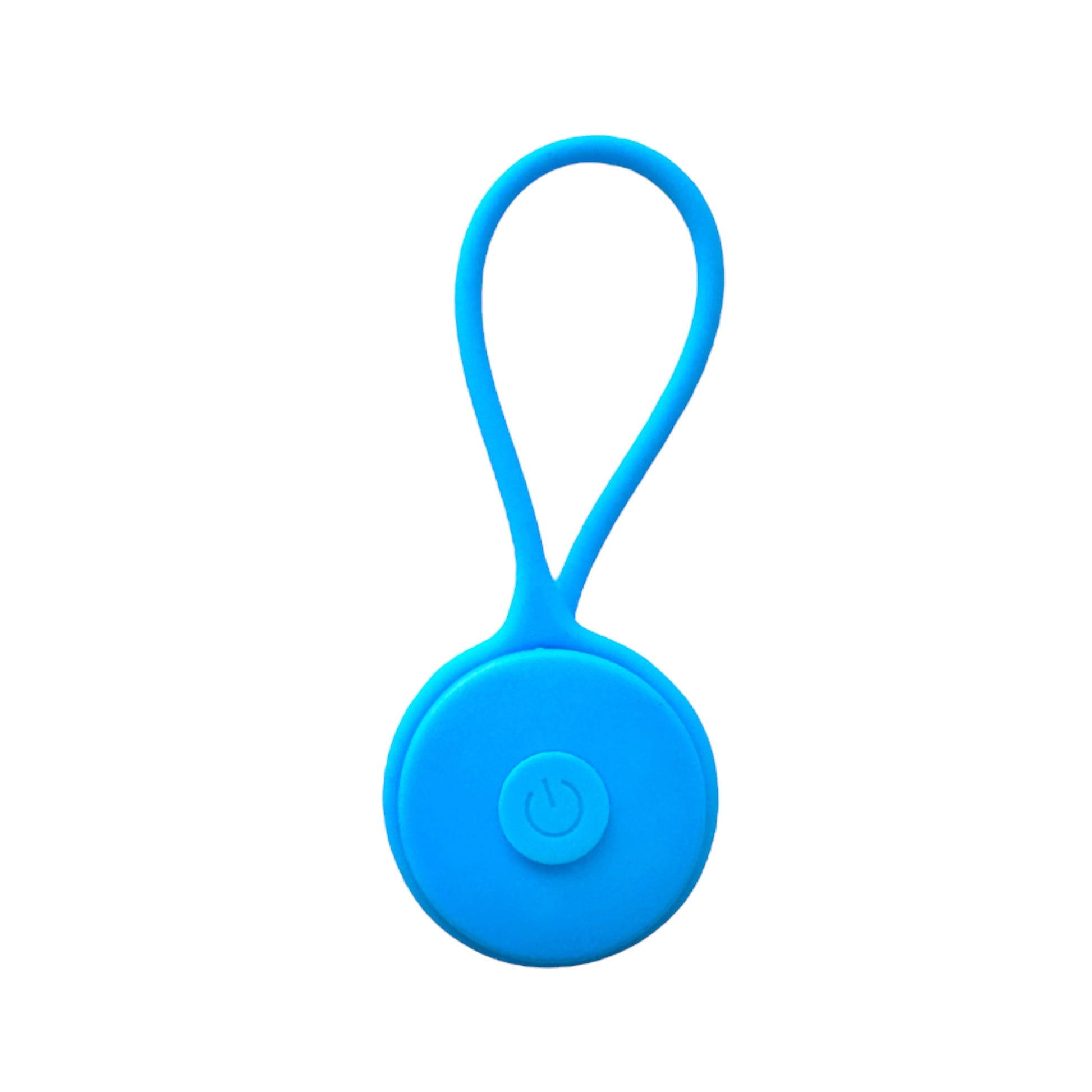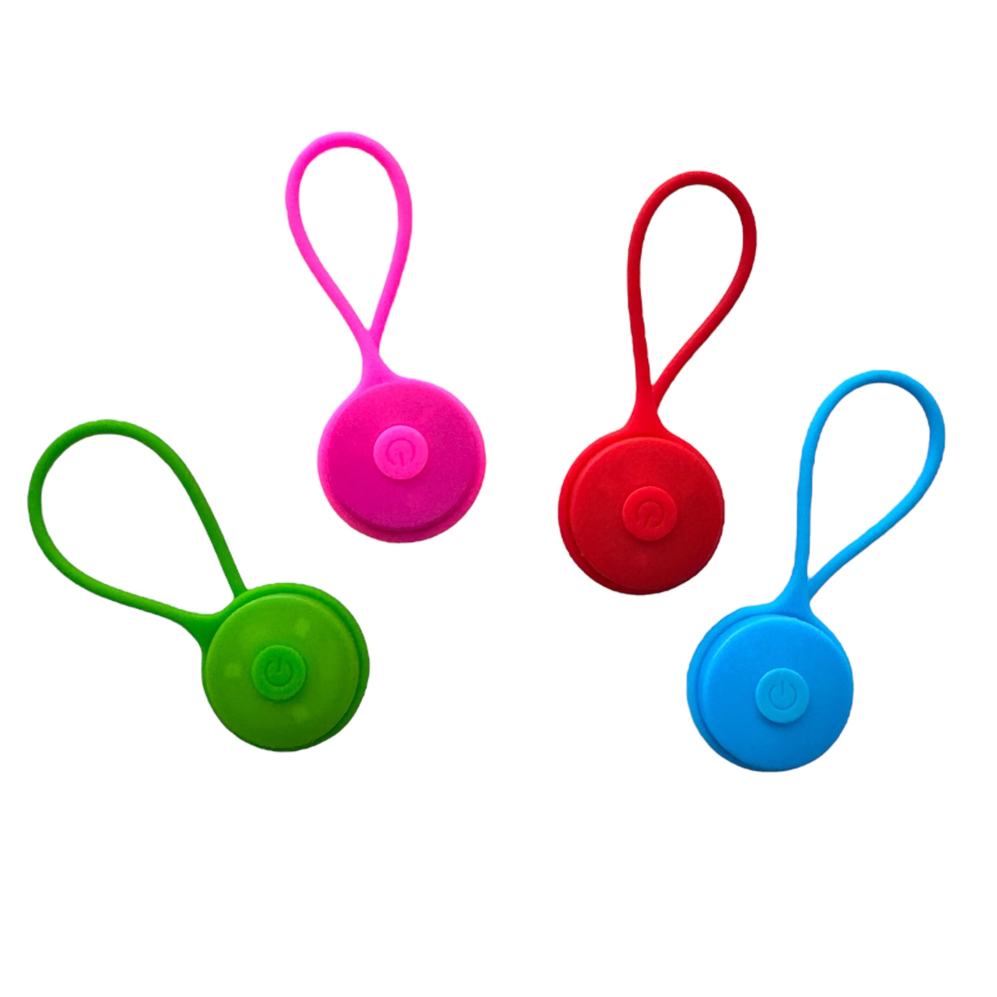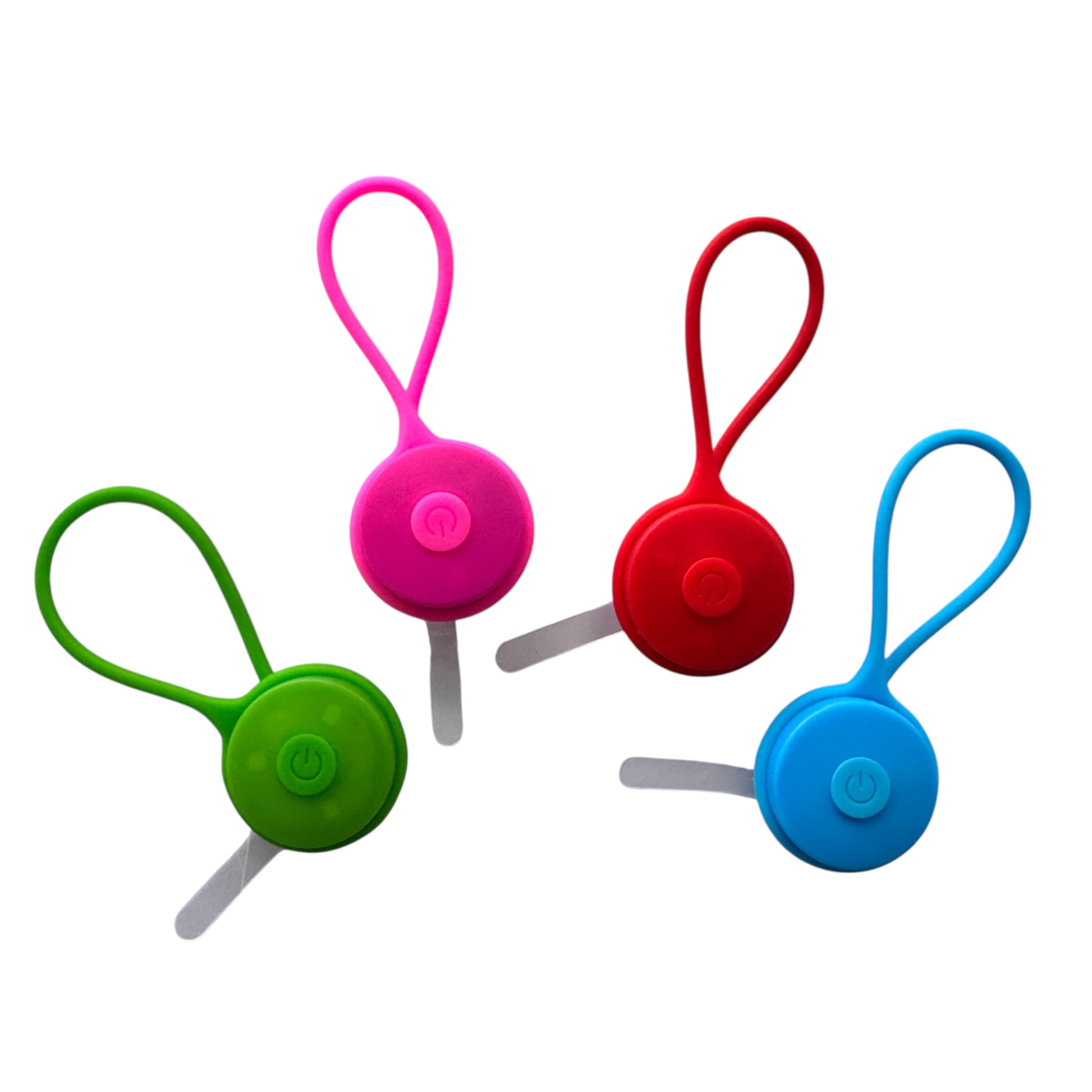 Image Description: Brightly coloured silicone safety lights with flexible loop straps in red, pink, green, and blue. Each light features a soft-touch power button on the front and a slim built-in LED that can flash or shine continuously. Designed to easily loop around bikes, bags, wheelchairs, and more for added visibility in low light or nighttime settings.