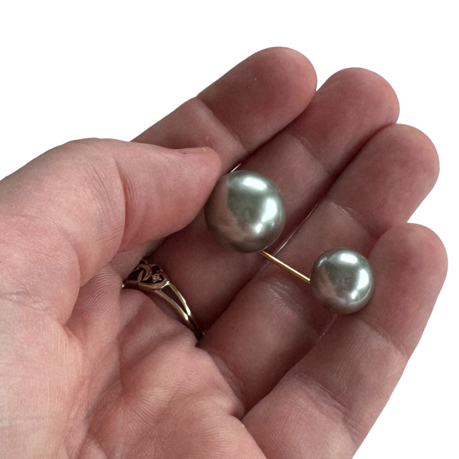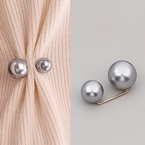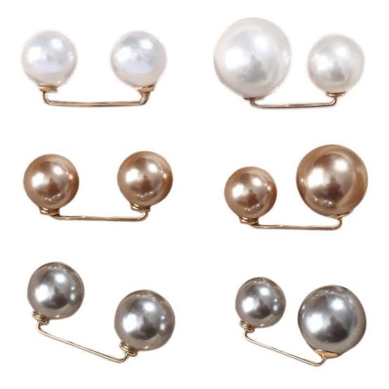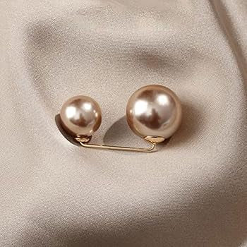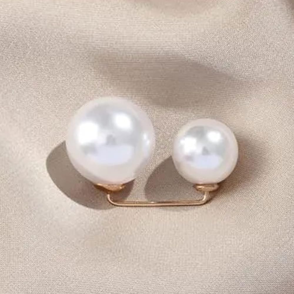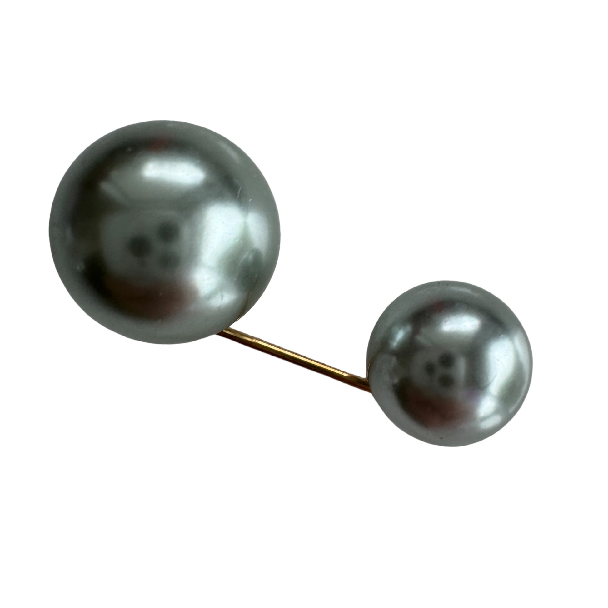 Image Description: A clothing pin featuring two glossy faux pearls connected by a thin gold bar. One pearl is significantly larger than the other, creating a visually balanced design. The pin is compact and curved slightly, intended to slide through fabric for gathering or styling clothing.
