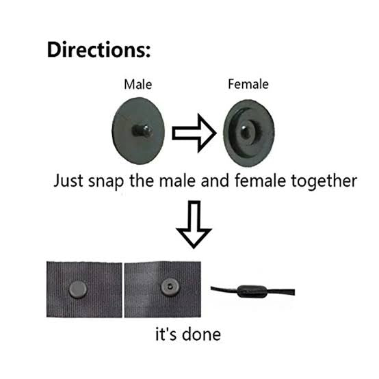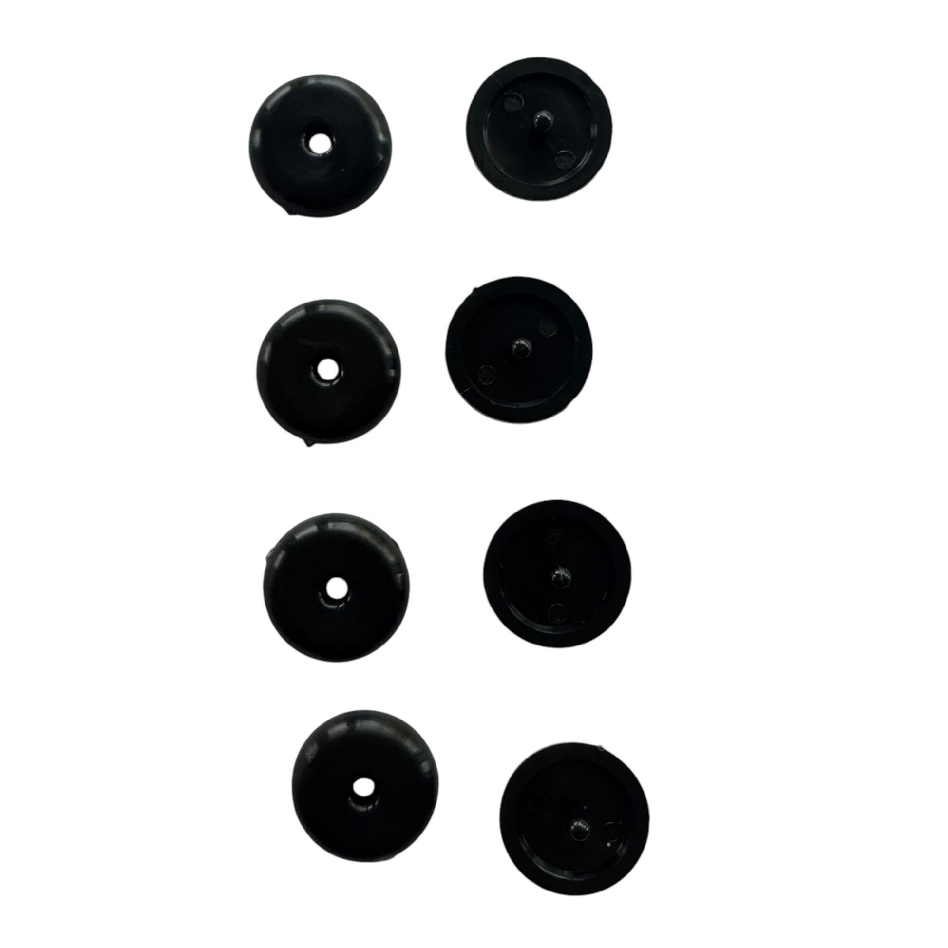 Image Description: A set of small black plastic seatbelt stop buttons, shown beside a car seatbelt strap. The buttons are round with a central pin and are designed to snap around the seatbelt webbing to stop it from retracting too far. One button is pictured already attached to a seatbelt in use, holding the strap in place near the buckle. Additional buttons are displayed in a row to show both front and back sides.