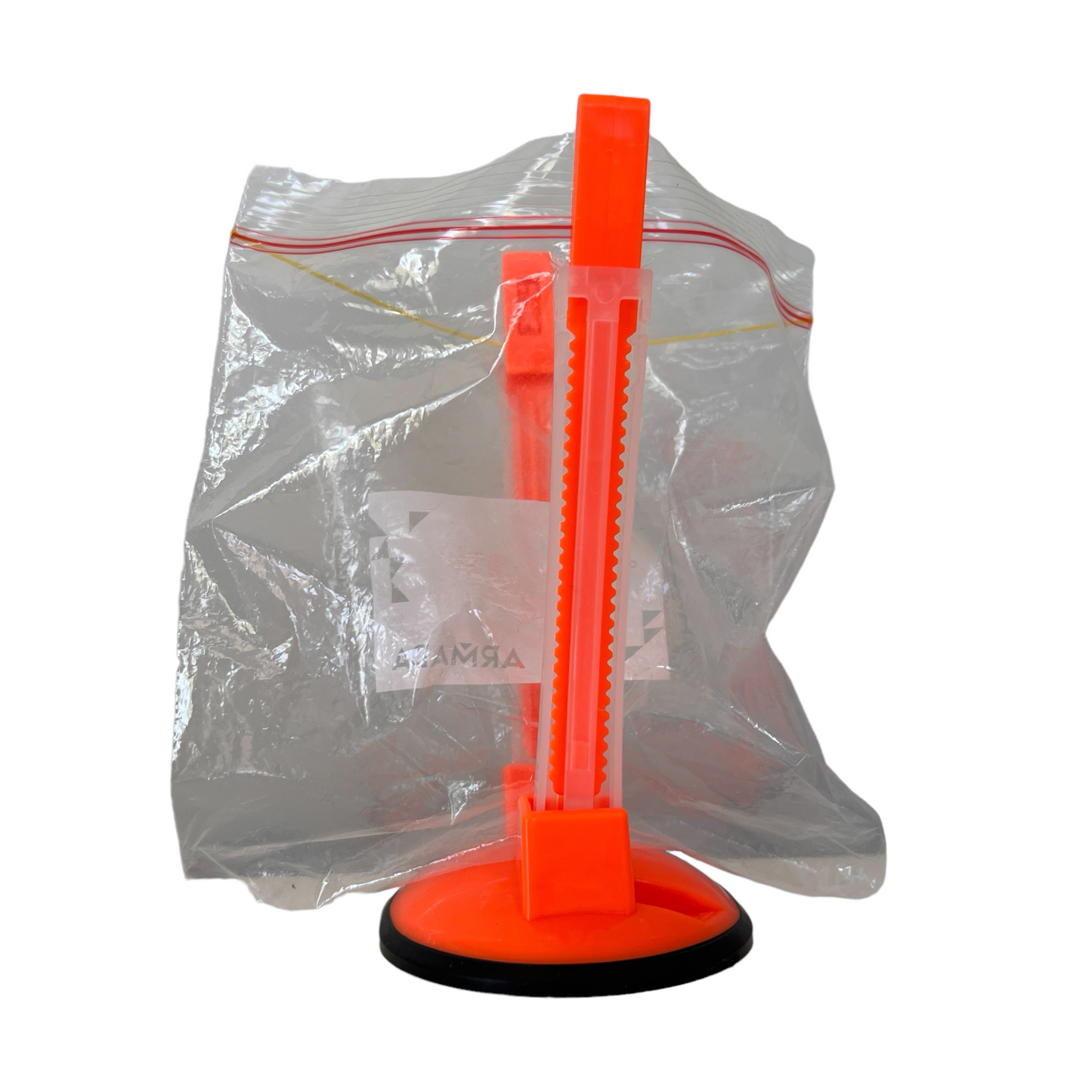1. Adjust the arms to being upright from the base of the product. Place the product on a bench where the rubber base can help to hold it securely in place, and adjust the arms to the height that matches the bags.