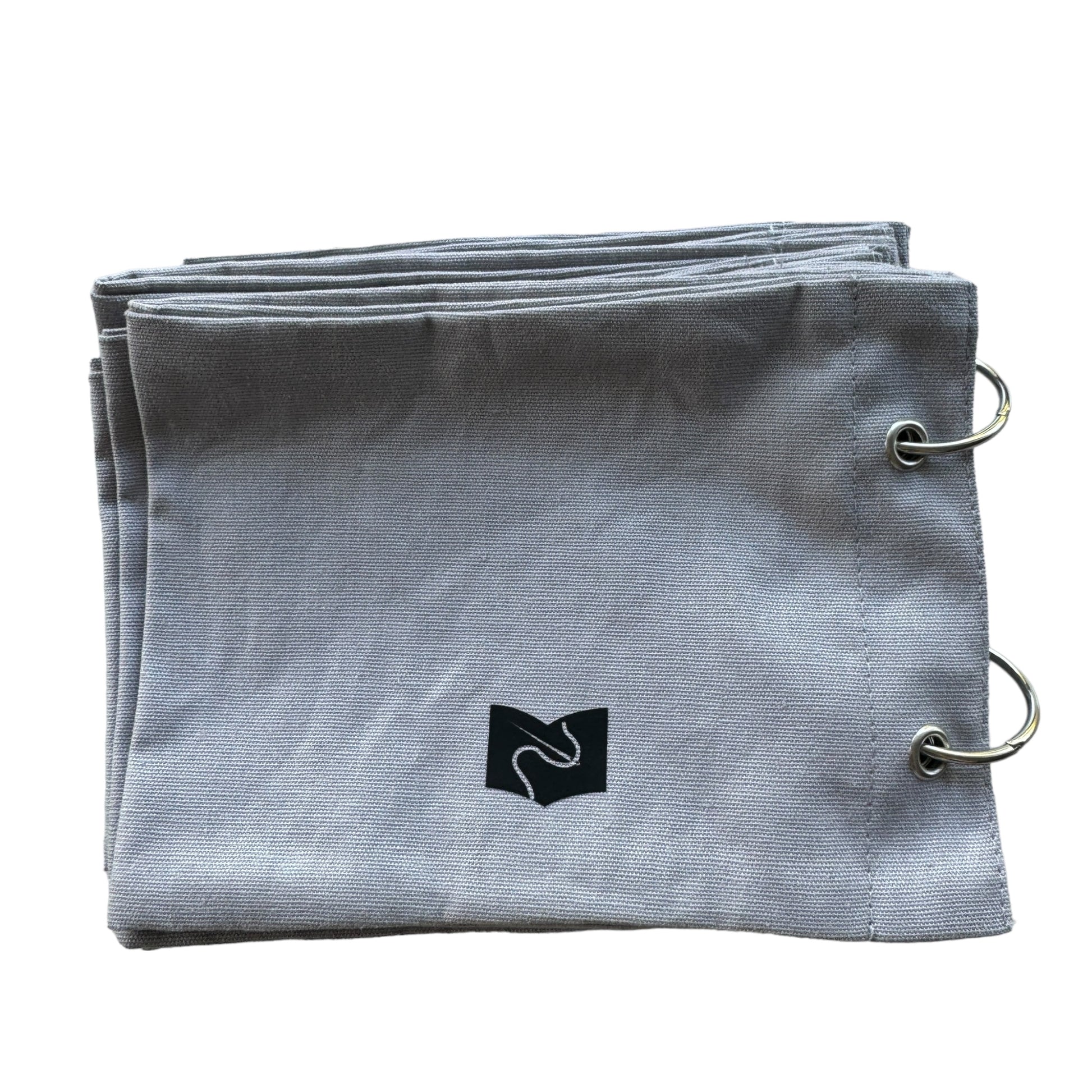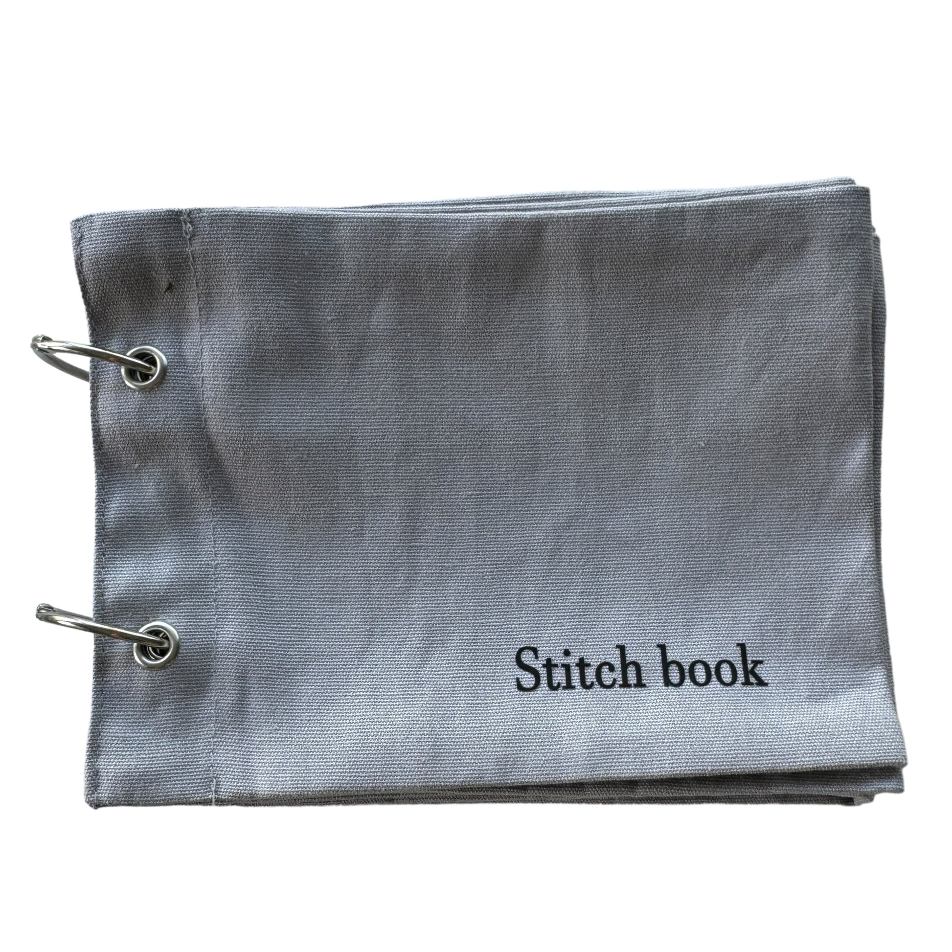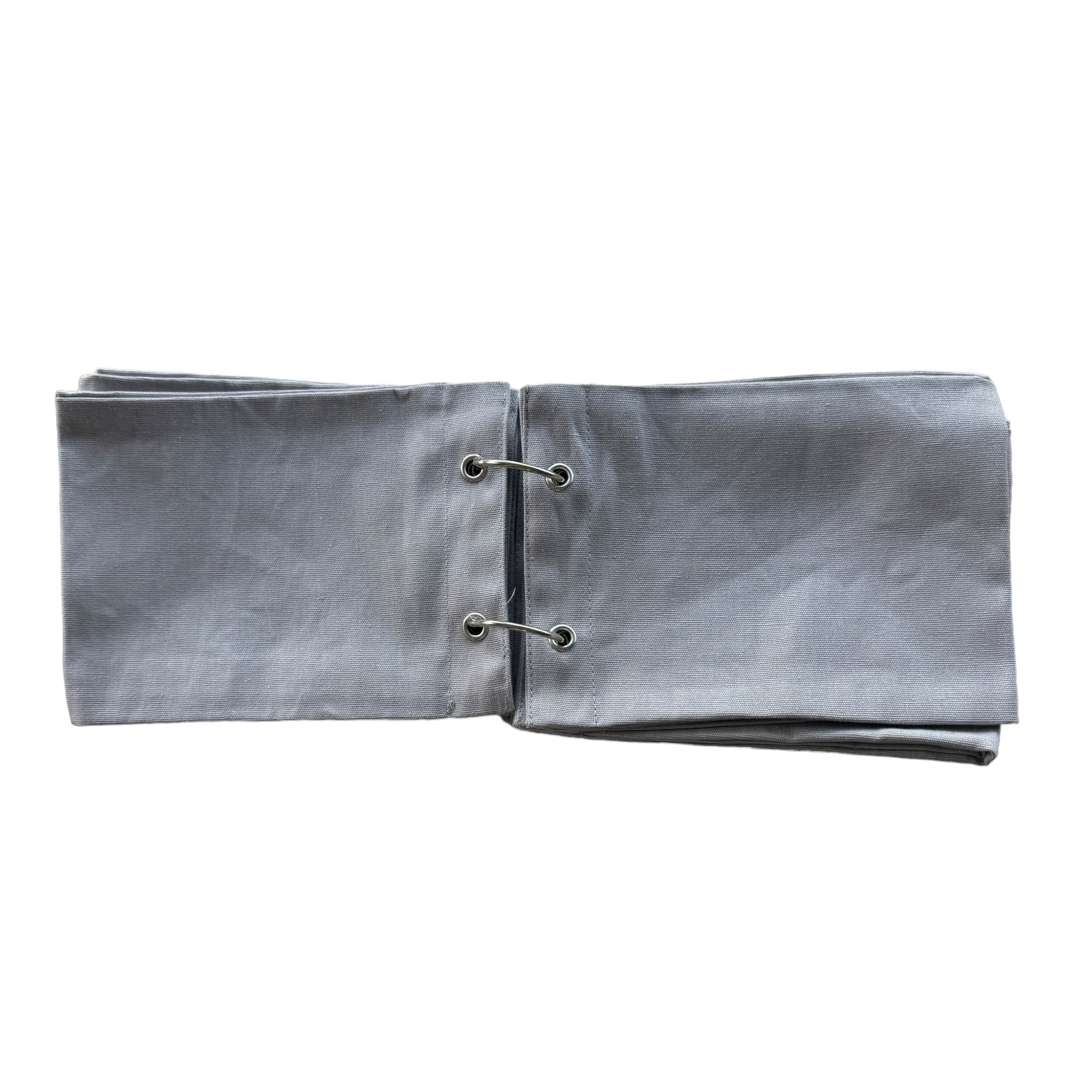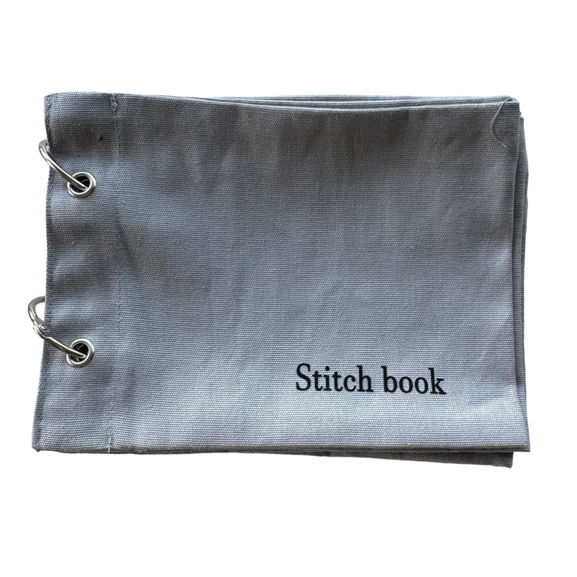 Image DescriptionFabric sketchbook with a plain grey cloth cover, secured with two metal binder rings. Inside are blank fabric pages ready for embroidery, stitching, or decoration.