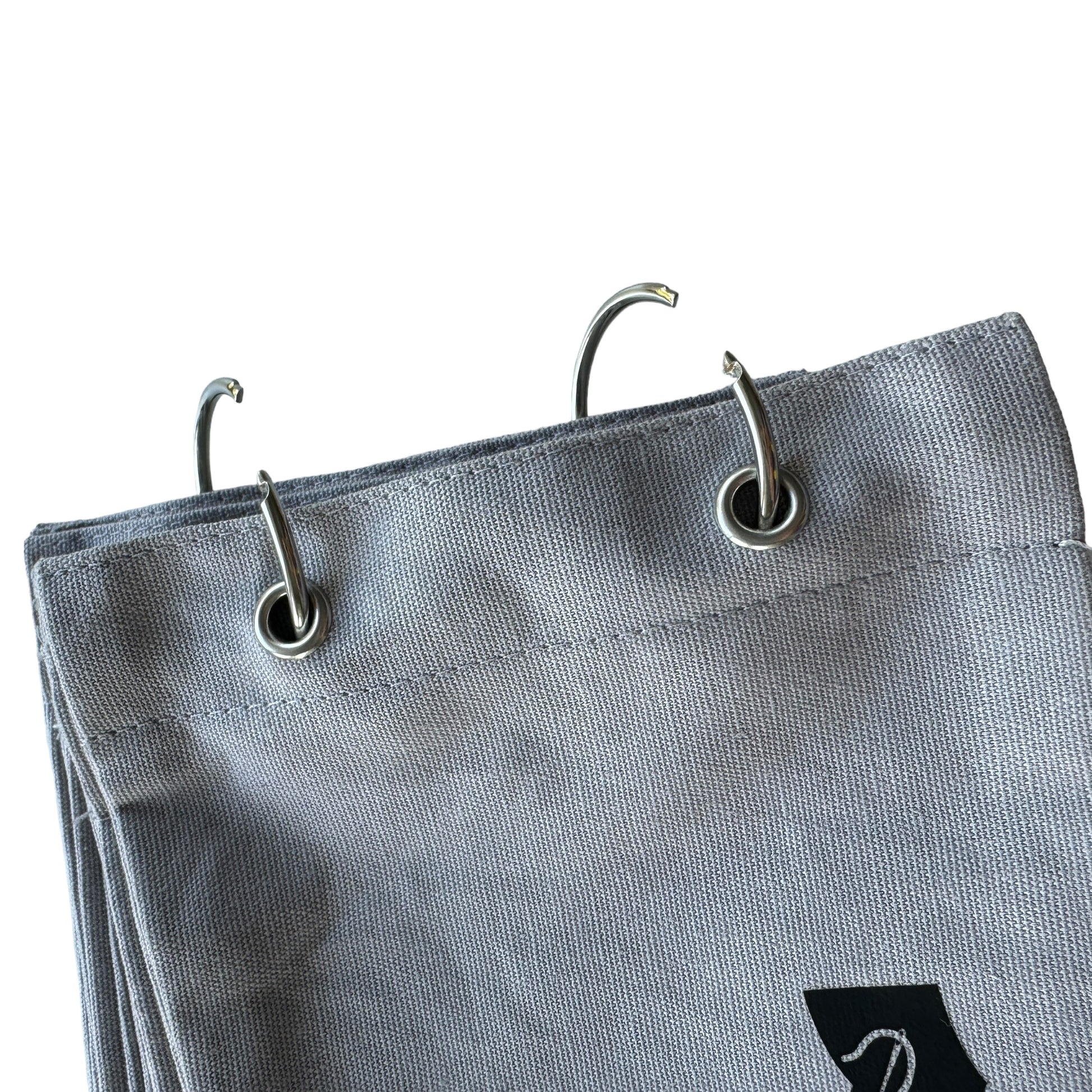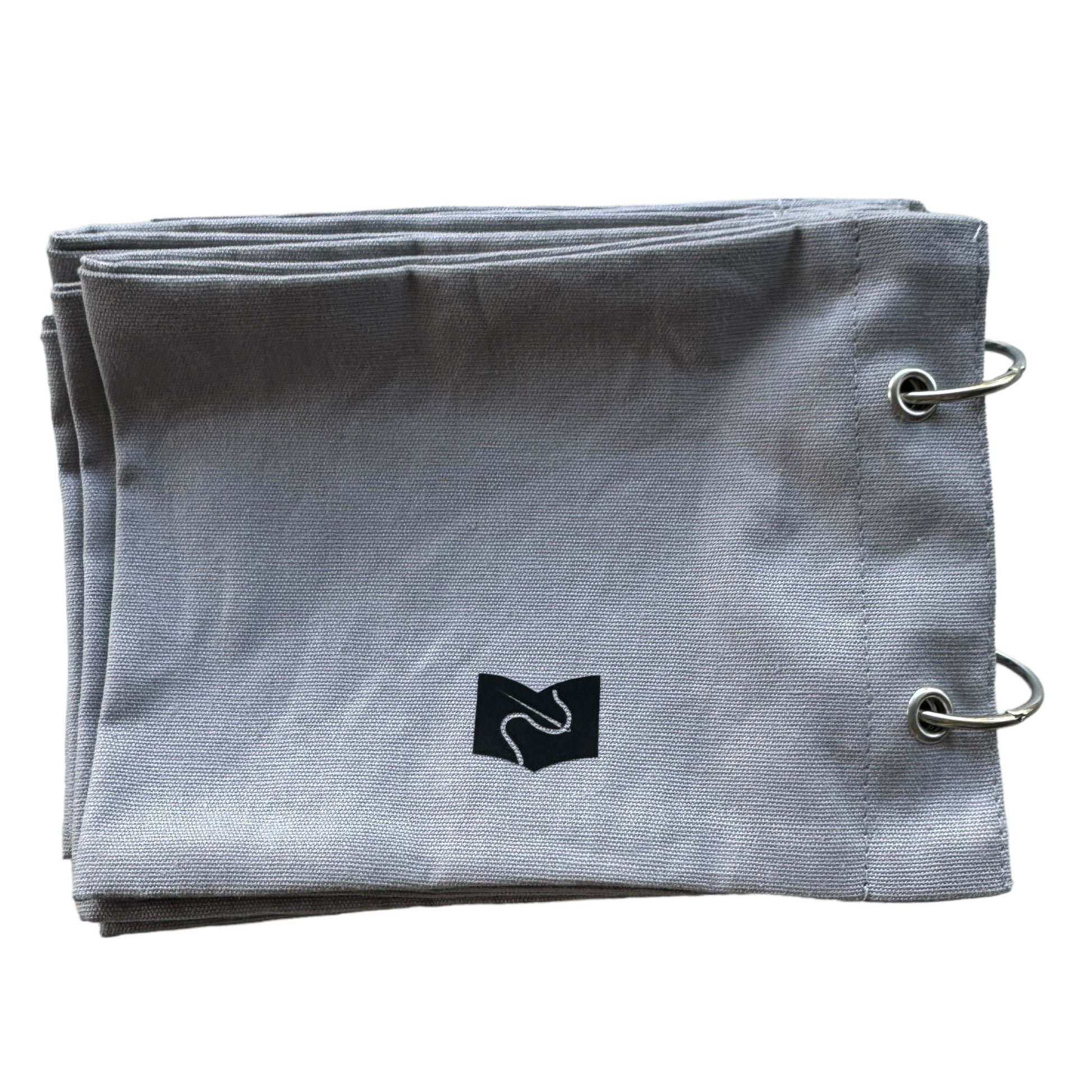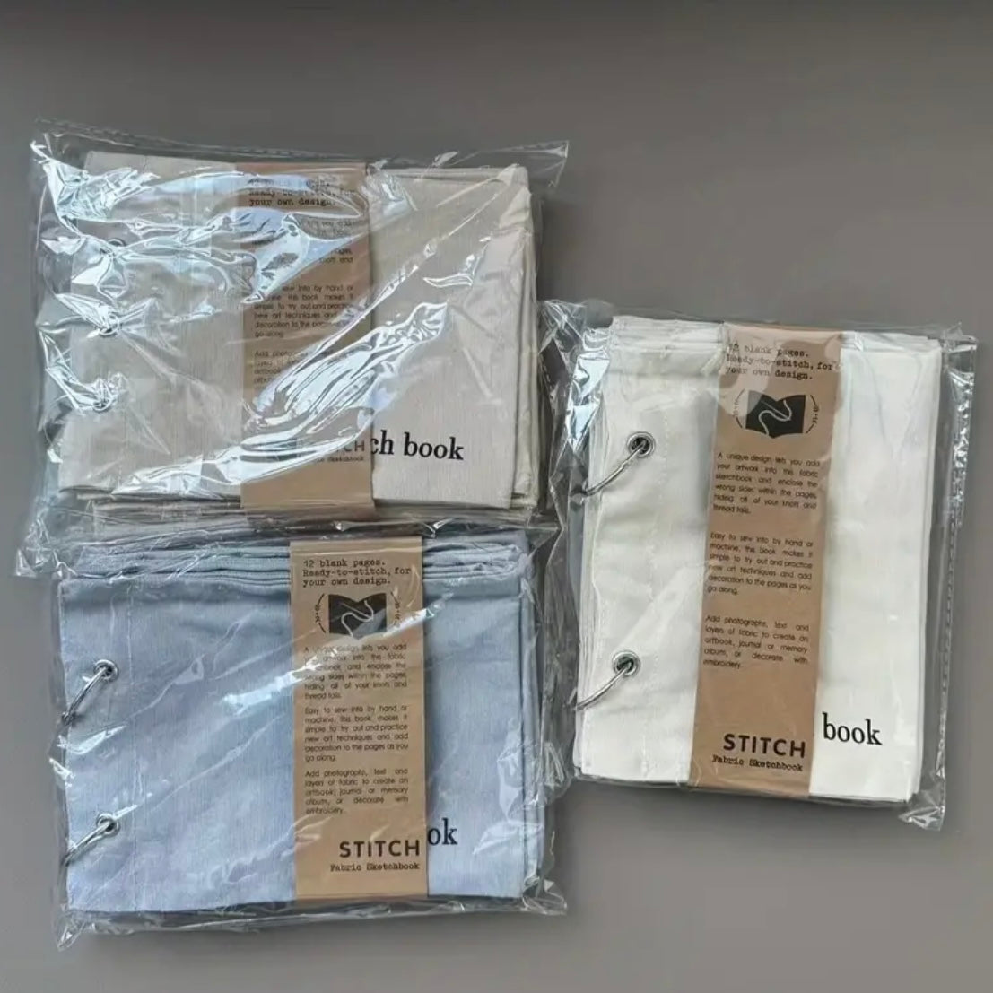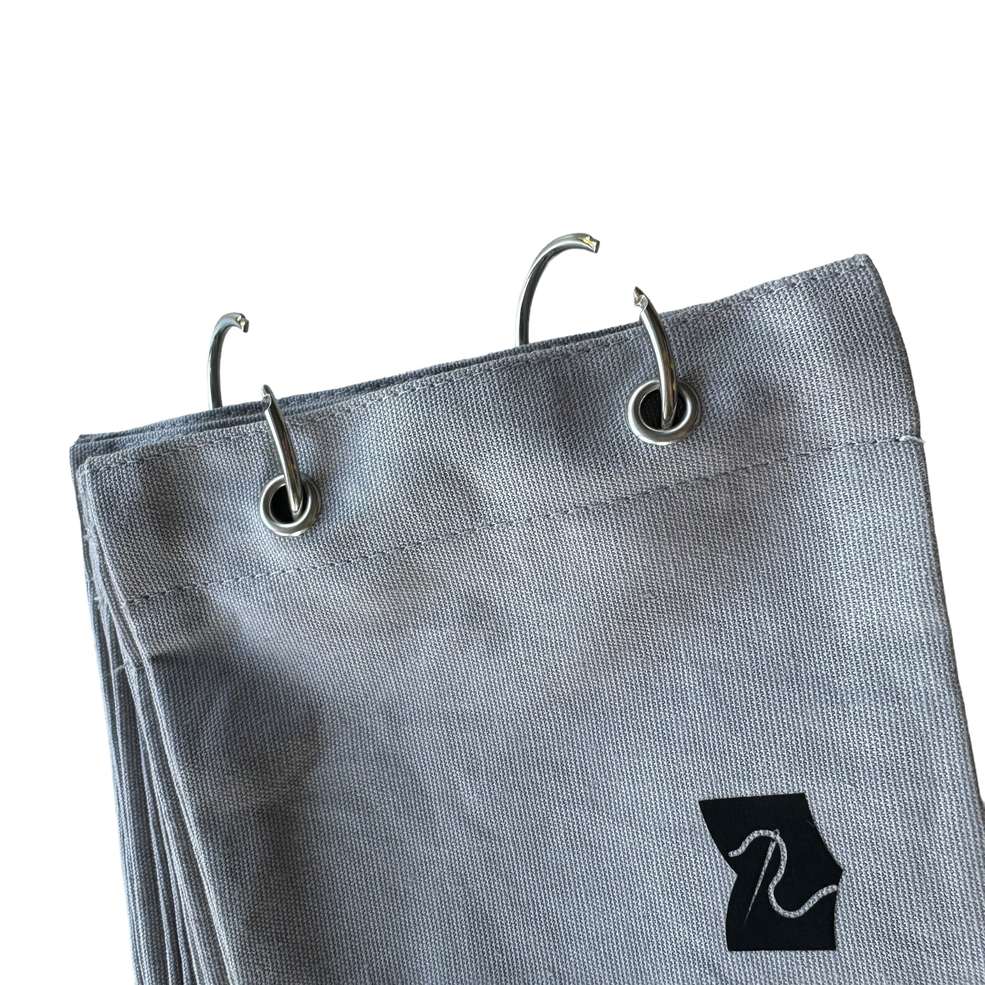 Image DescriptionFabric sketchbook with a plain grey cloth cover, secured with two metal binder rings. Inside are blank fabric pages ready for embroidery, stitching, or decoration.
