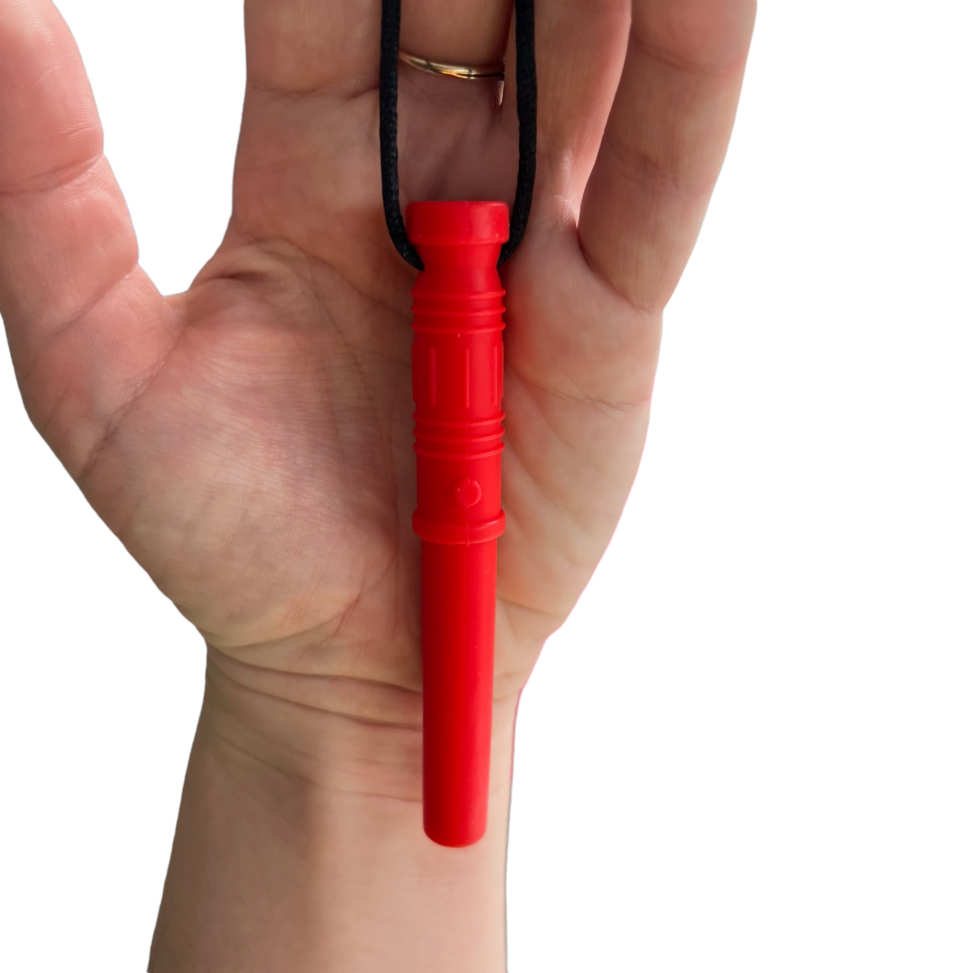 Our brightly coloured Tee thing Sensory Necklaces can help to support your or your loved ones essential sensory needs with this hardy but fine looking chew and fidget necklace. Perfect for baby, toddlers and kids, this necklace can be worn by a parent as a great distraction for while carrying your little one. It can also be worn by a child, young person, as well as an adult to help support their own sensory needs and fidgets as well as helps to support and relieve anxiety. It’s not only functional, it looks great on, and comes in a range of 6 fun bold colours to chose from as well!