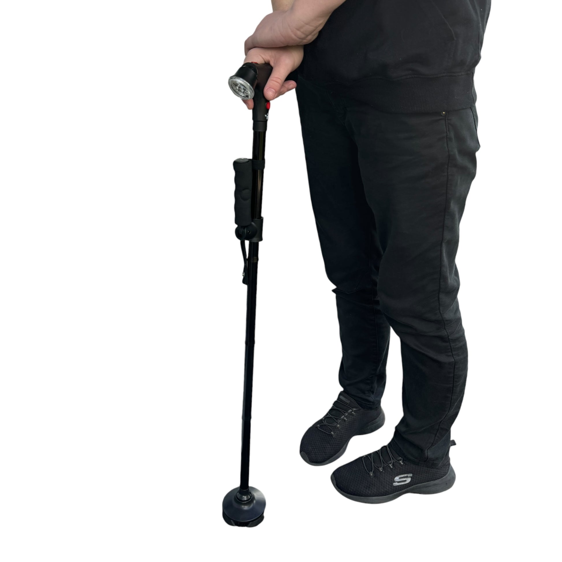 Made with aluminium & ABS plastic, this walking stick is a good quality, easy to use, stable and supportive walking stick with its 4-feet stand alone base 360° rotated base with anti skid is fit for types of walking paths. With its LED light to light your path, it’s alarm to keep you feeling safe and secure, it’s additional fold up handle to make getting up easier, AND it’s 5 levels of adjustment at the click of a button — this stick is made for ease + convenience at it’s finest!