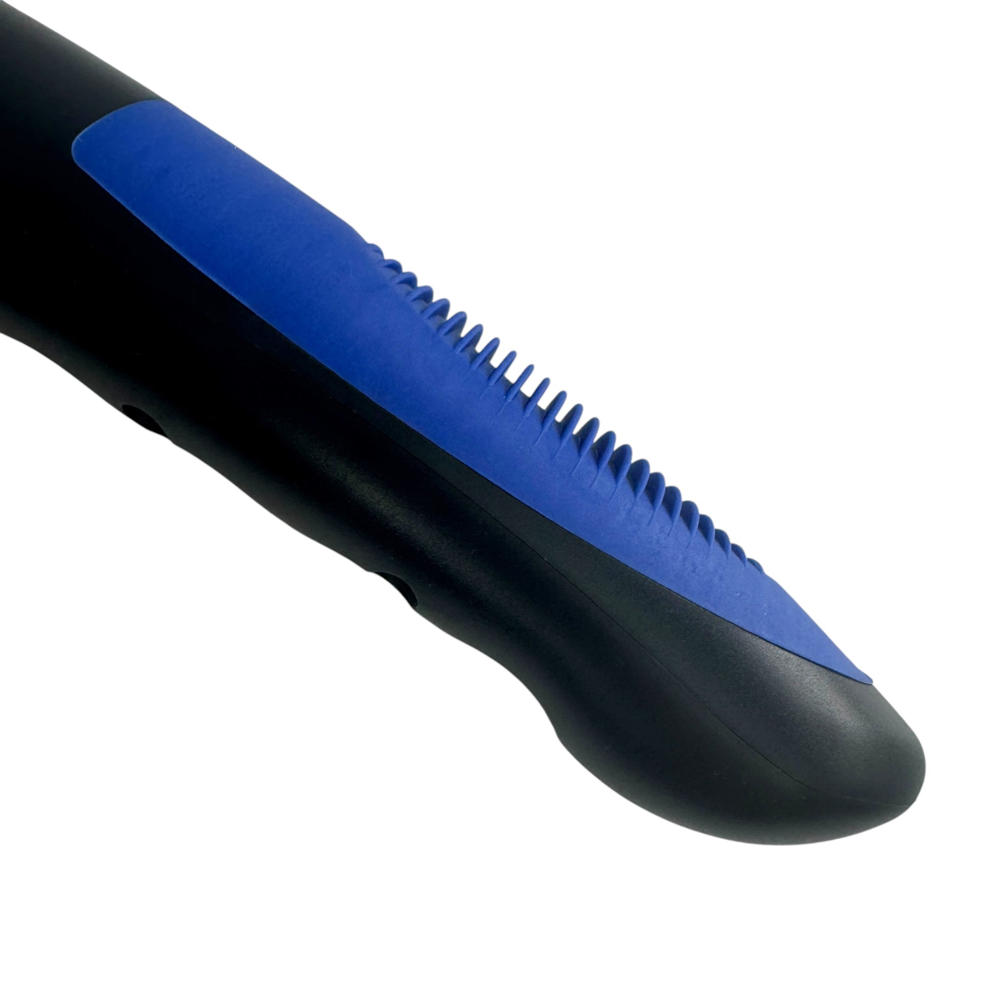 Image Description: A compact car assist handle with a black and blue ergonomic grip and a durable metal tip. The tool has a sleek, practical design, with the metal end shaped to fit securely into the car door latch. The image highlights the built-in safety features, including a seatbelt cutter and glass breaker, adding versatility to its primary function.