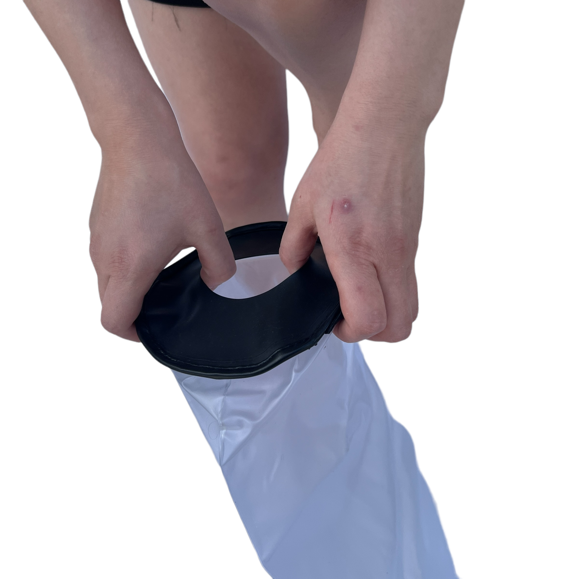 One size fits most, stretch the silicone cuff over your legs cast or wound site, to above or below the knee. Create a stronger seal around your leg cover by placing a finger between the seal and your leg to burp and squeeze out any extra air, adding extra security.