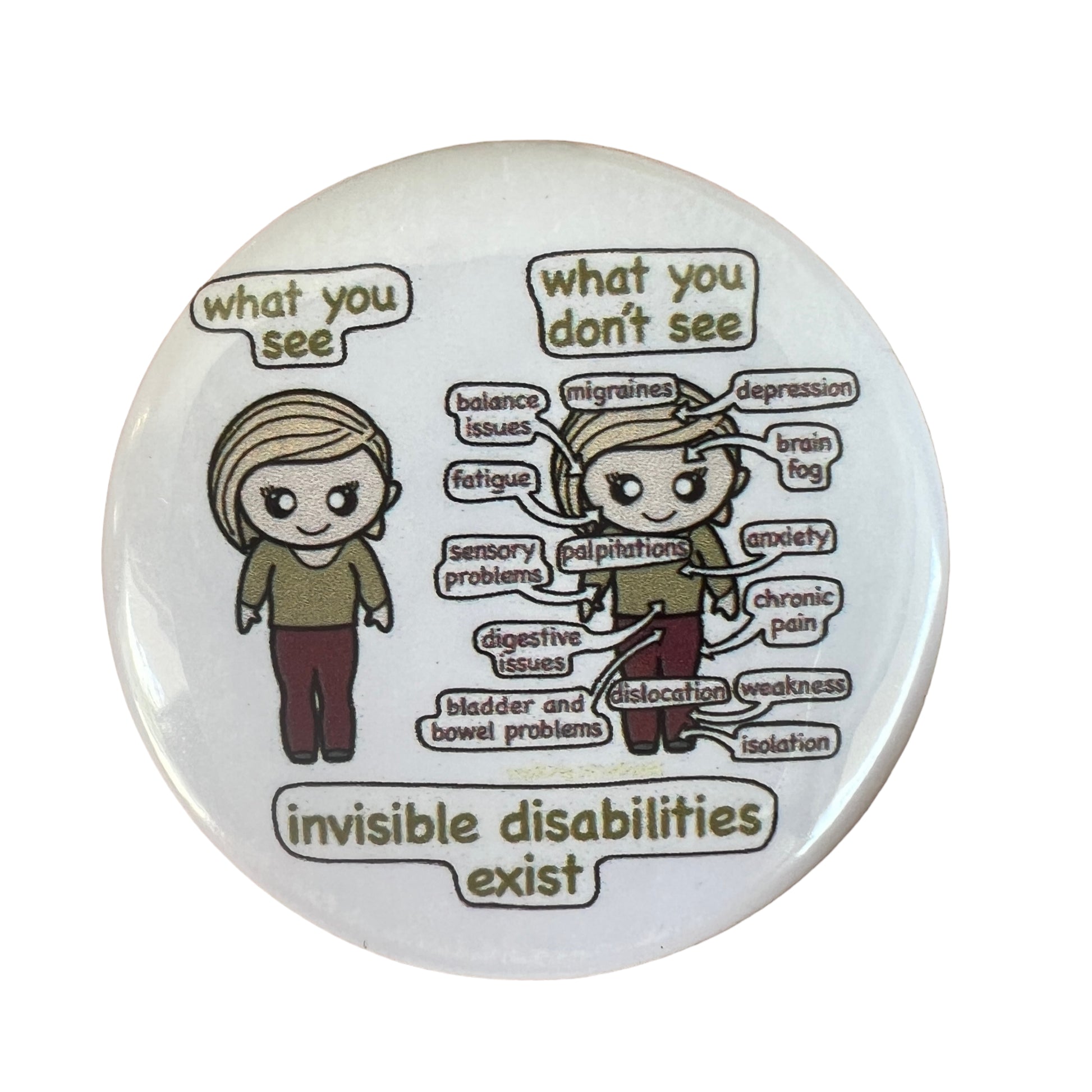 Image Description: Button pin depicts 2 characters standing side by side. Along the bottom of the pin it says: “invisible conditions exist”. The words above the head of the character on the left says “what you see”, as they stands on their own. And the words for the character on the right that says “what you don’t see”. surrounding their character is also the words that say: chronic fatigue, balance issues, migraines, sensory problems, digestive issues, bladder and bowel issues, dislocation, isolation, weakness, chronic pain, anxiety, brain fog, depression, palpitations. Helping depict that what you see isn’t always the full story, and that just because someone looks fine, doesn’t mean they are.
